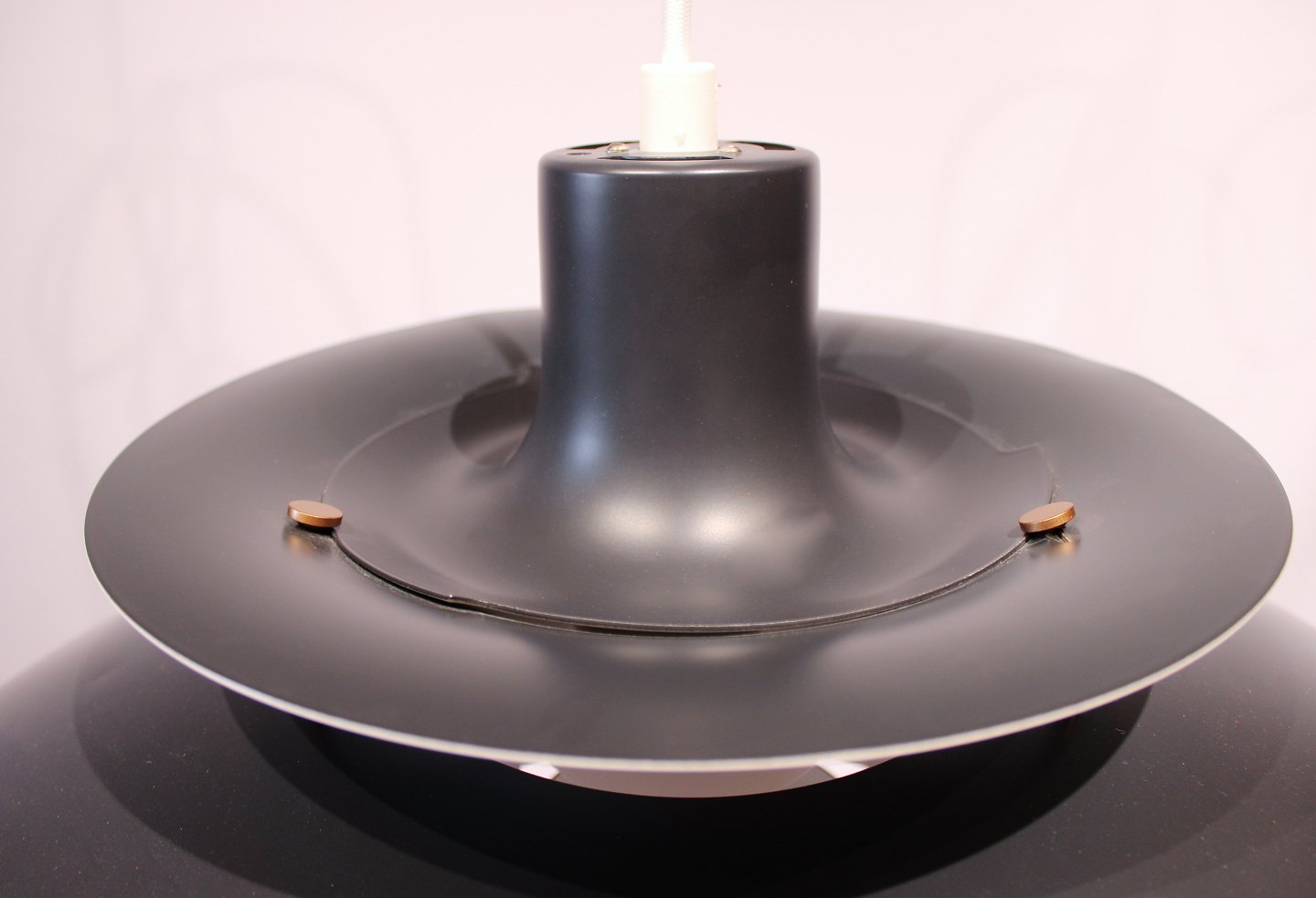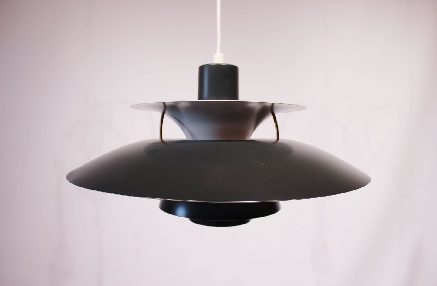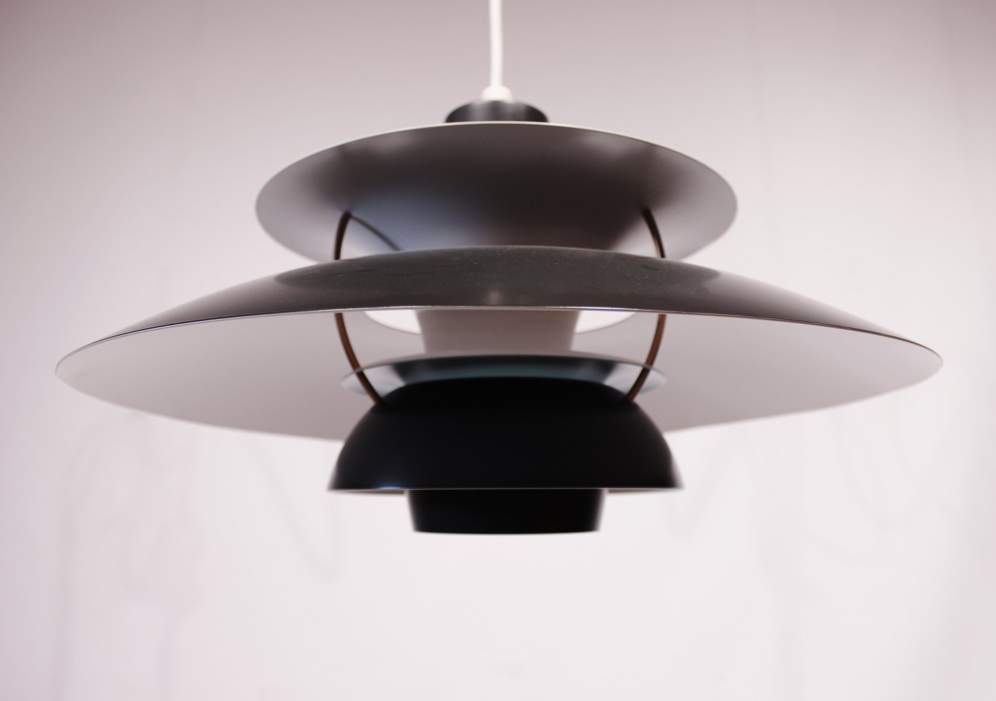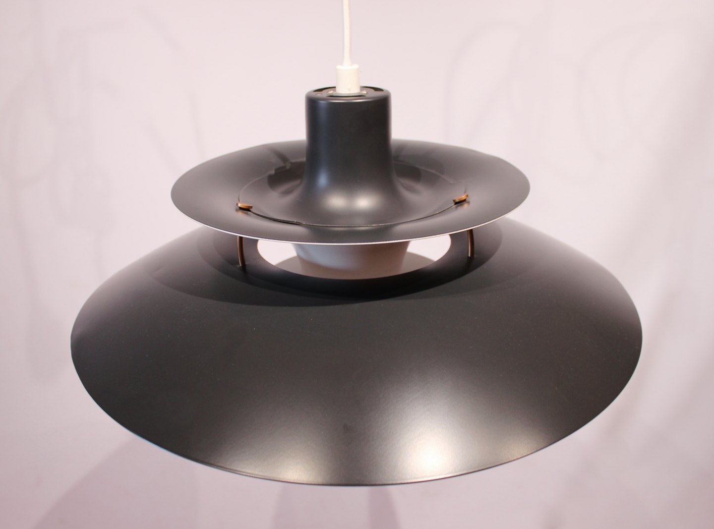 PH5 pendant designed by Poul Henningsen in 1958 and manufactured by Louis Poulsen. The pendant has dark grey lacquered metal Shades.