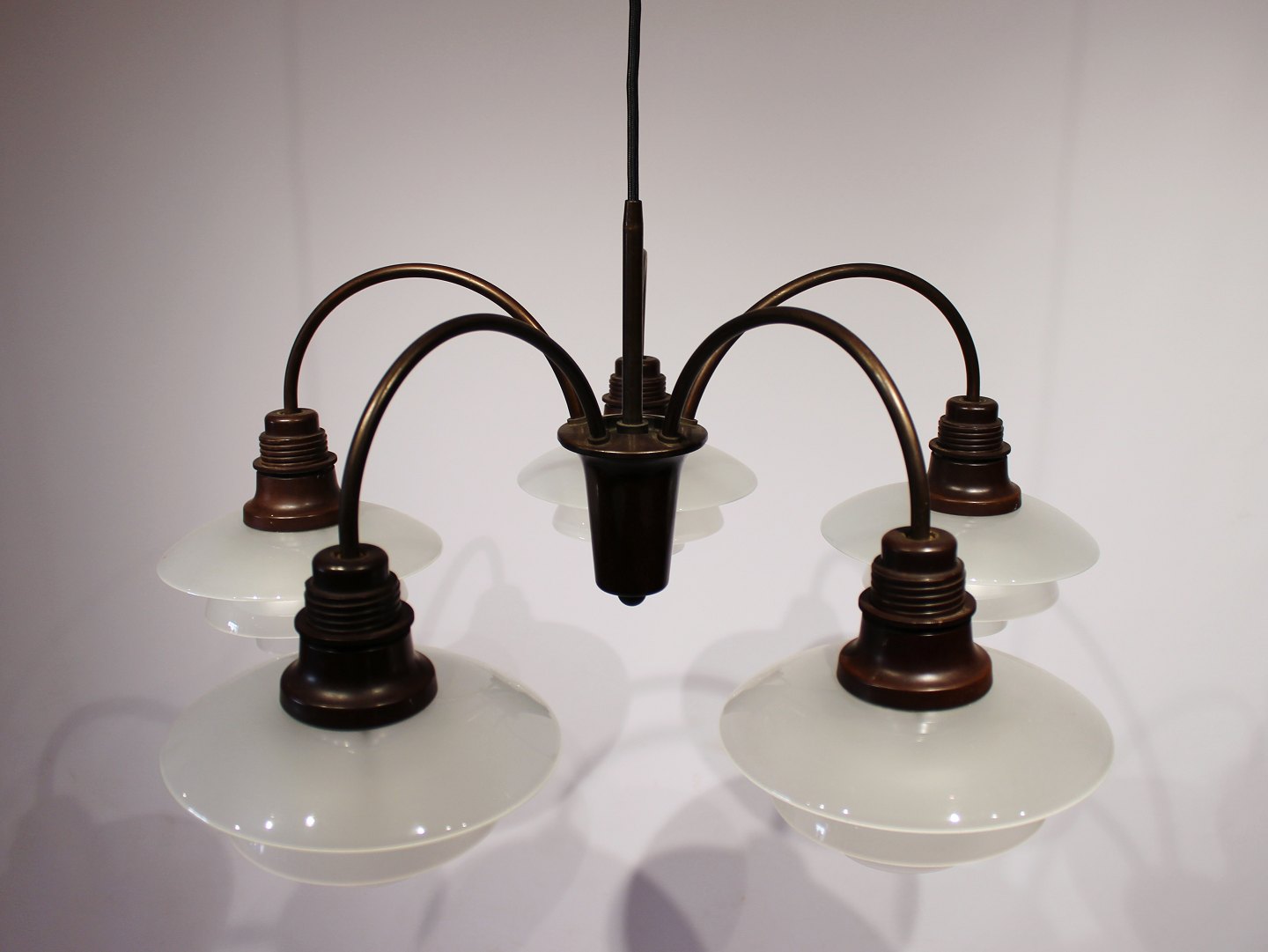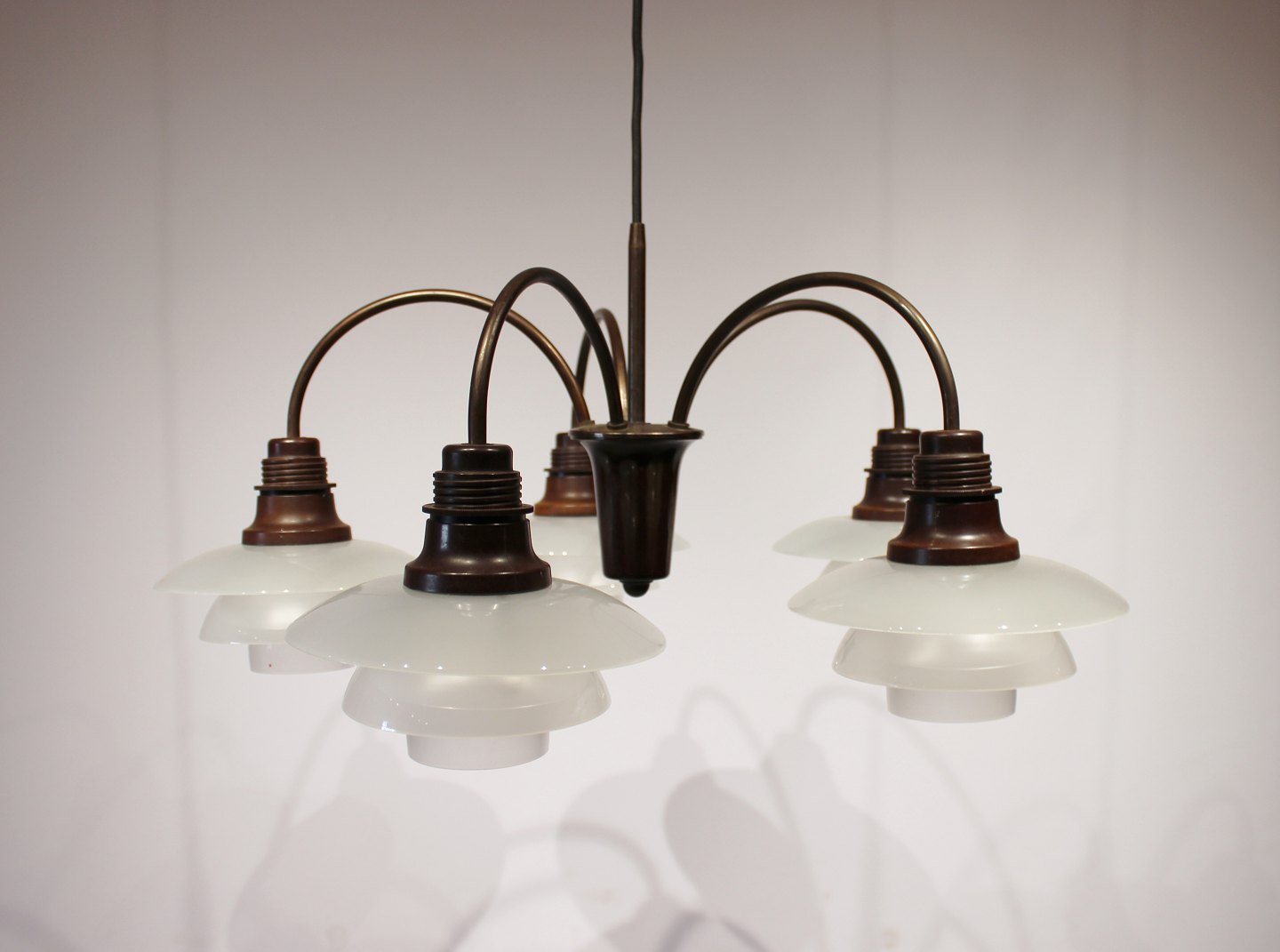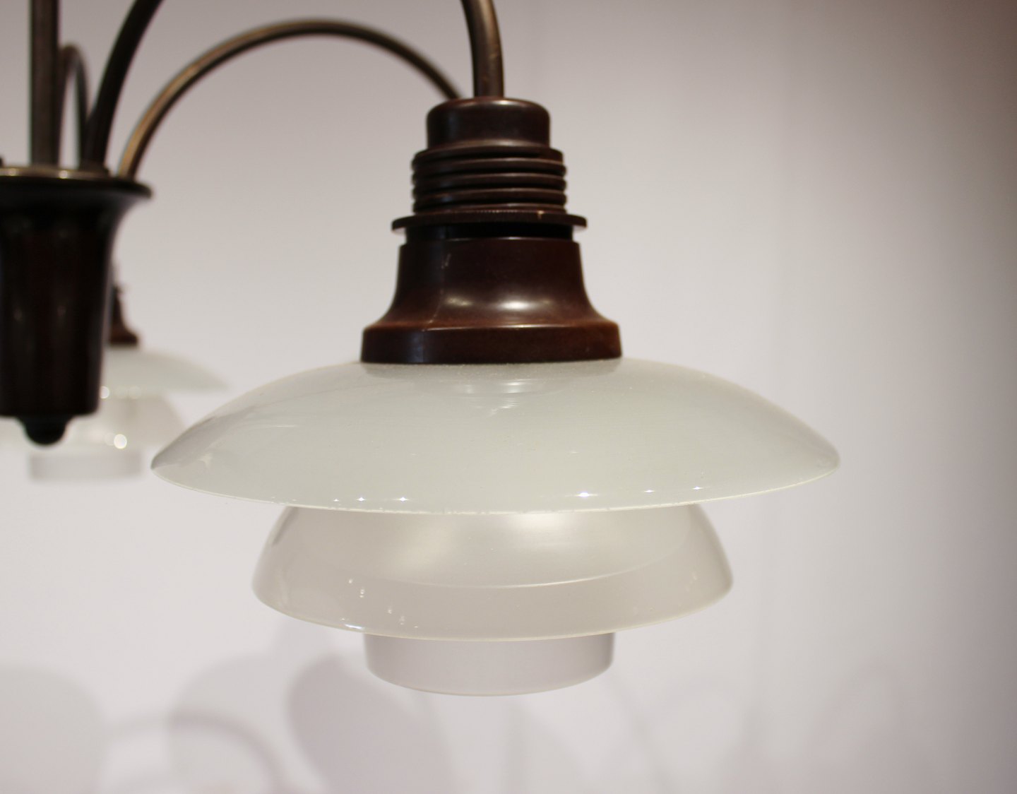 Cascade chandelier in burnished brass and shades of matt glass by Poul Henningsen and Louis Poulsen, from the 1930s.