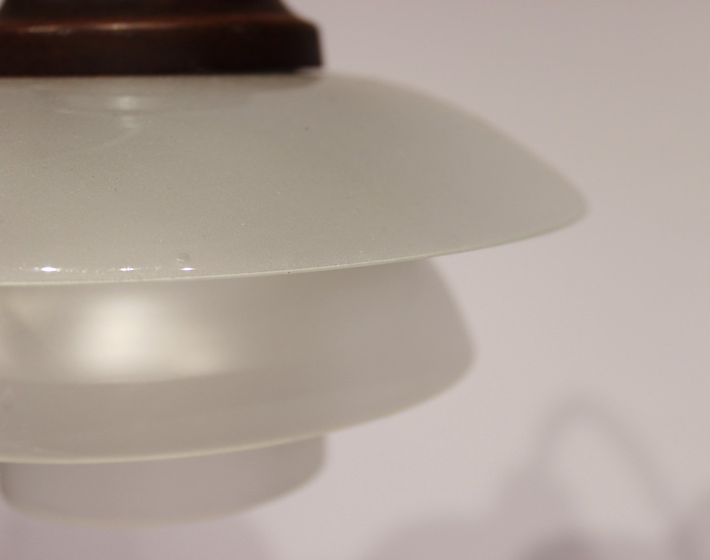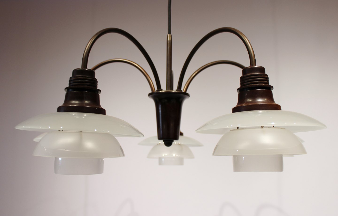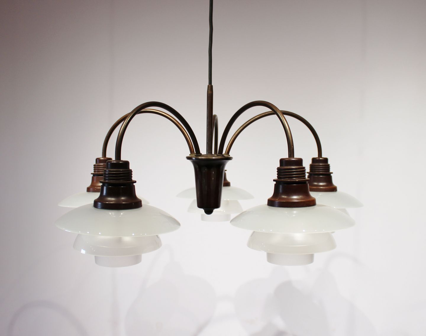 Cascade chandelier in burnished brass and shades of matt glass by Poul Henningsen and Louis Poulsen, from the 1930s.