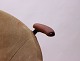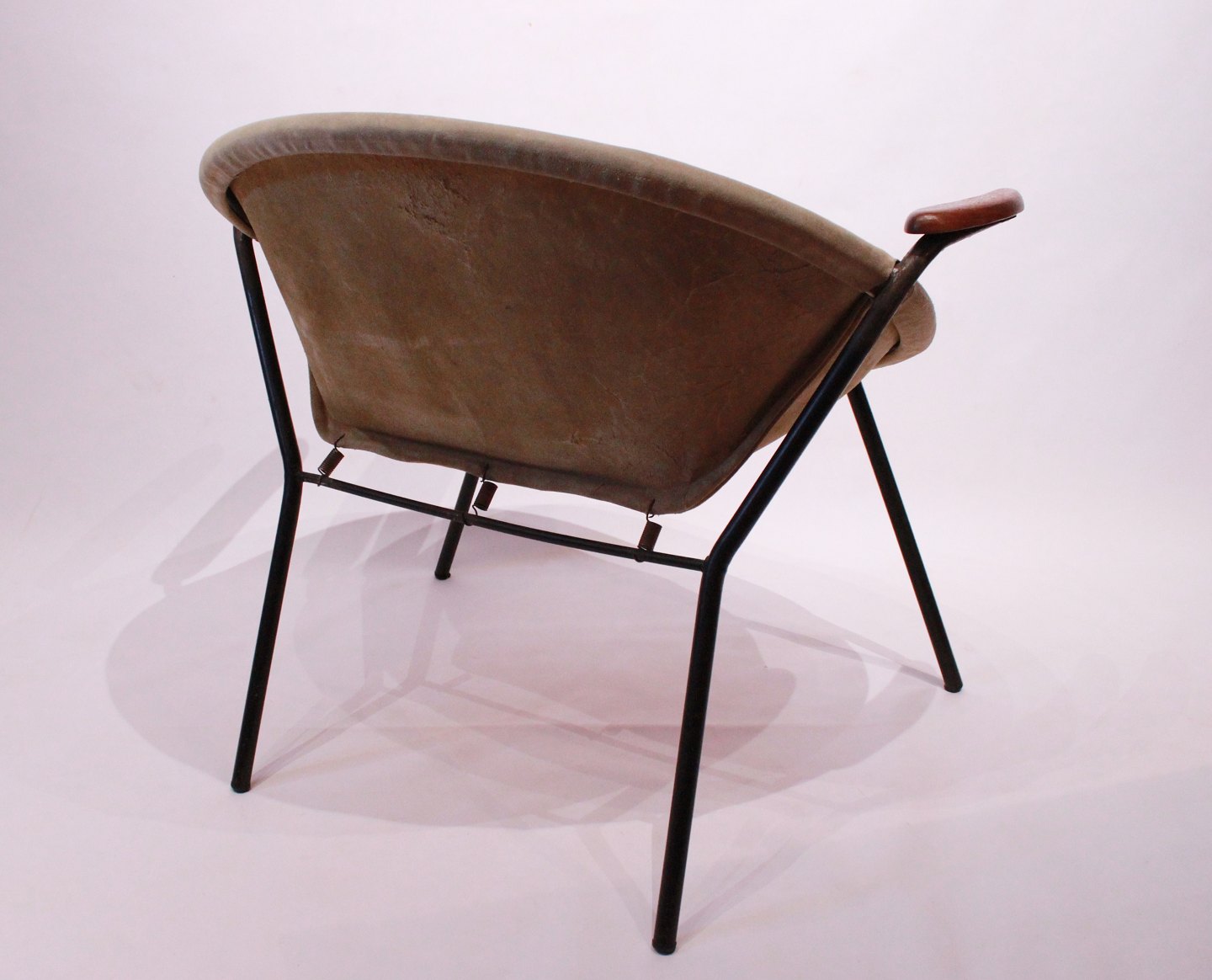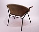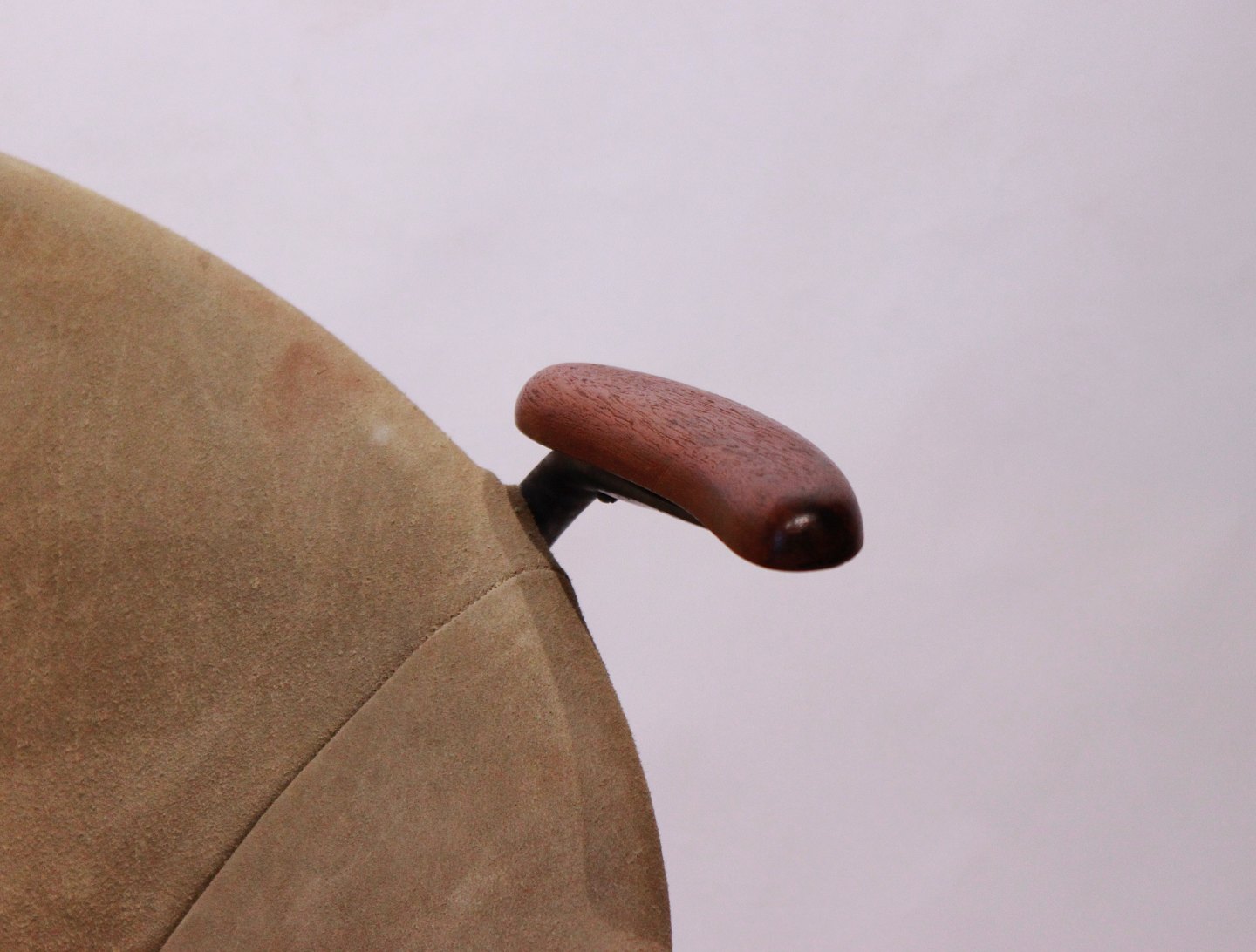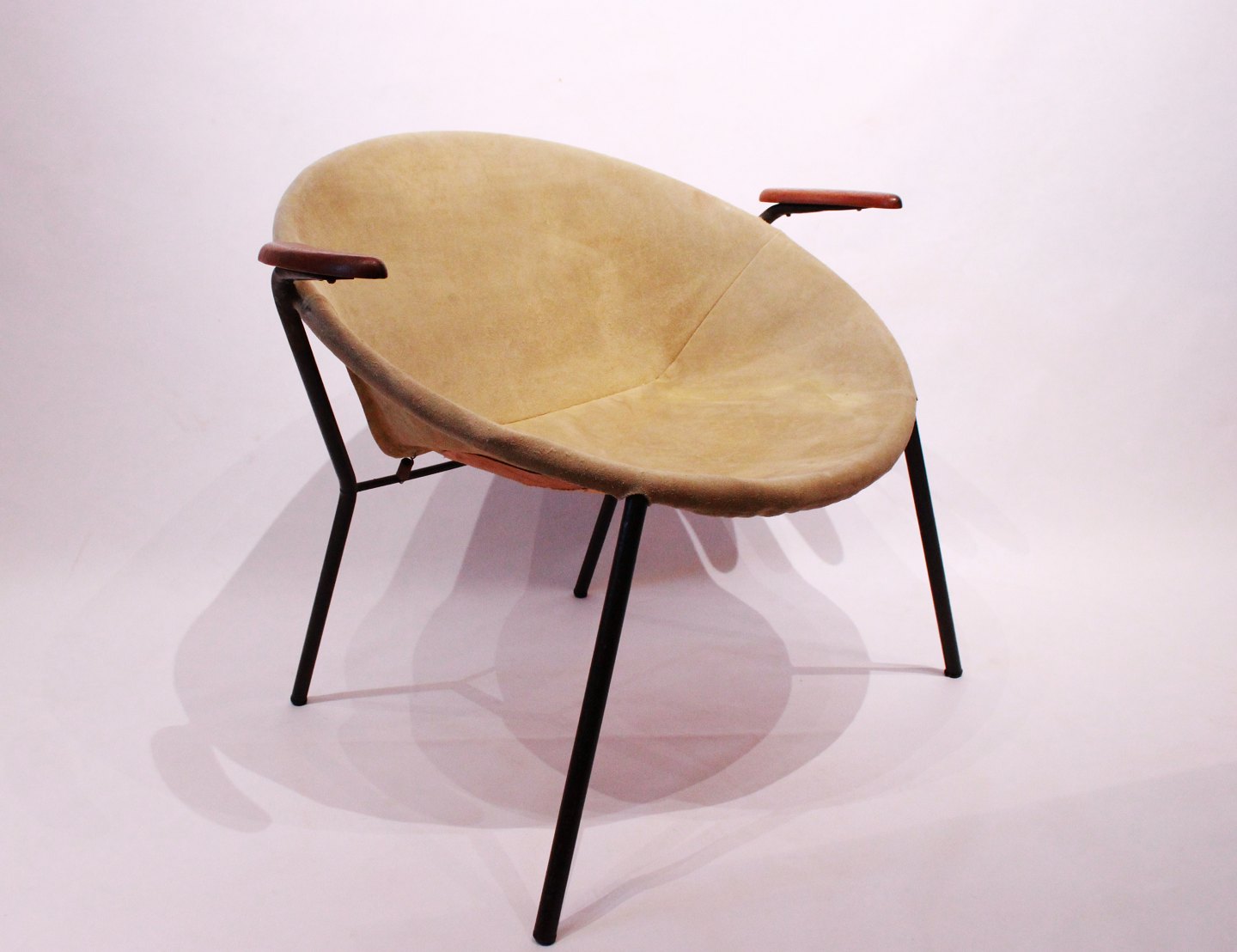 SolgtBallonstolen i patineret lyst ruskind, teak og sortmalet metal designet af Hans Olsen og fremstillet af Lea Design i 1960erne.