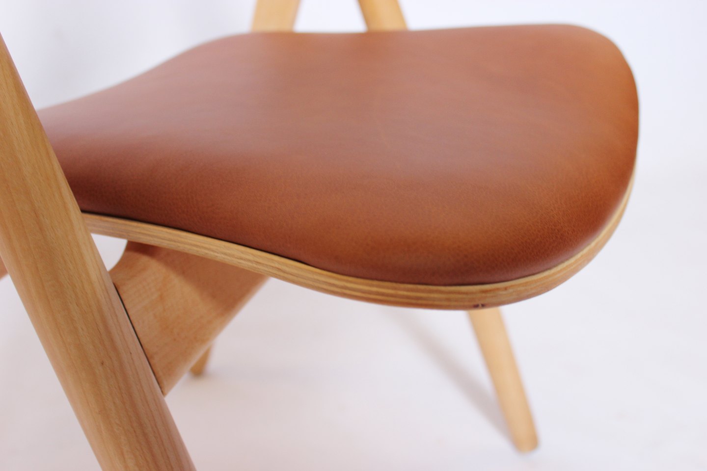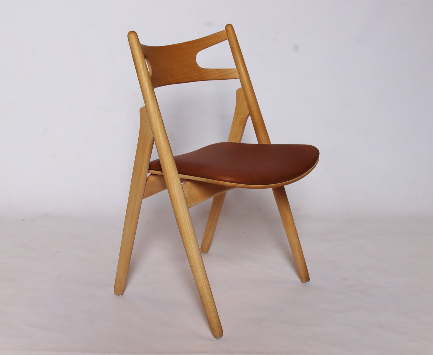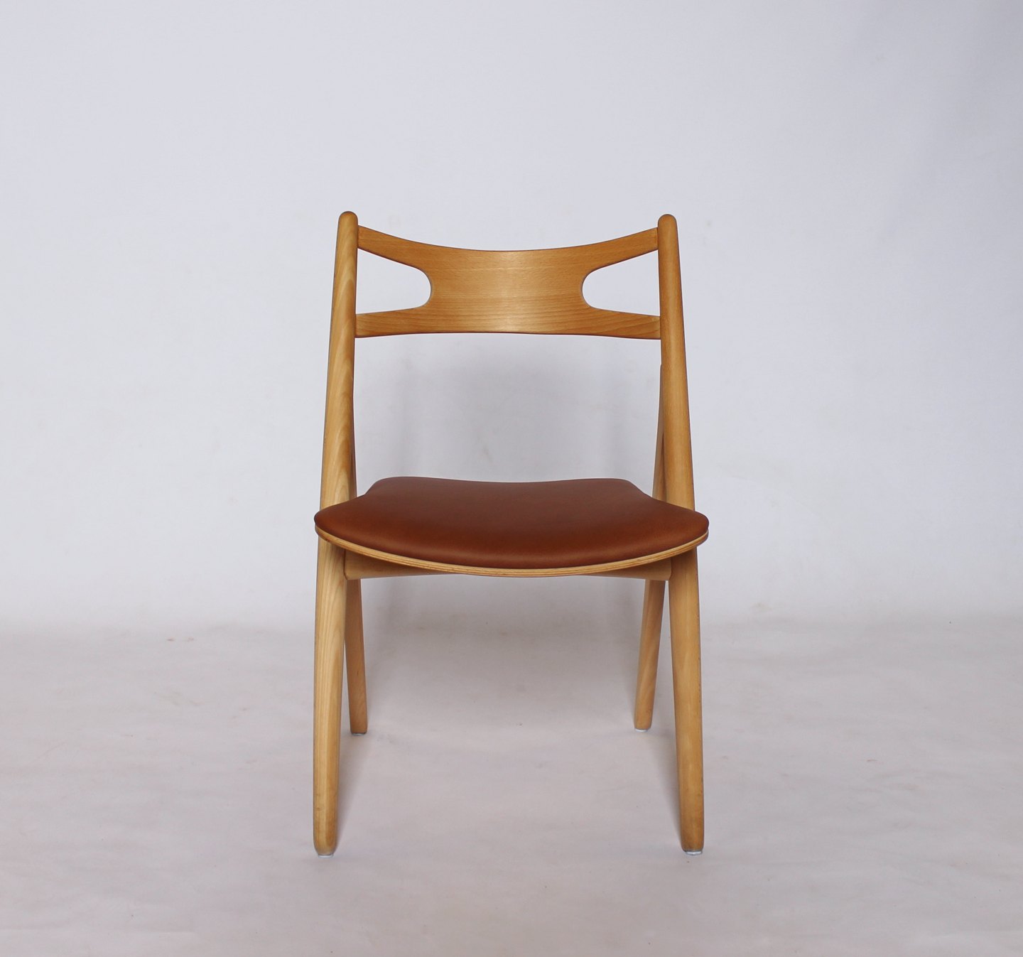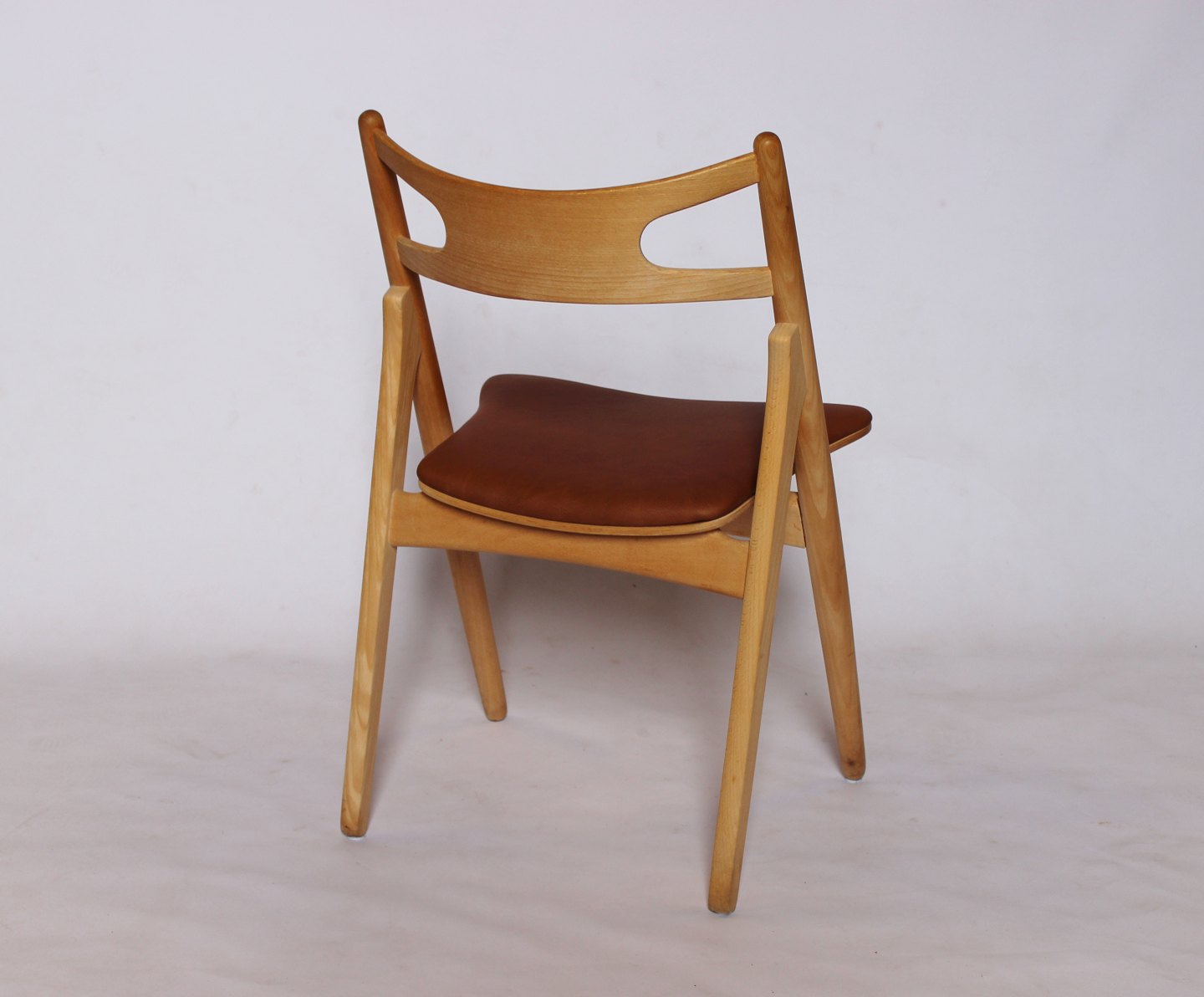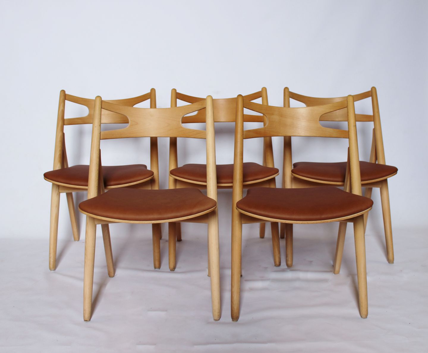 Et sæt af 5 Savbuk stole, model CH29, designet af Hans J. Wegner i 1952 og fremstillet af Carl Hansen & Søn i 1970erne. Stolene er af sæbebehandlet bøg og med sæder af cognac elegance læder.