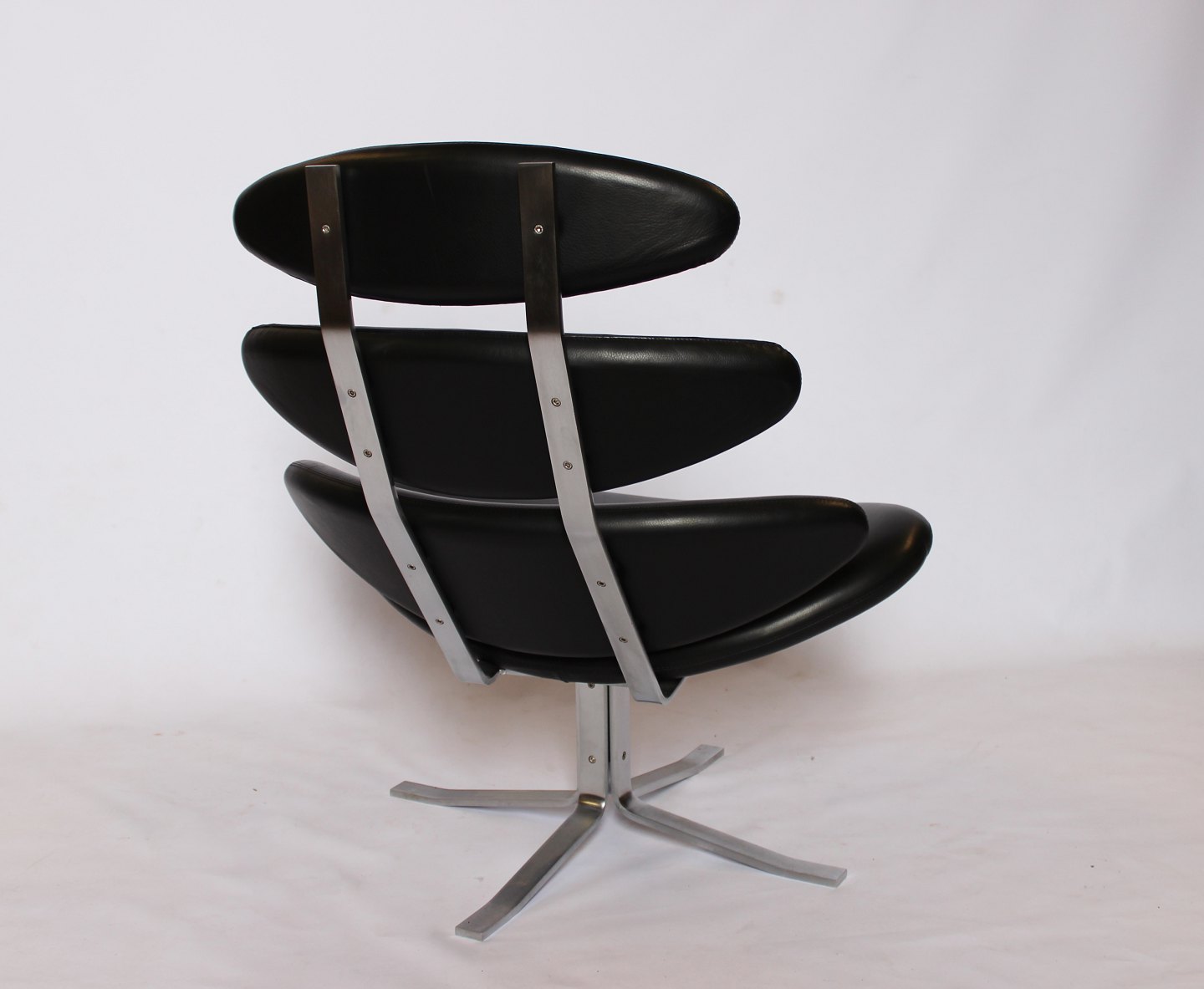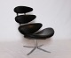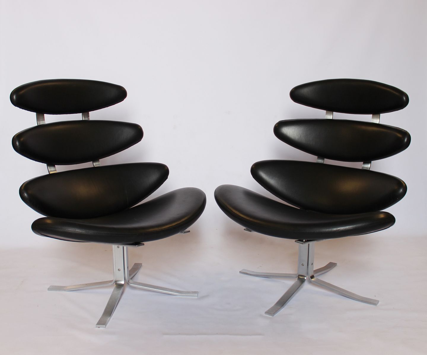 SolgtSæt af to Corona hvilestole, model EJ 5, designet af Poul M. Volther i 1964 og fremstillet hos Erik Jørgensen i 1980erne. Stolen er polstret i sort Cava læder.