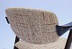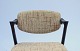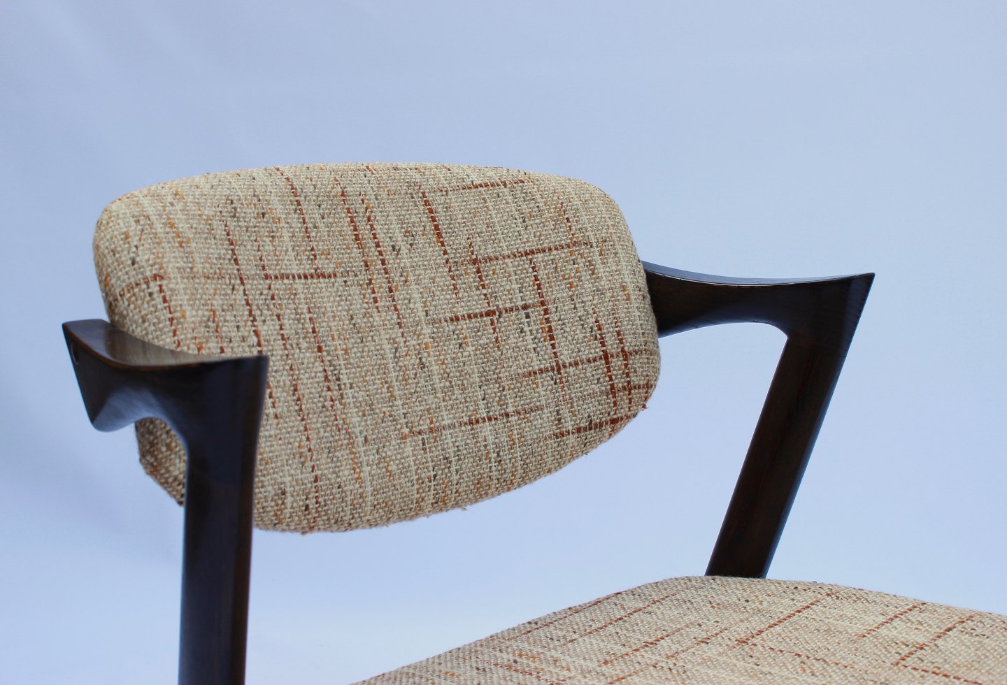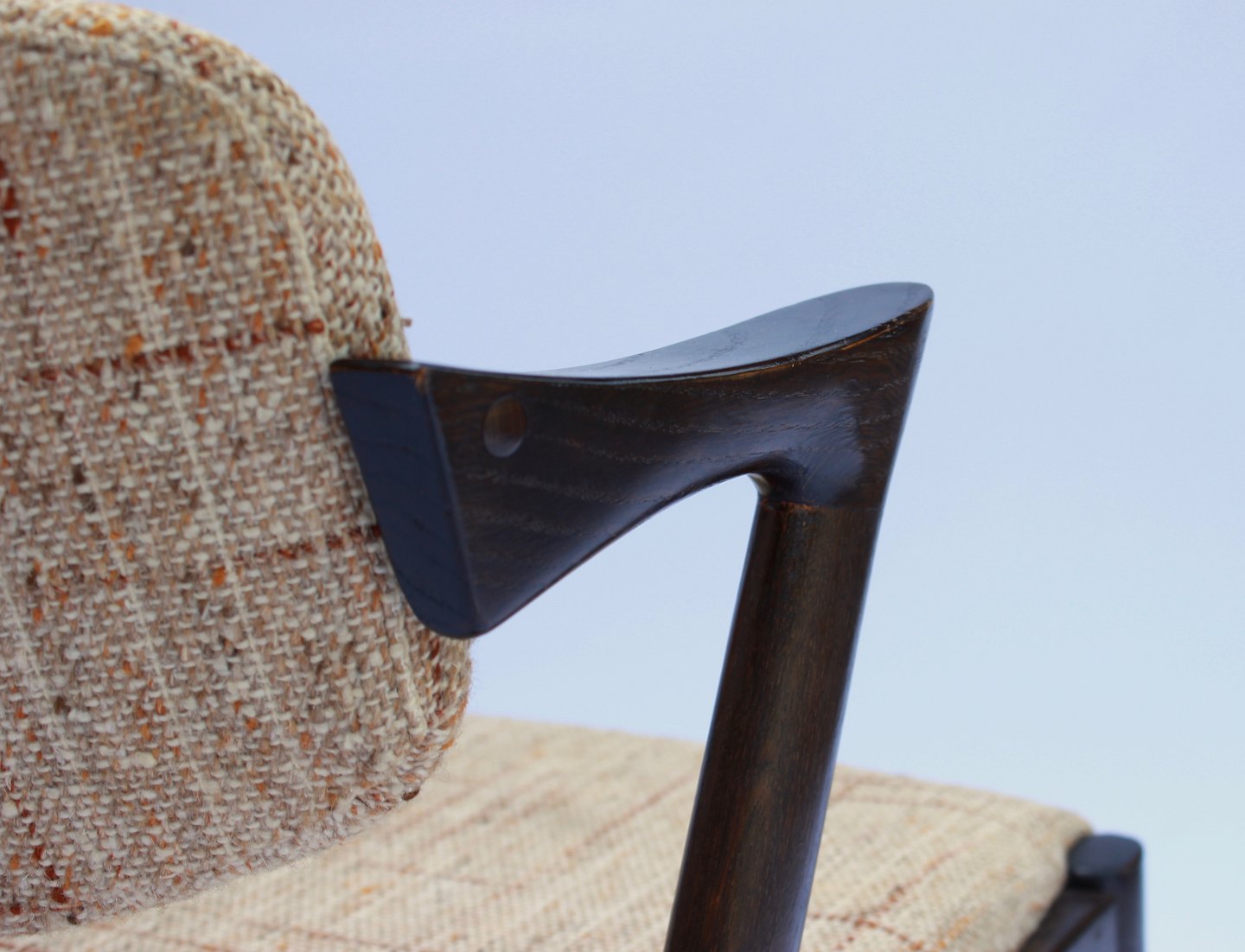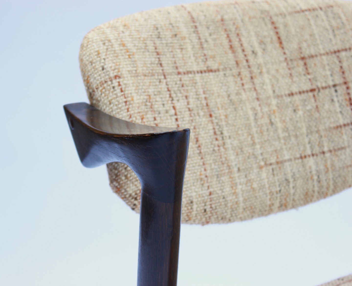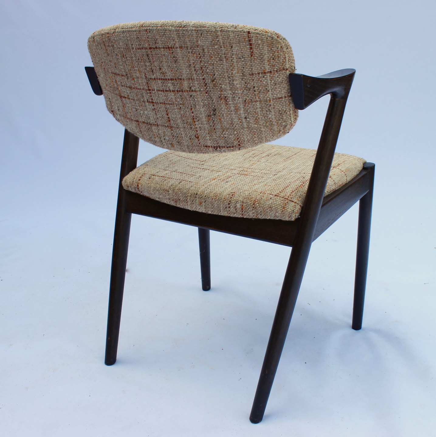 A dining chair, model 42, designed by Kai Kristiansen and manufactured by Schou Andersen in the 1960s. The chair is of dark oak and upholstered in light wool fabric.