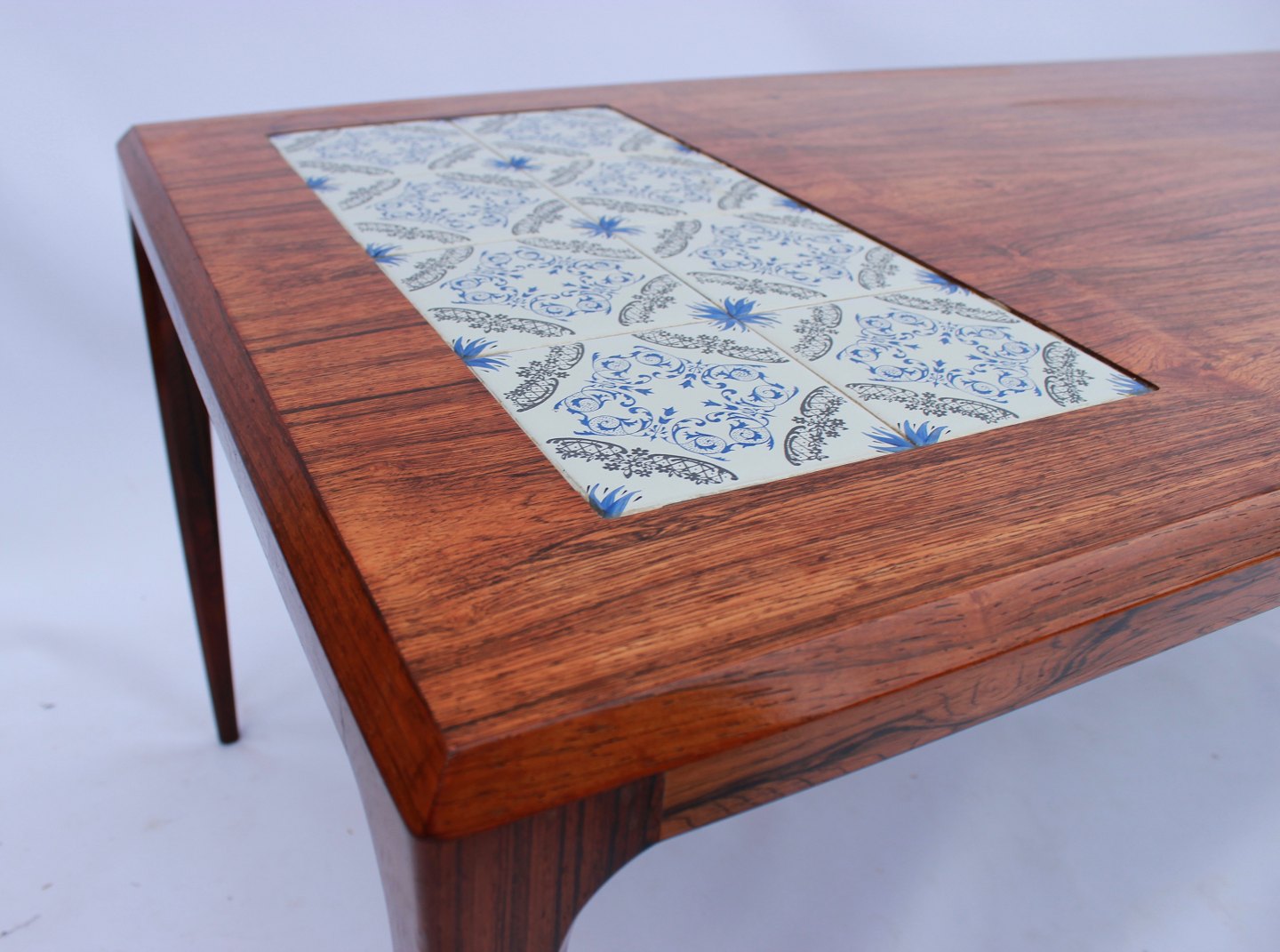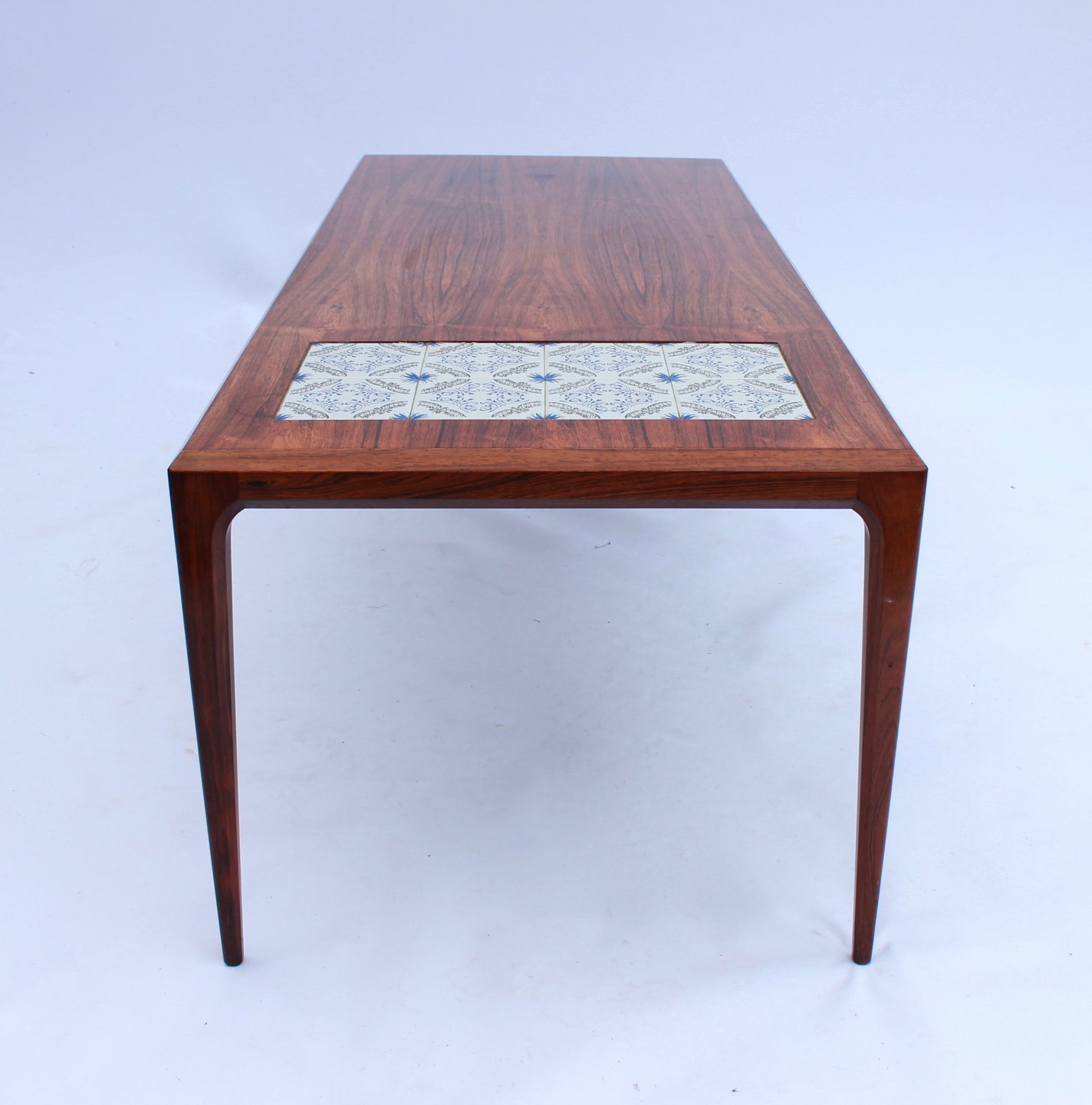 SoldCoffee table in rosewood with Royal Copenhagen tiles designed by Johannes Andersen and manufactured by Silkeborg Furniture factory in the 1960s. The table is in great vintage condition.