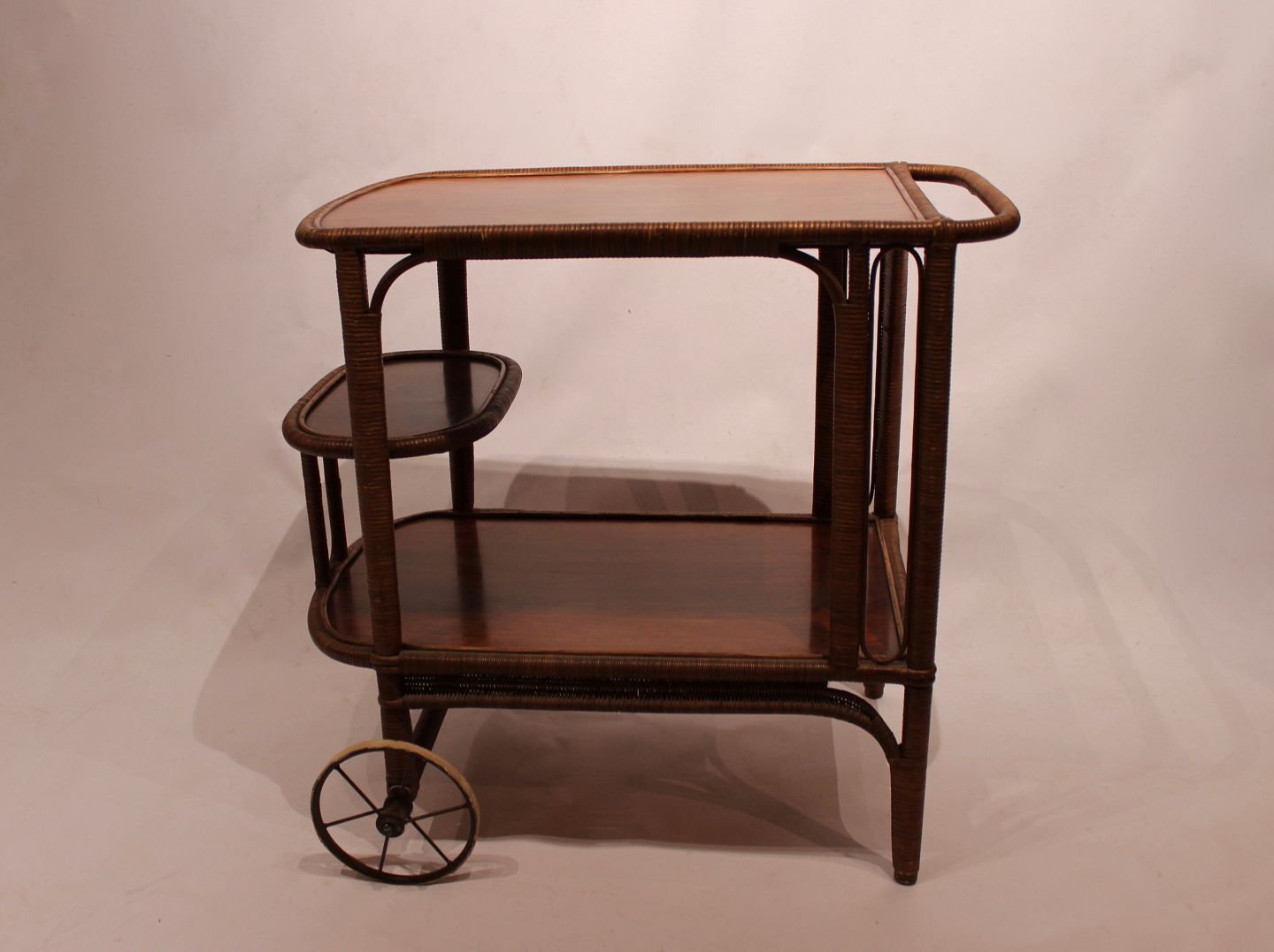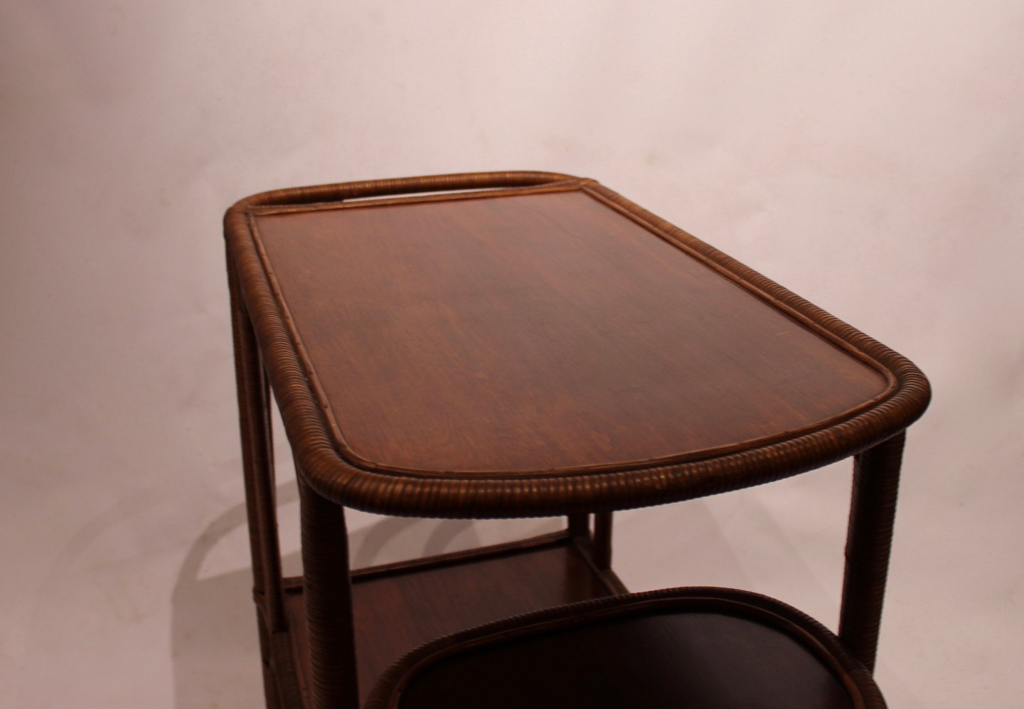 Antique french bar table of papercord and dark wood from around the 1920s.