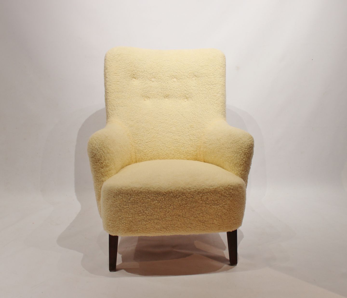 SoldEasy chair upholstered with sheep wool and legs of mahogany from the 1940s. The chair is in great vintage condition.