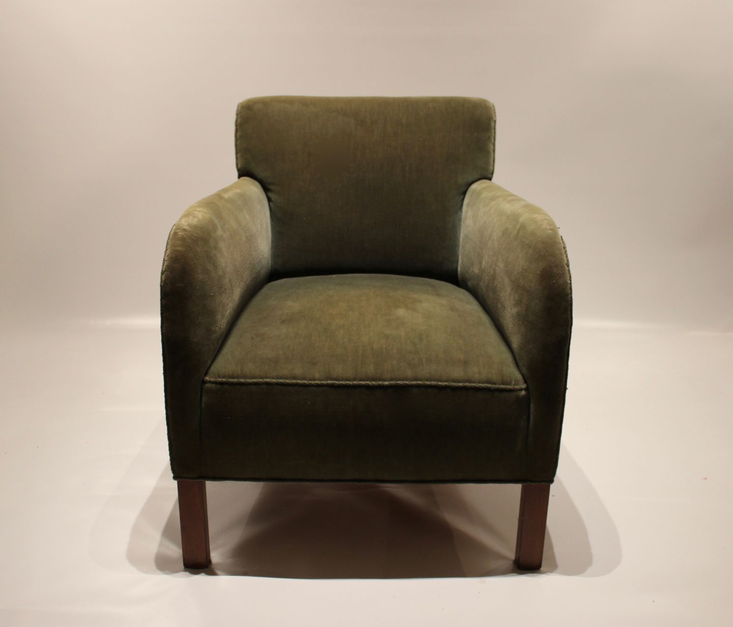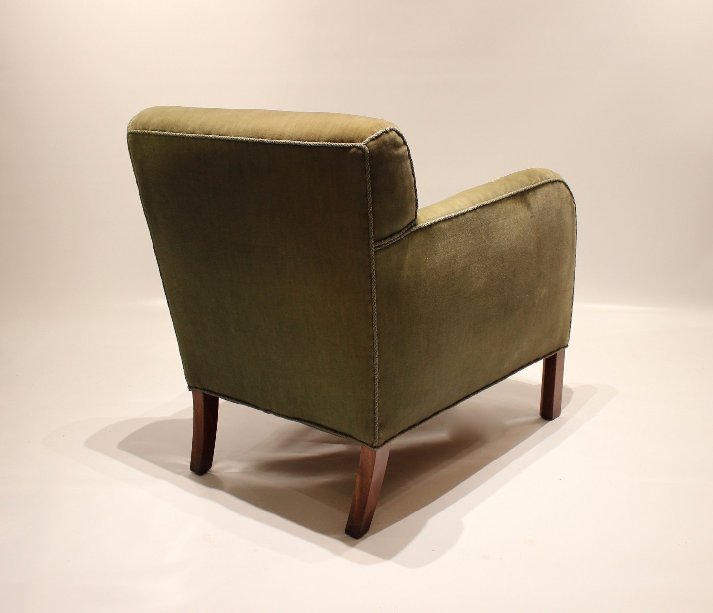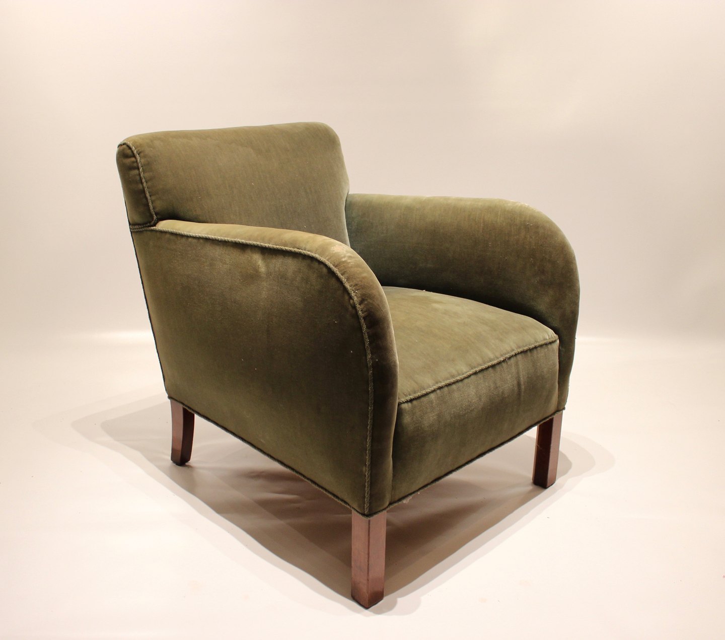 SolgtLænestol polstret i grønt stof af dansk design fra 1960erne. Stolen er i flot brugt stand.