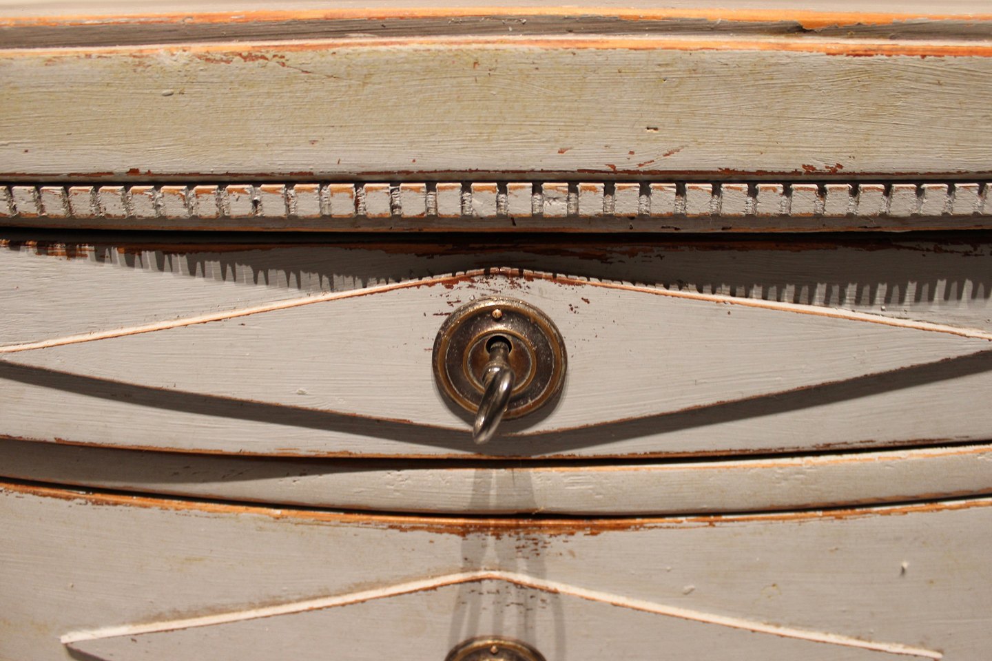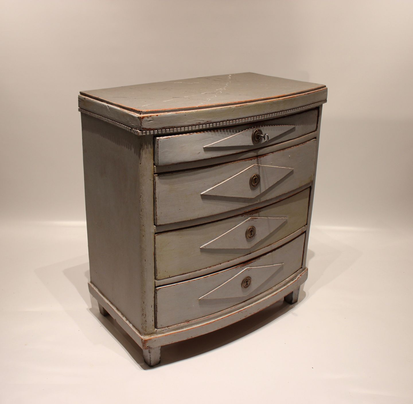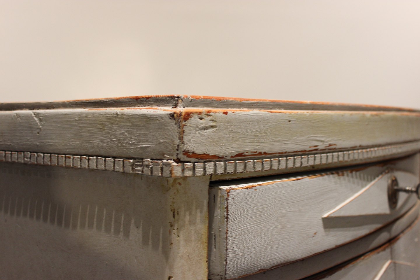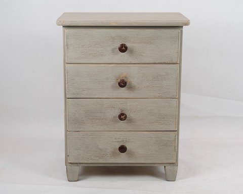 Gustaviansk gråmalet kommode med buet front og marmoreret topplade fra 1830erne.