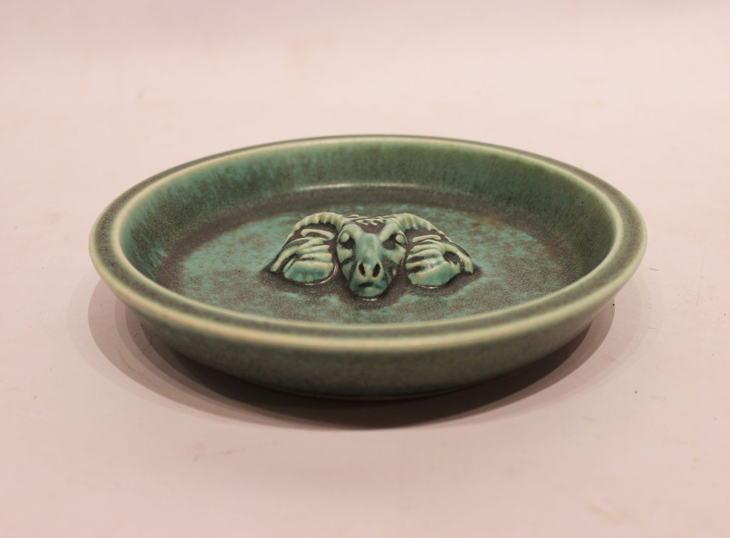 SolgtKeramik fad i grønne og turkise farver med vædder motiv af Hugo Liisberg for Saxbo.