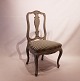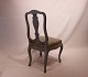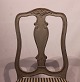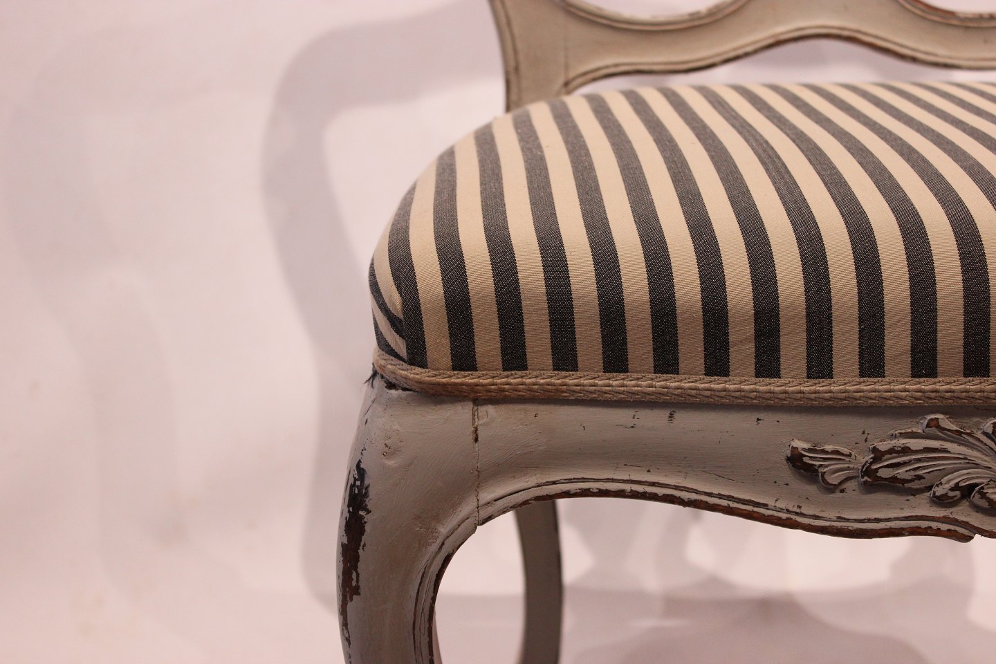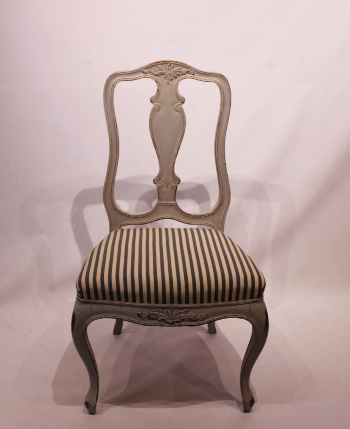SolgtEt sæt af fire gråmalede spisestuestole i stilen Rokoko fra 1860erne. Stolene er i flot brugt stand med stribet polstring.
