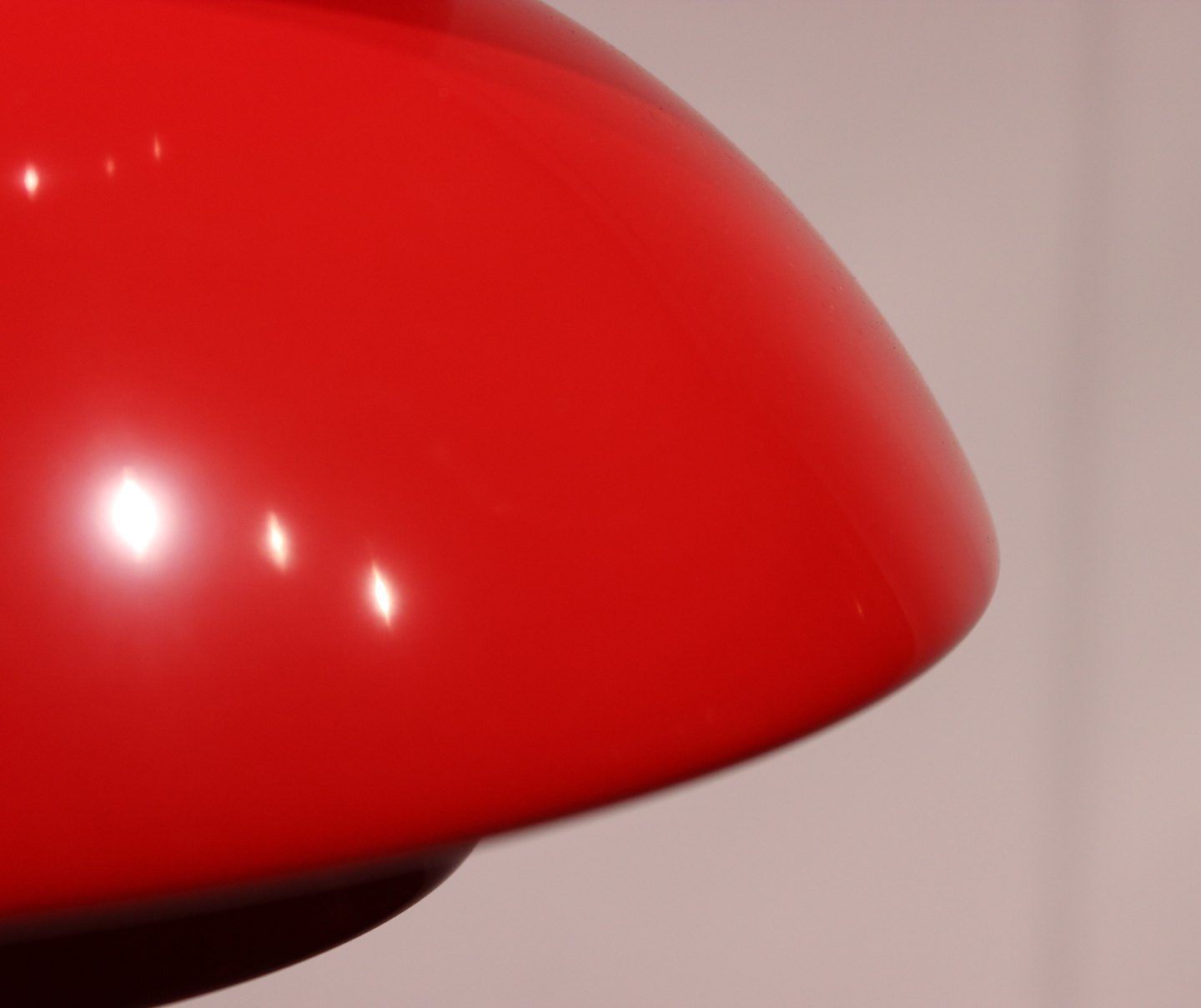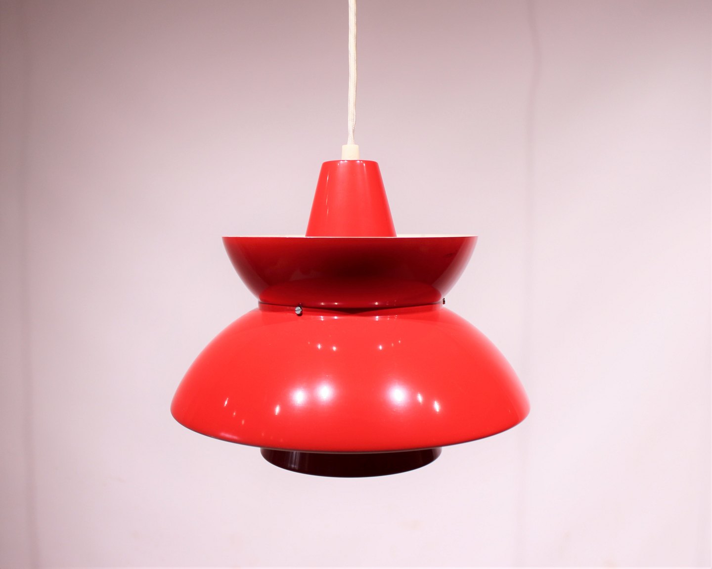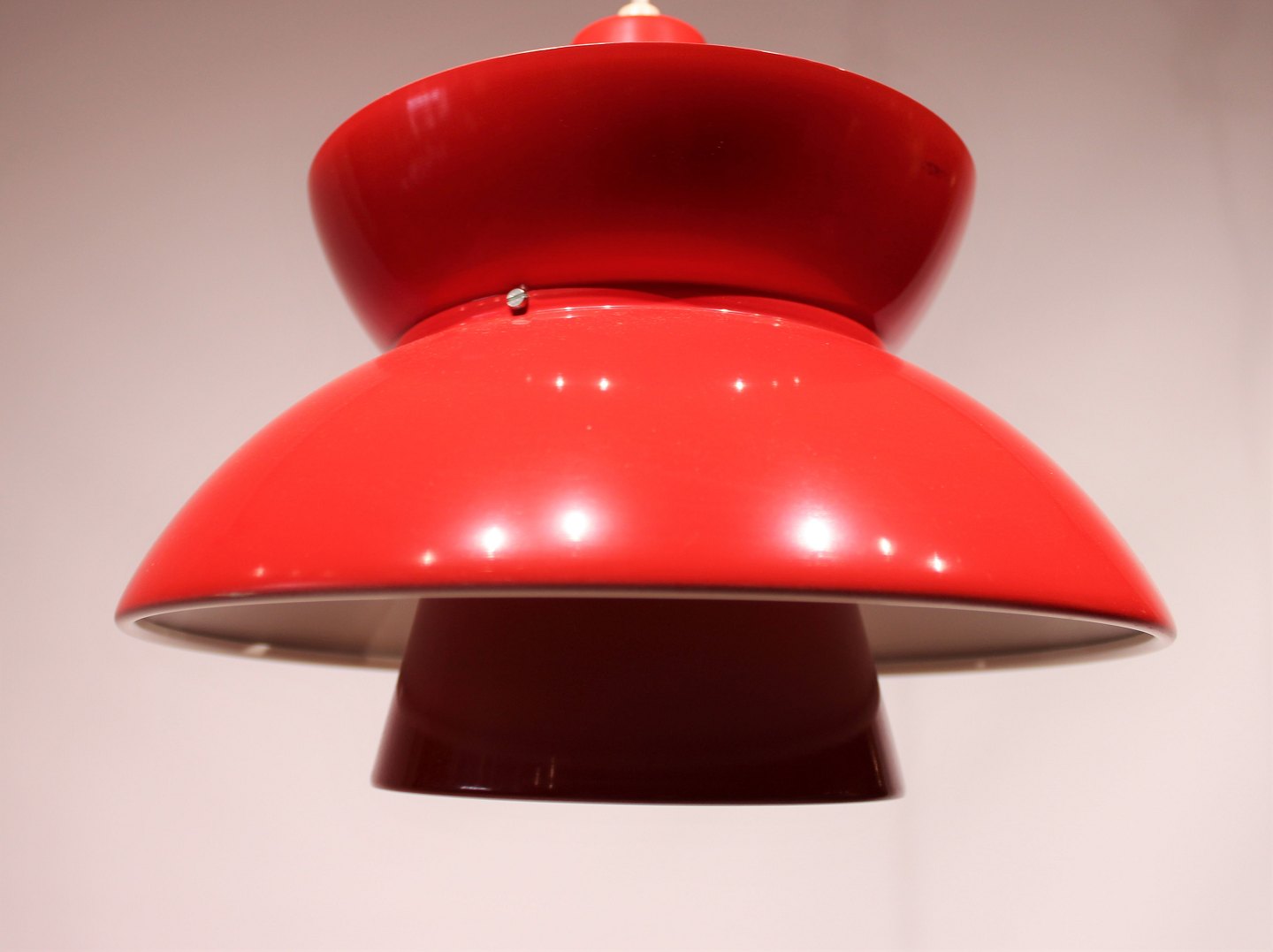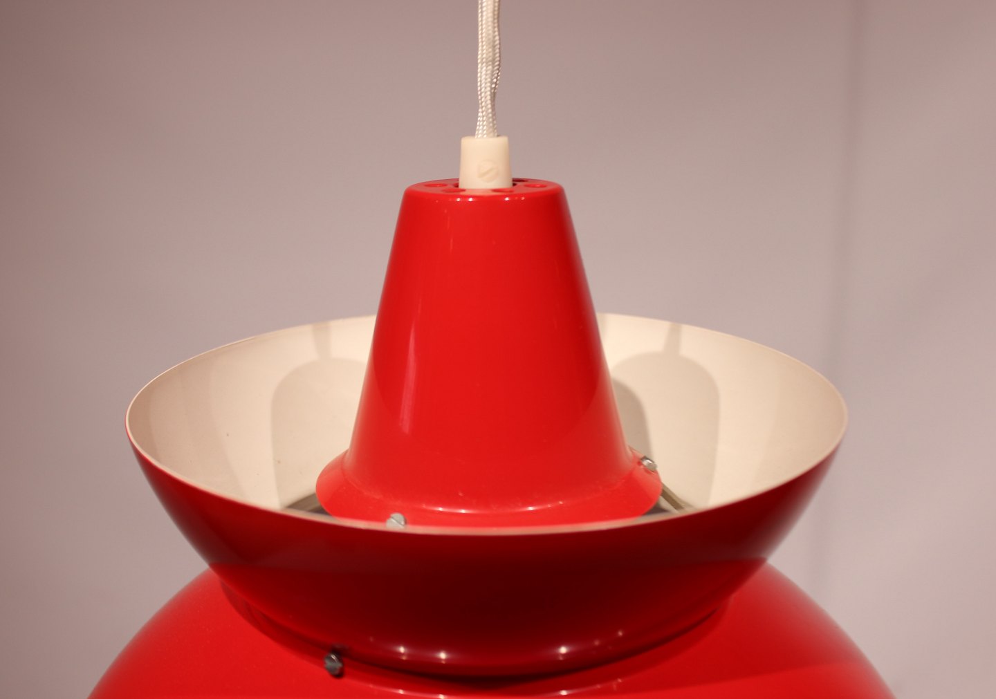 A pair of "Søværns" pendants in red and white designed by Jørn Utzon and manufactured by Louis Poulsen in the 1960s.