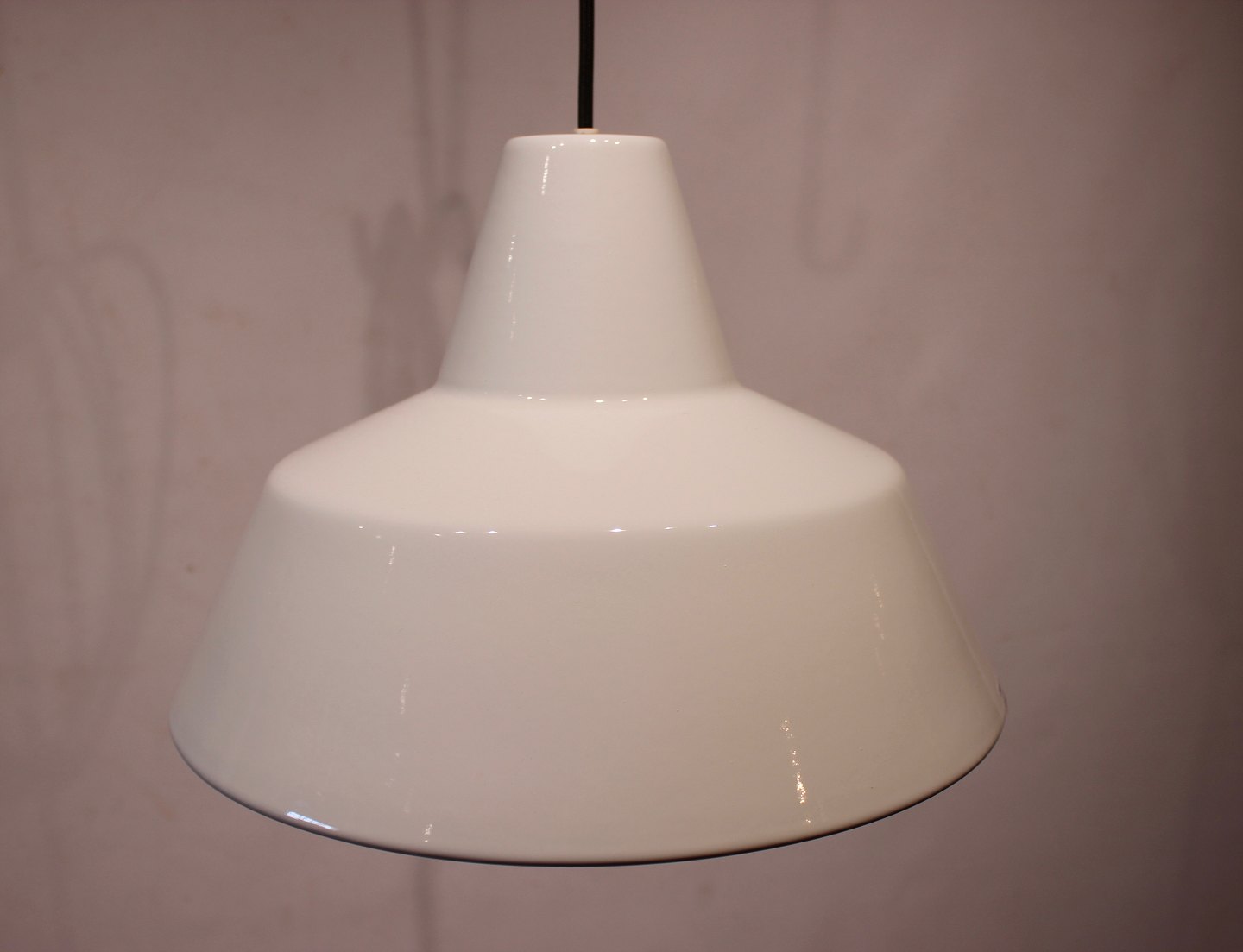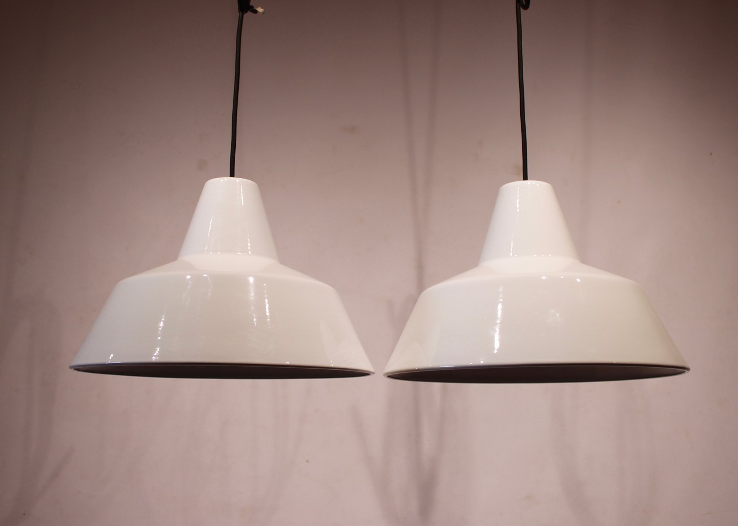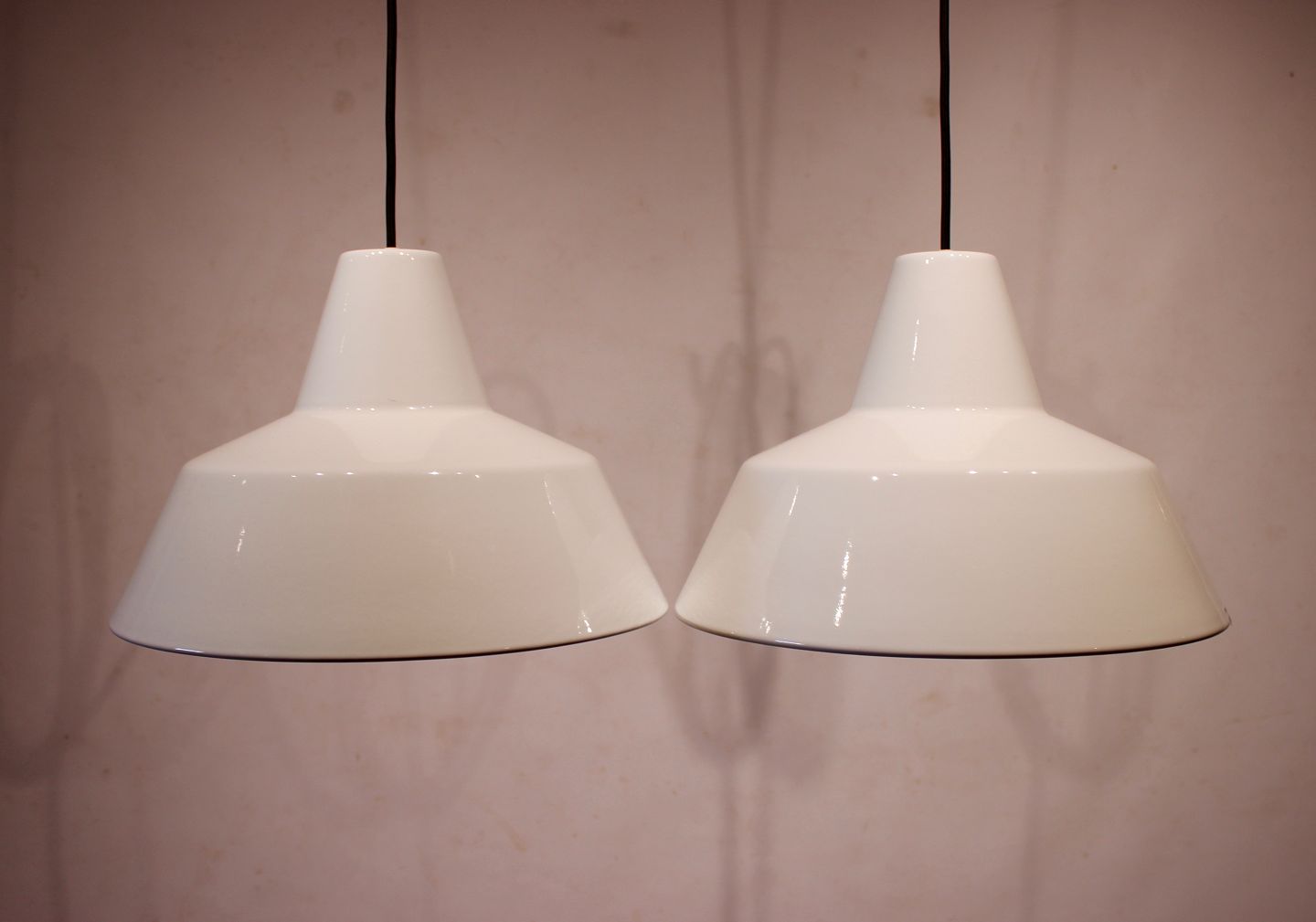 SolgtEt par hvide værkstedslamper designet af Louis Poulsen fra 1970erne. Lamperne er legeret med hvid emalje og ellers i flot brugt stand. Vi har flere på lager.