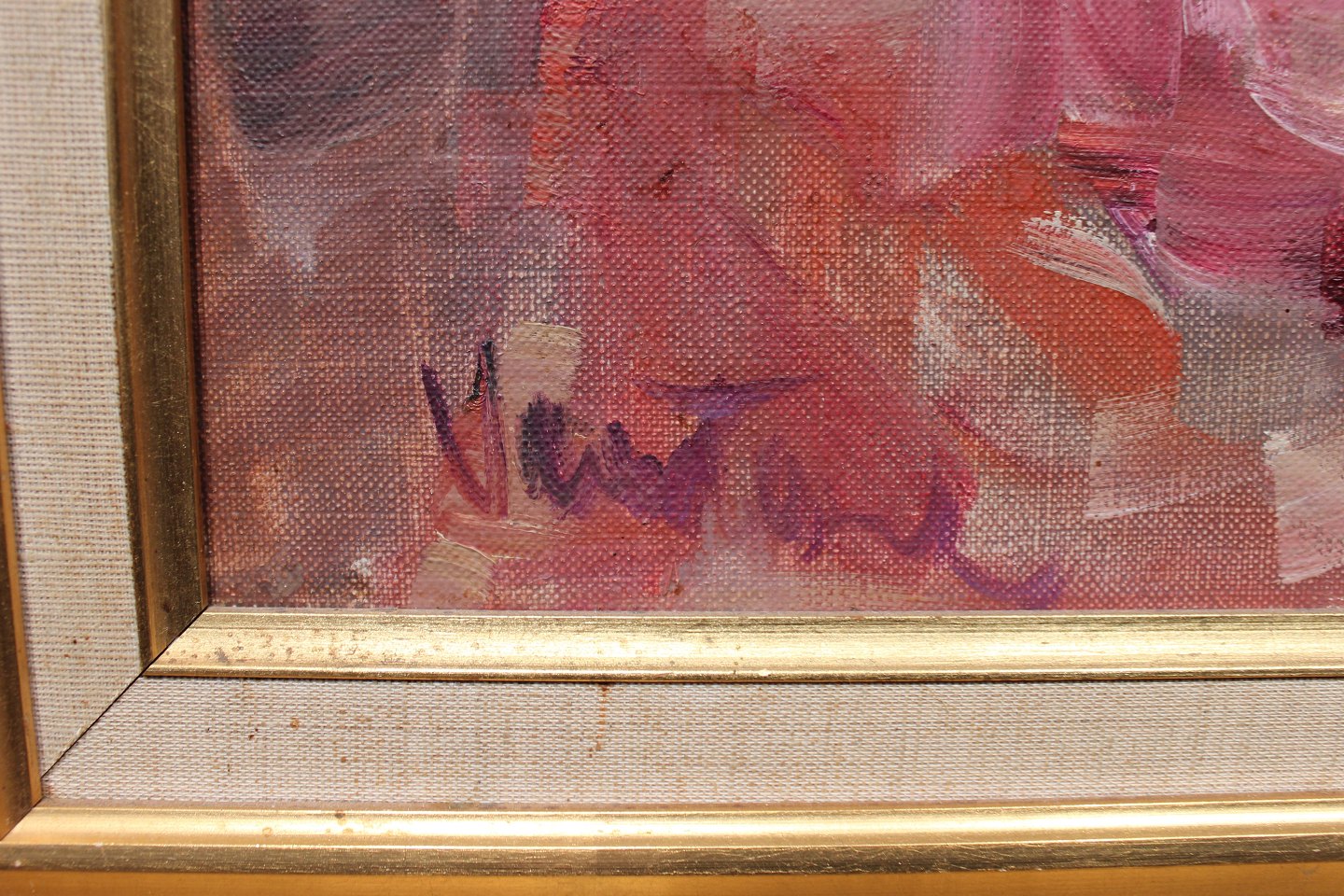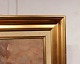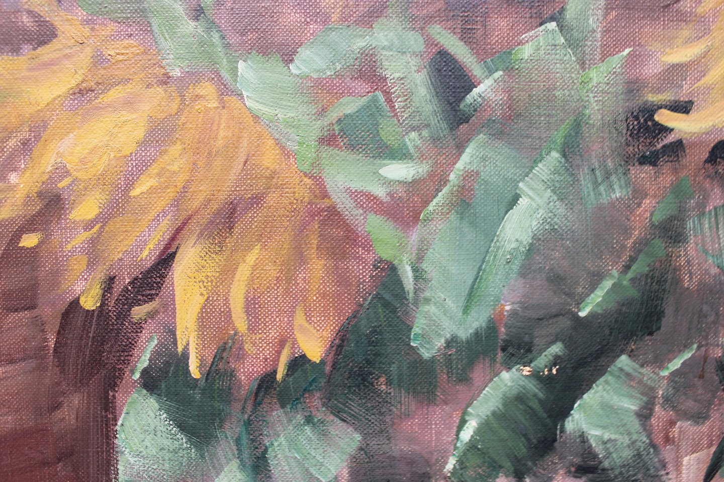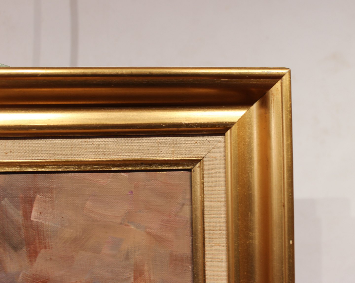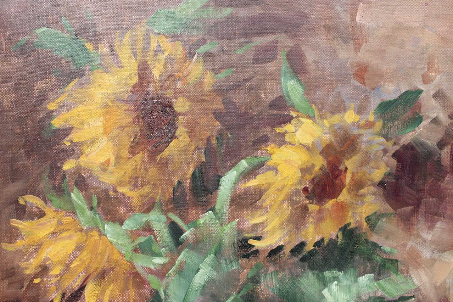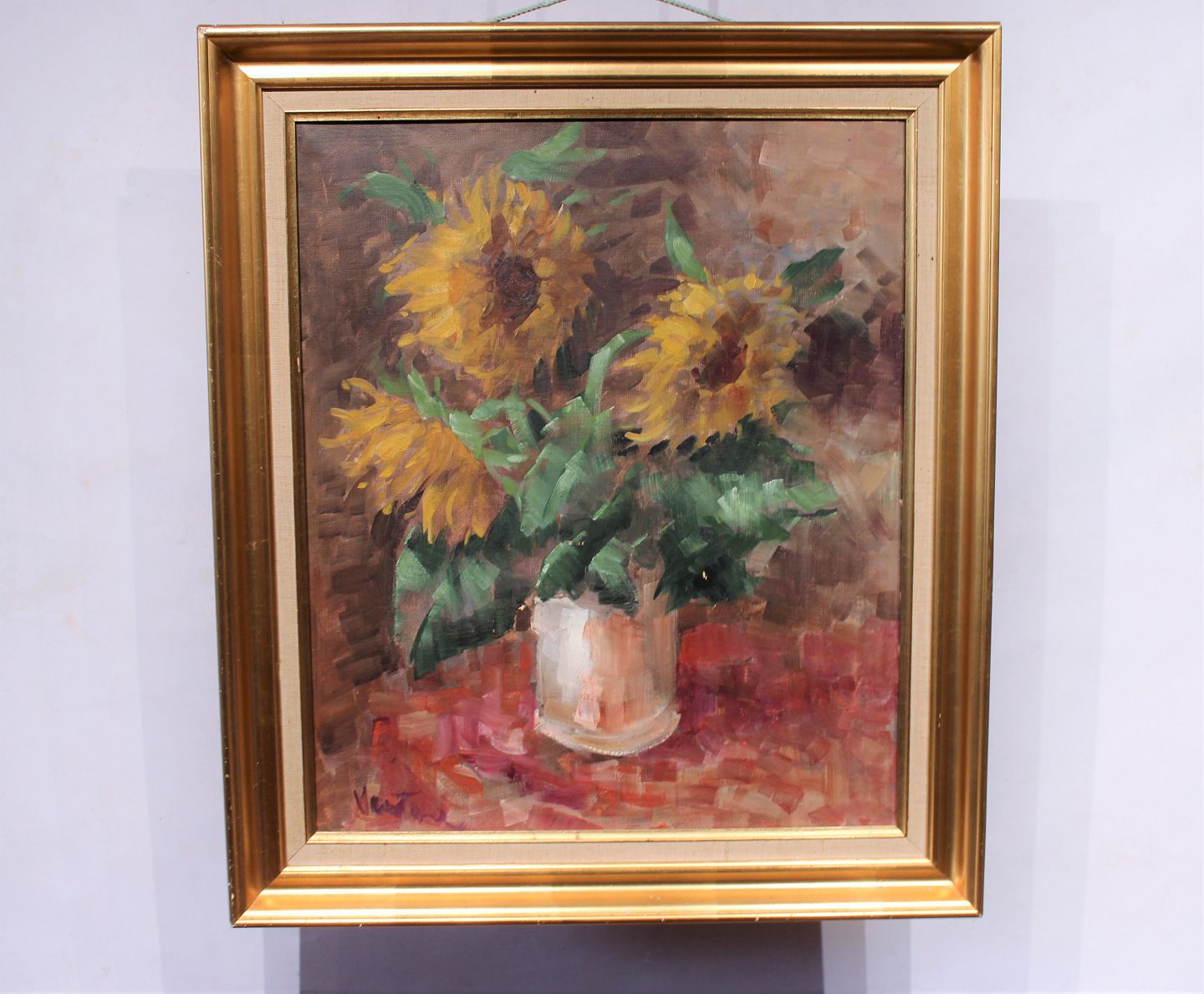 Oil painting with motif of sunflowers in gilded frame, by Mogens Vantore.