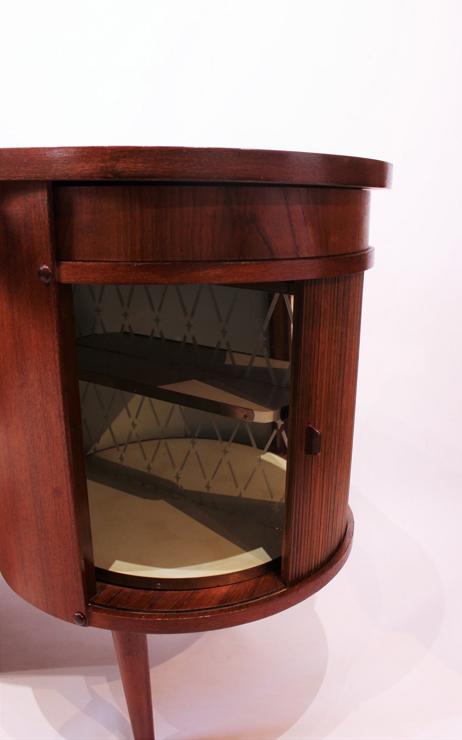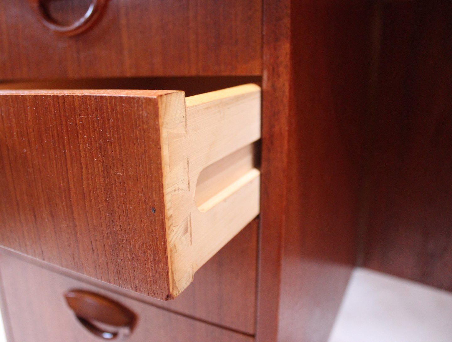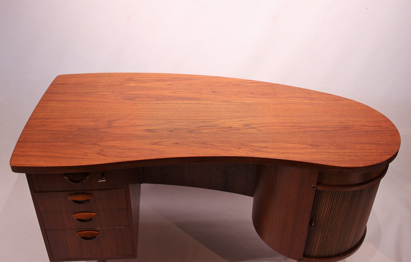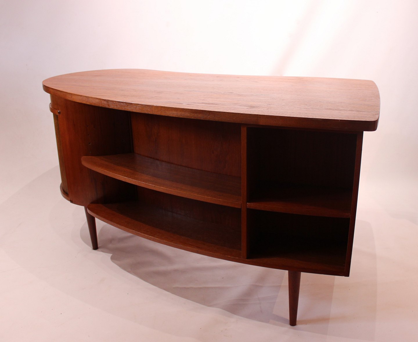 SoldDesk with sliding door and bar cabinet, of teak and designed by Kai Kristiansen. The table is from the 1960s and is in great vintage condition.