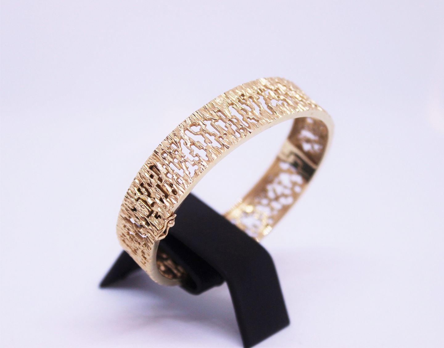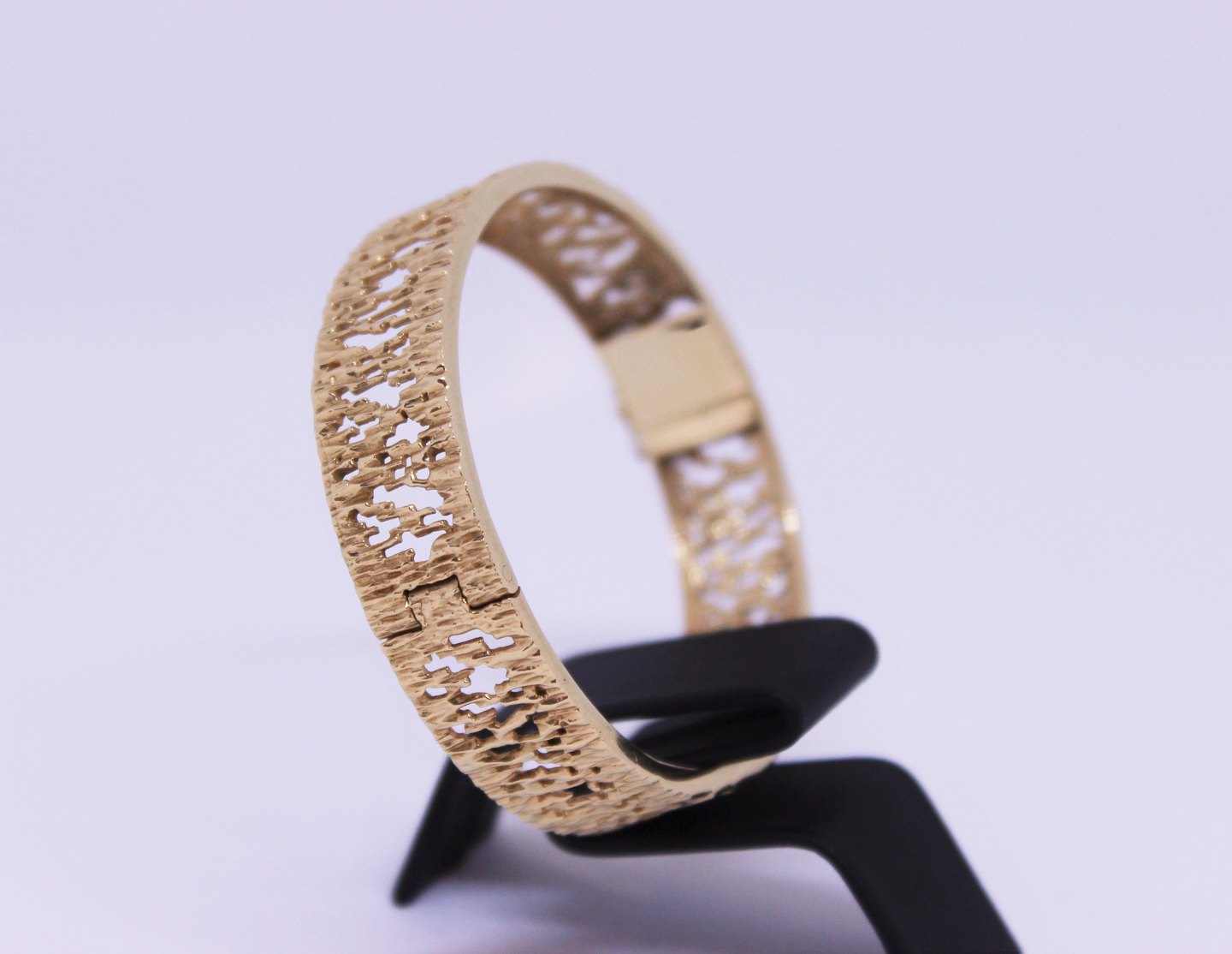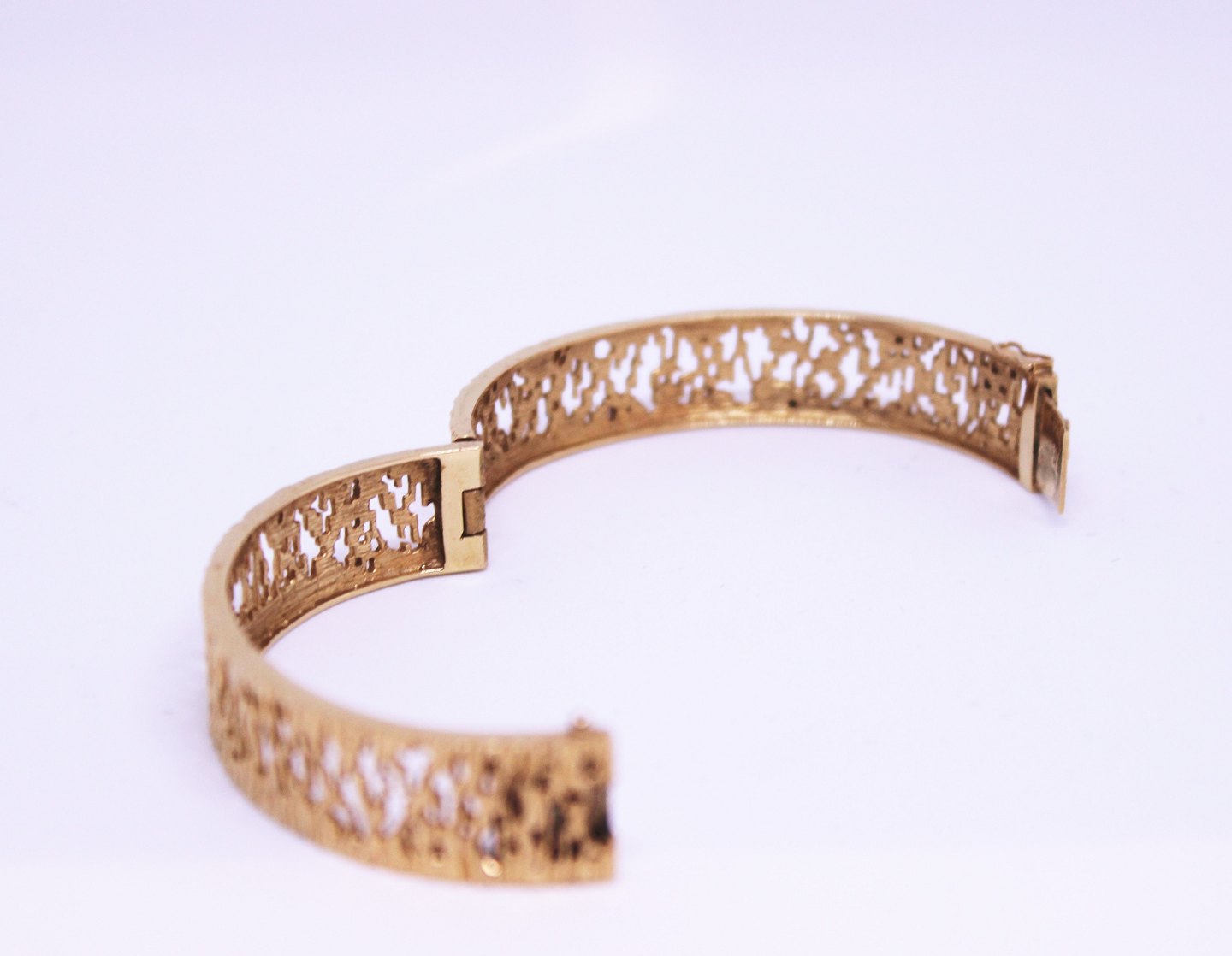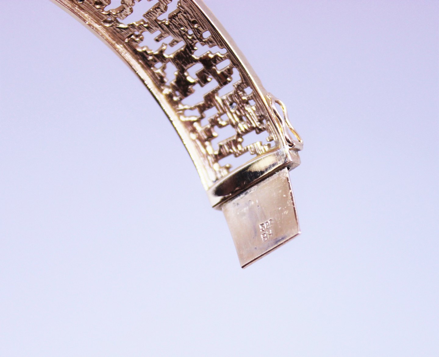 Sold14 carat gold bangle decorated finnish inspired open work and stamped BH by the goldsmith Bernhard Hertz.