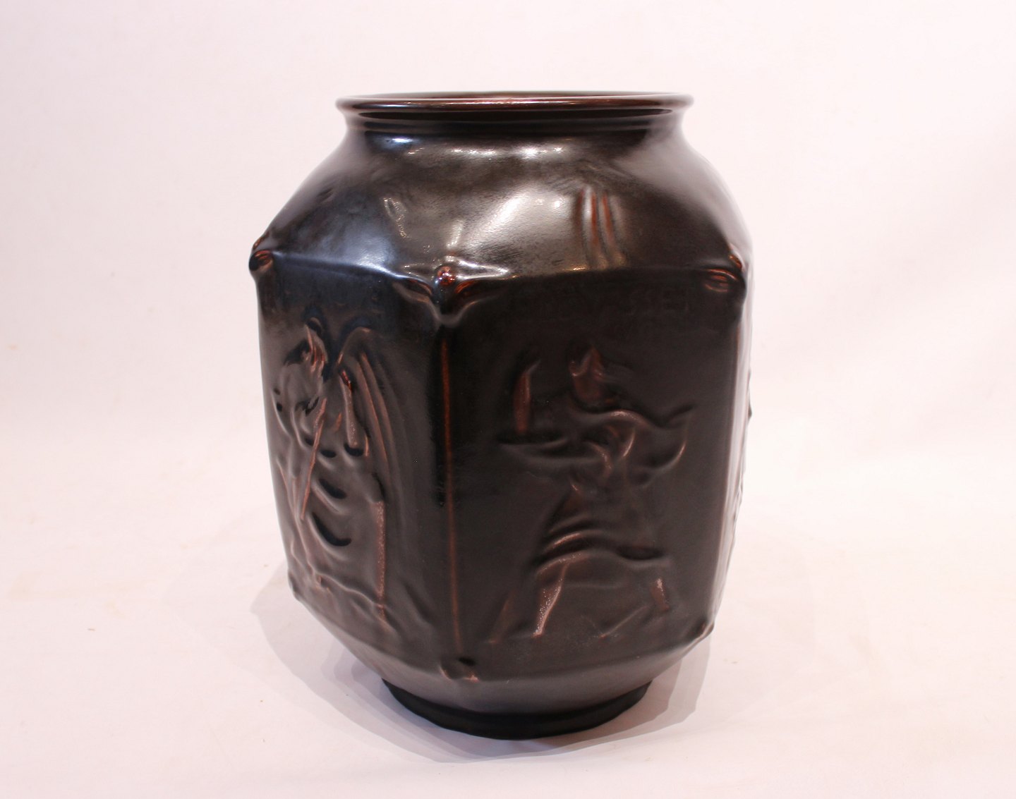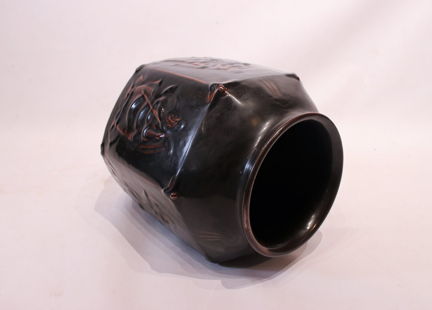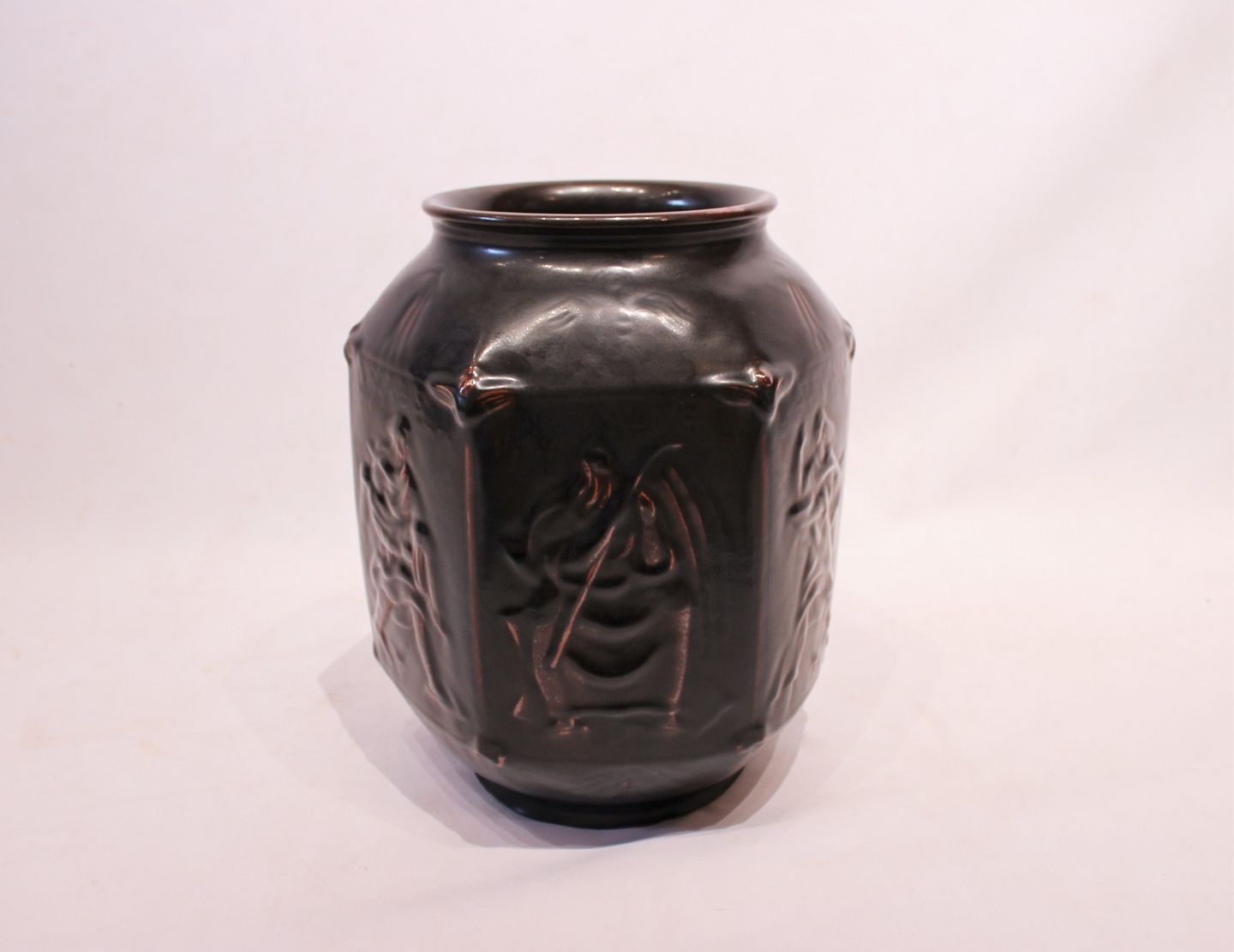 Royal Copenhagen stoneware floor vase with a dark glaze decorated with motifs signed by Jais Nielsen and numbered 2222.