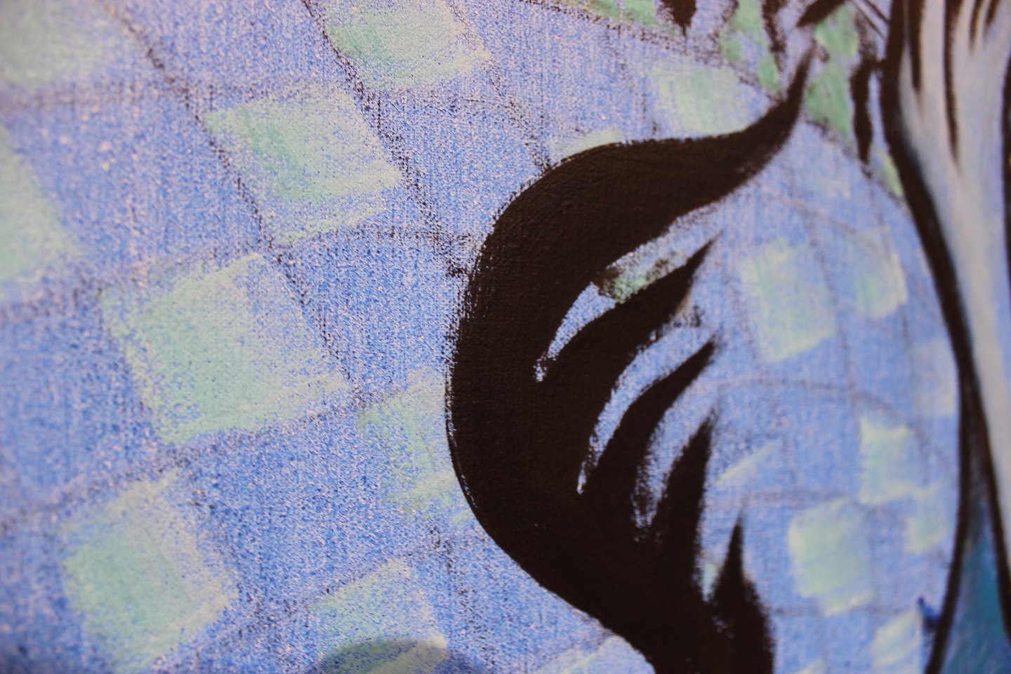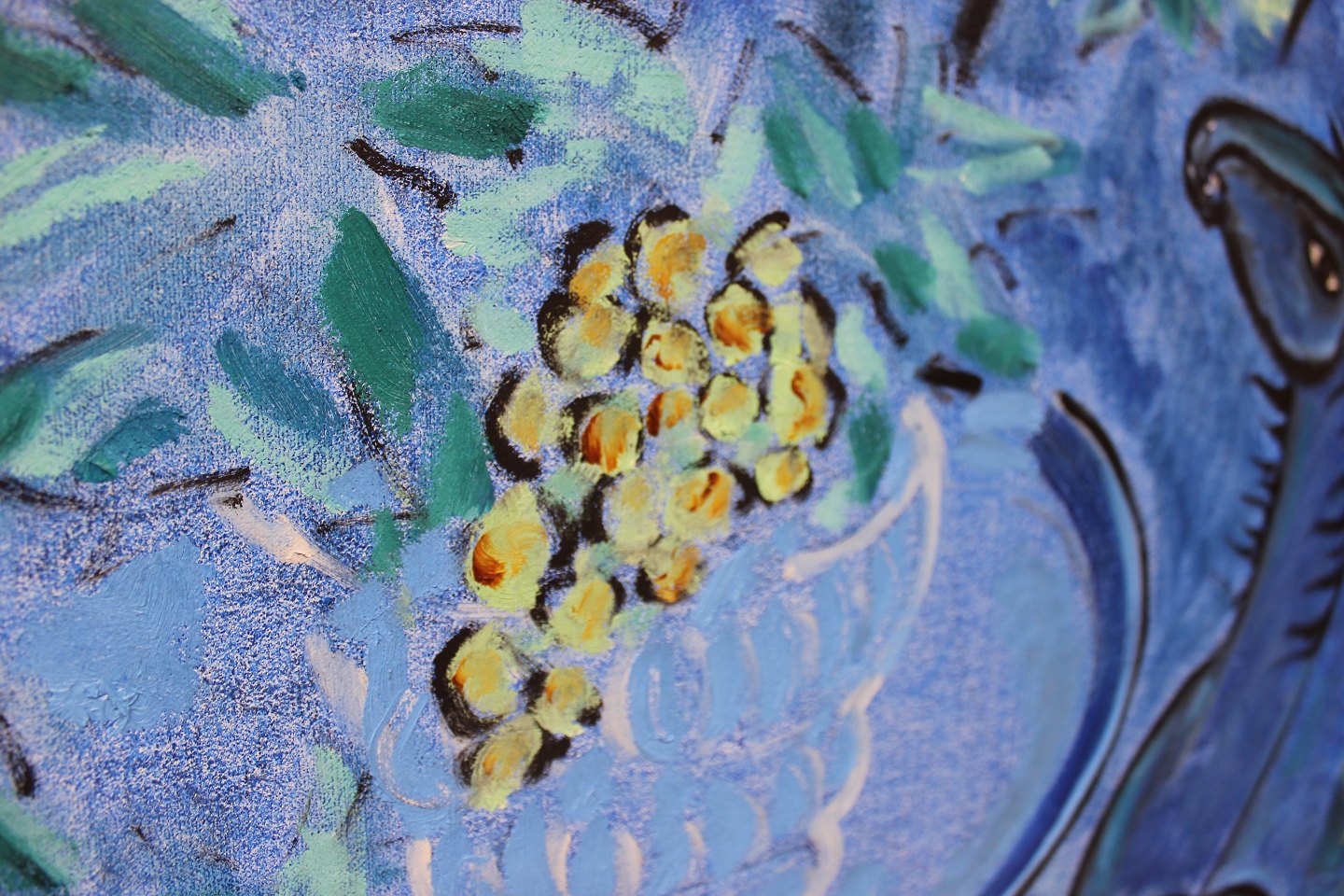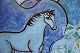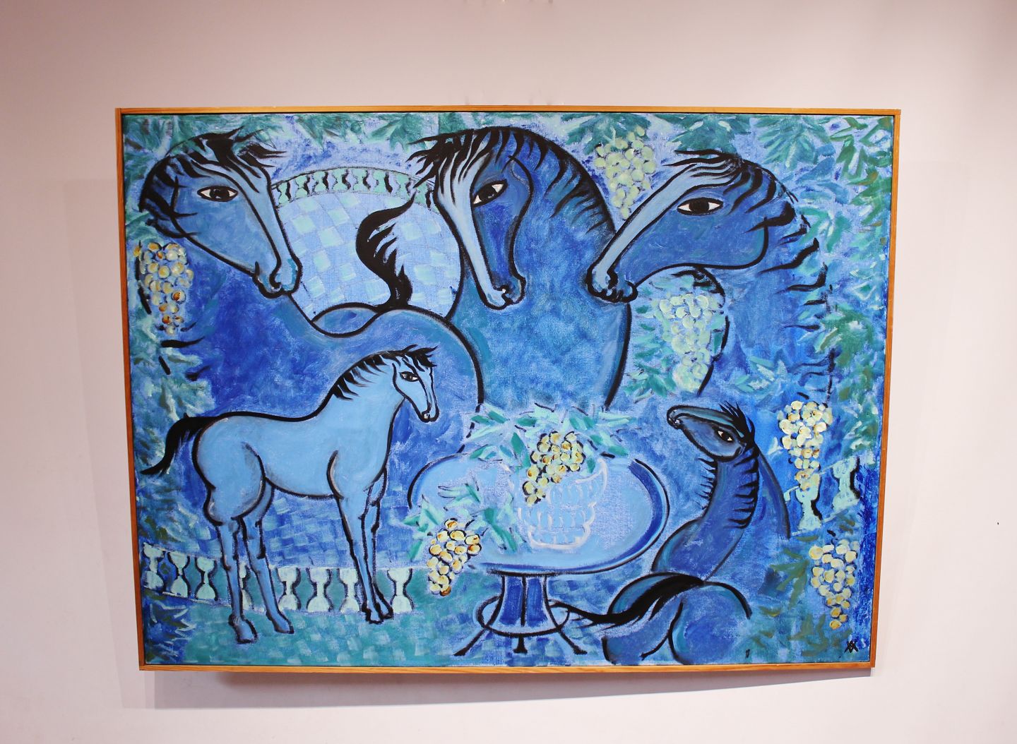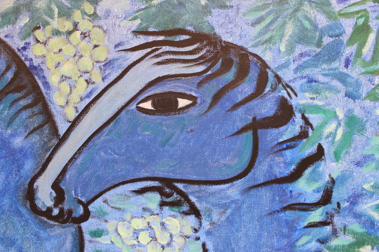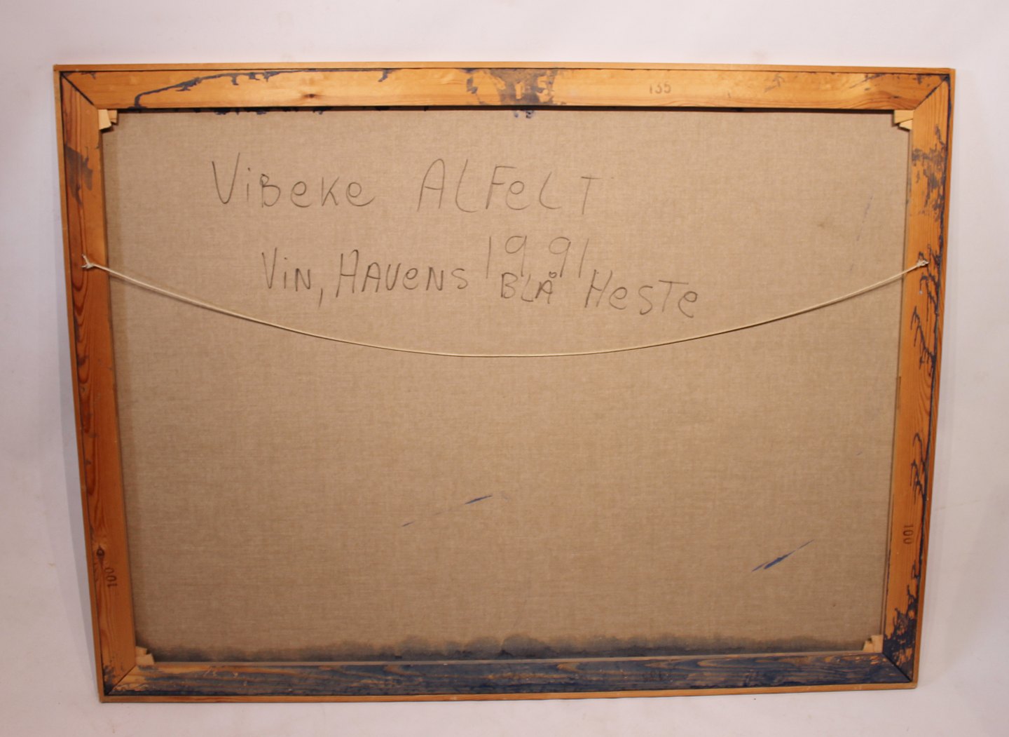 SolgtMaleri på lærred kaldet "Vin havens blå heste" af Vibeke Alfelt fra 1991. Maleriet er i flot brugt stand. Vibeke Alfelt er datter af de to danske kunstnere Else Alfelt og Carl-Henning Pedersen.