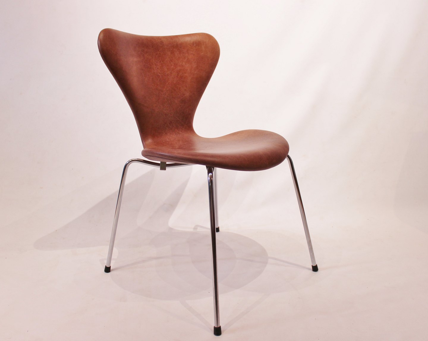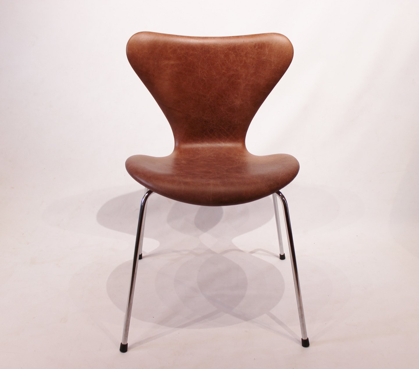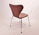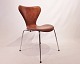 SolgtEt sæt af 6 Syver stole, model 3107, designet af Arne Jacobsen og fremstillet hos Fritz Hansen i 1980erne. Stolene er nypolstret i cognac patineret læder og i flot stand.