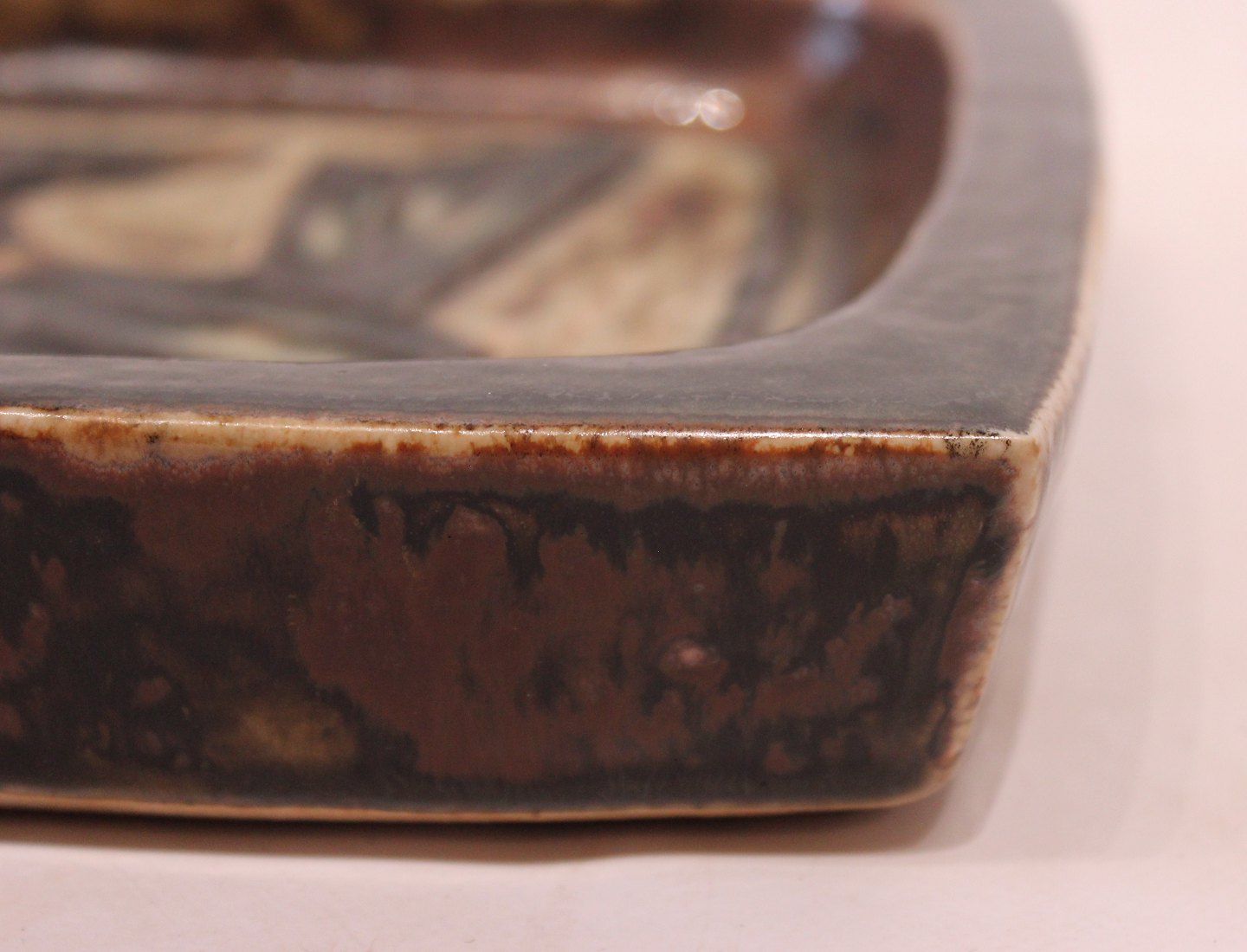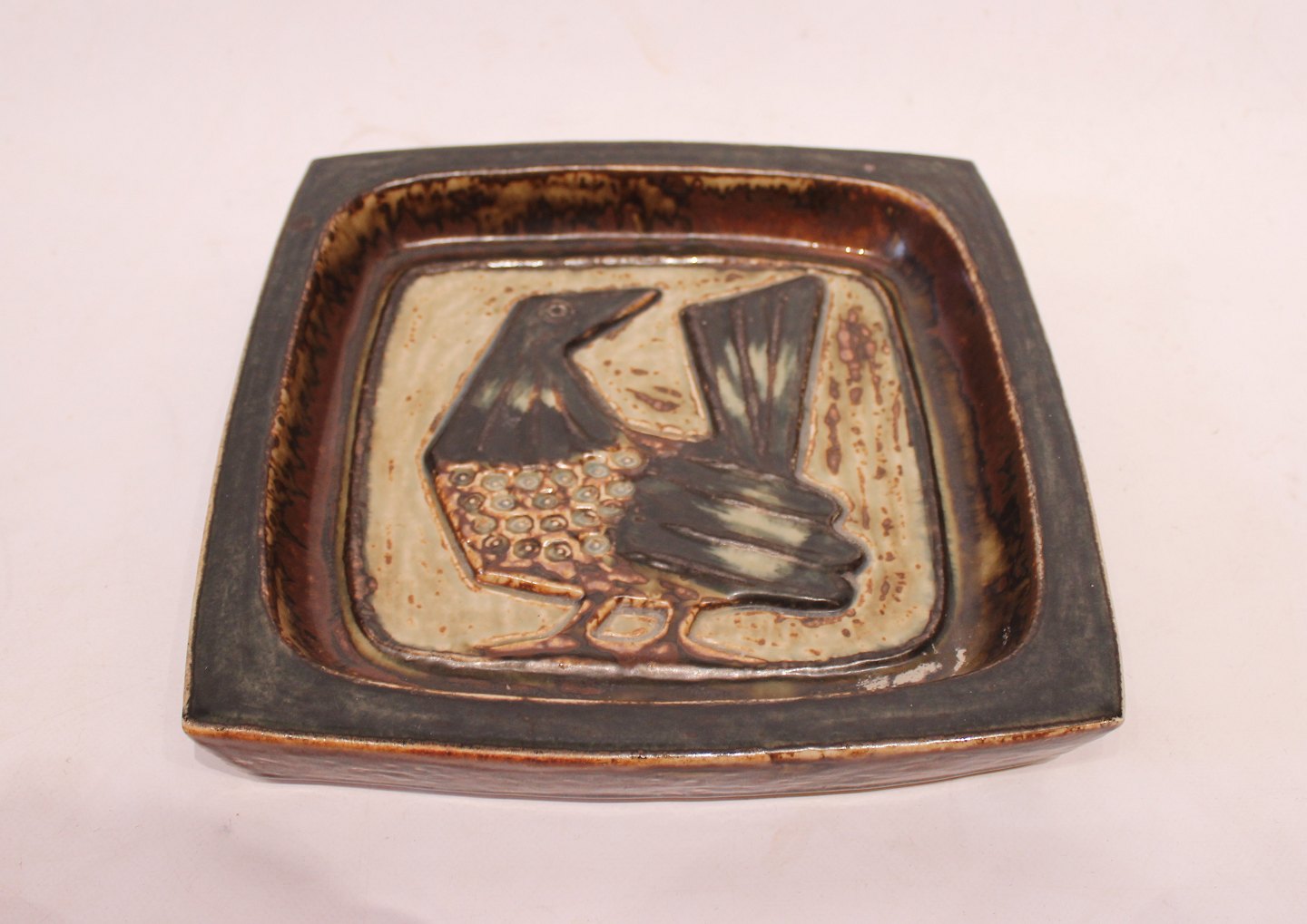 SoldRoyal Copenhagen stoneware dish, no.: 21941, by Jørgen Mogensen. The dish is decorated with a bird motif and in brown colors.