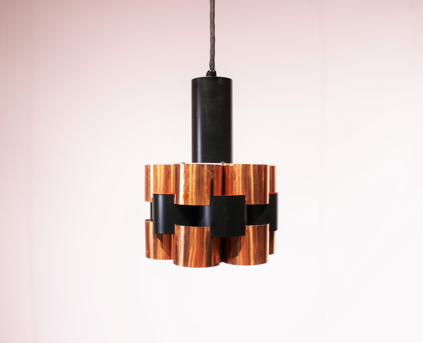 A pair of ceiling pendants in of cobber and black lacquered metal designed by Werner Schou from the 1960s. The lamps are in great vintage condition.