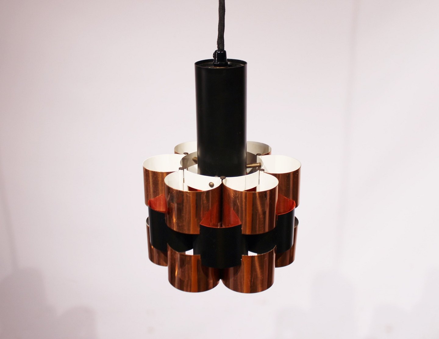 A pair of ceiling pendants in of cobber and black lacquered metal by Werner Schou from the 1960s.