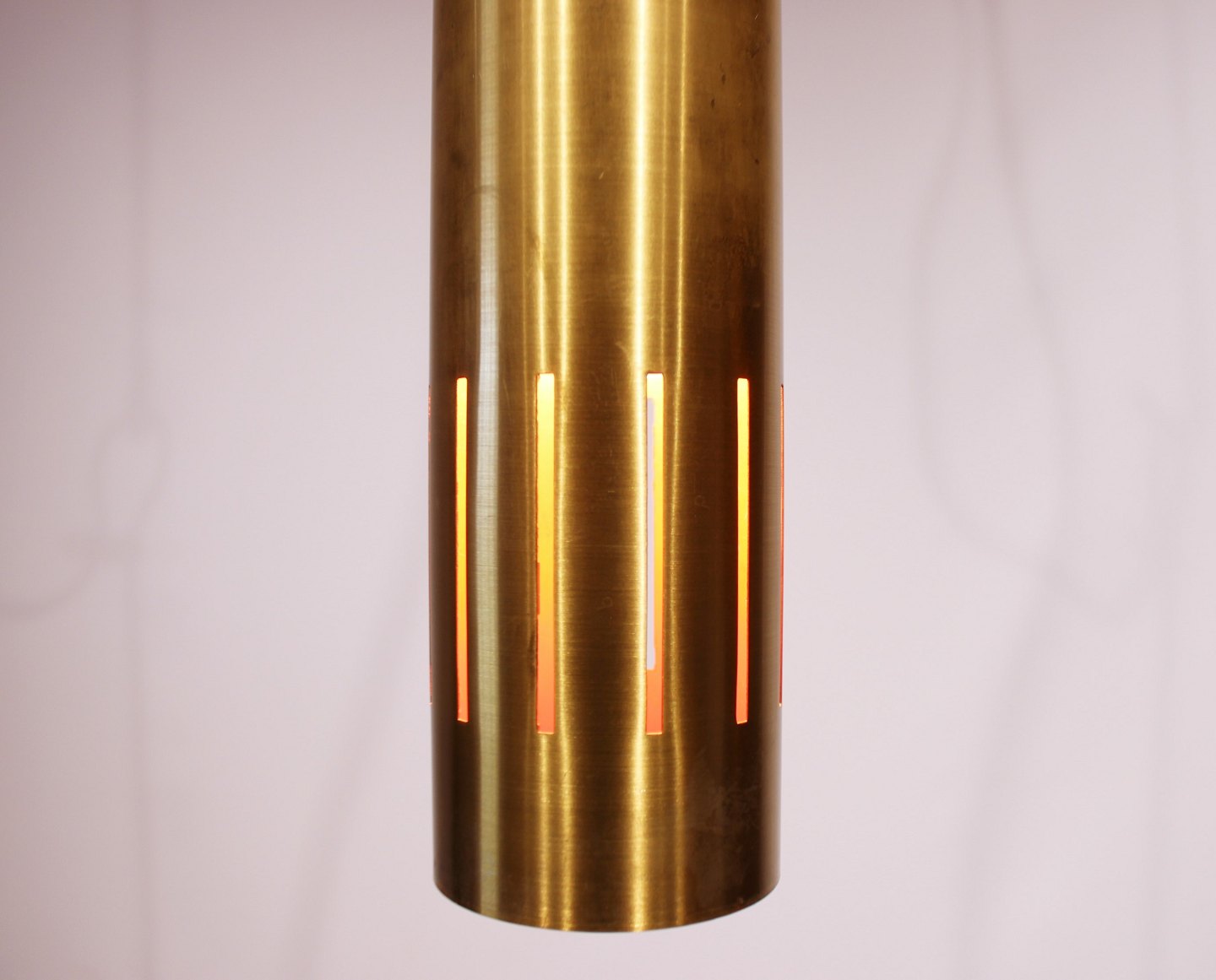 SolgtRetro loft pendel i messing og indvendig orange lakering af dansk design fra 1970erne. Lampen er i flot brugt stand.