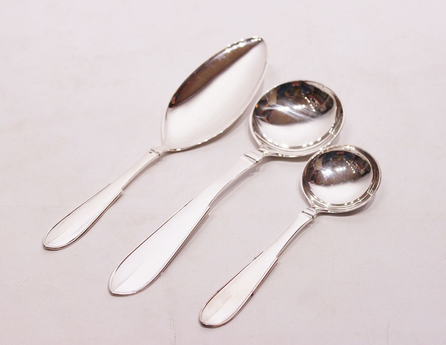 View the price in the text descriptionCake spatula, serving spoon and marmalade spoon in Arvesølv 1 by Hans Hansen. Ask for quantity in stock.