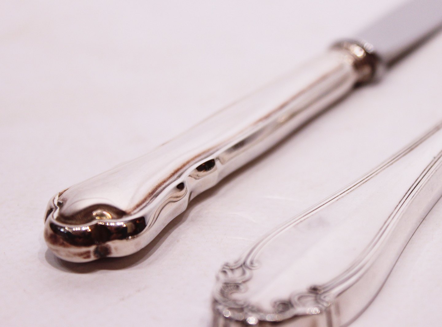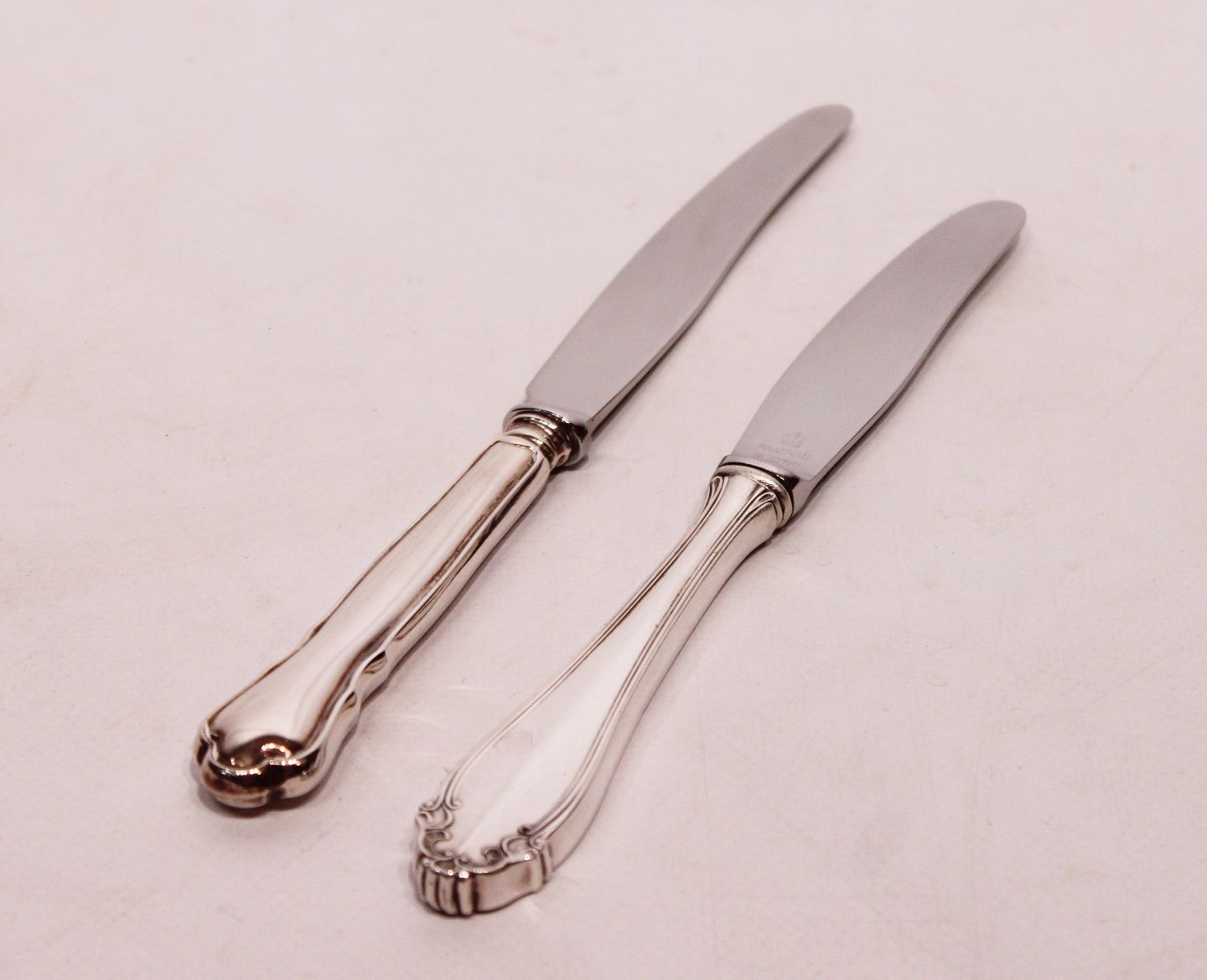 Dinner knives in different patterns of 830 silver and hallmarked silver. Ask for number in stock.