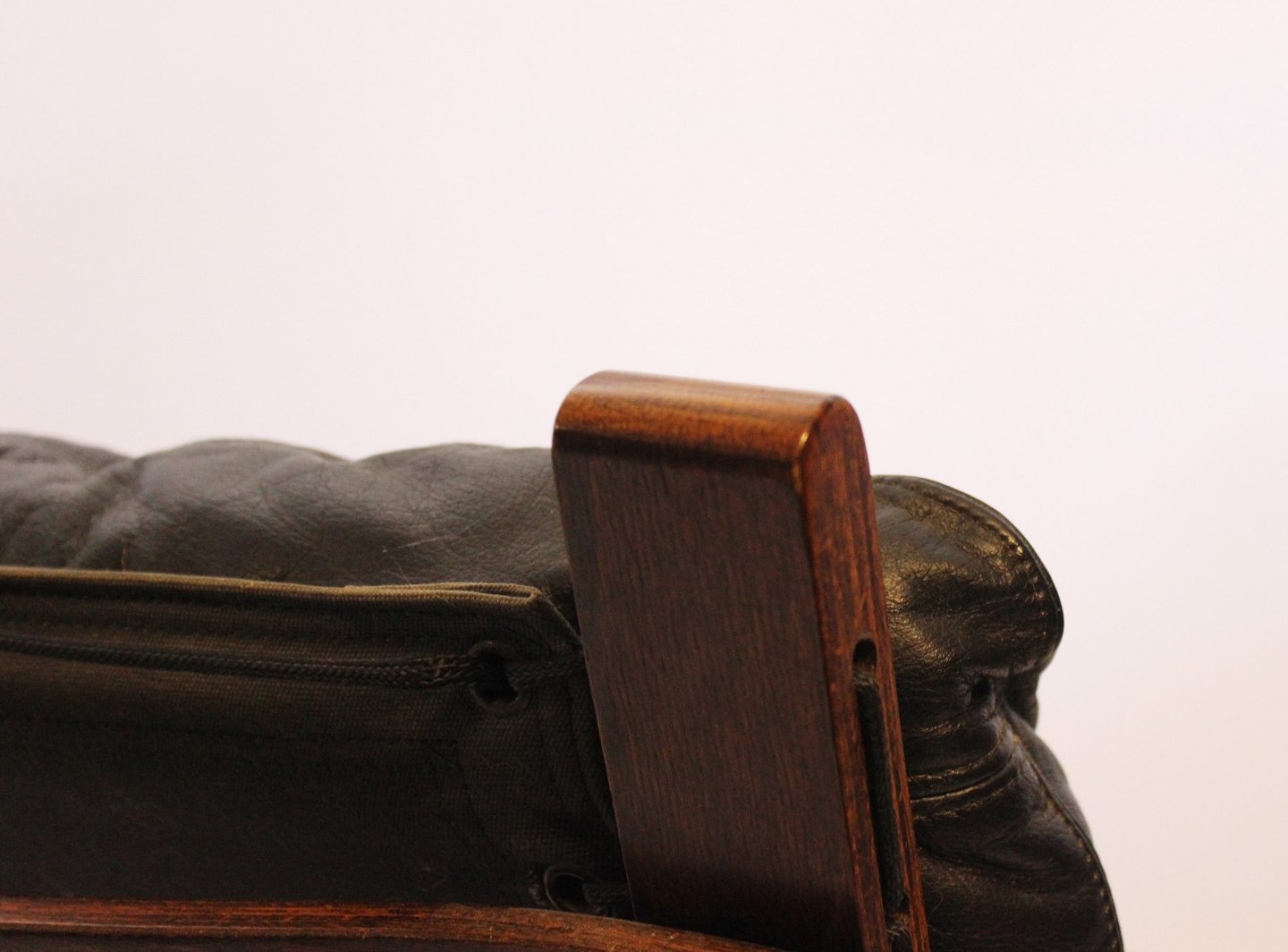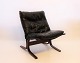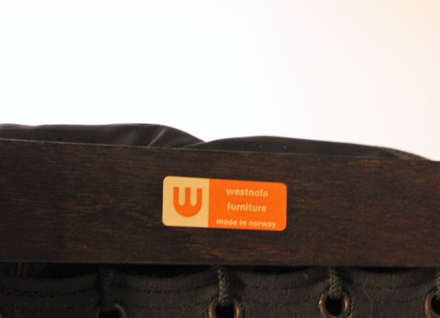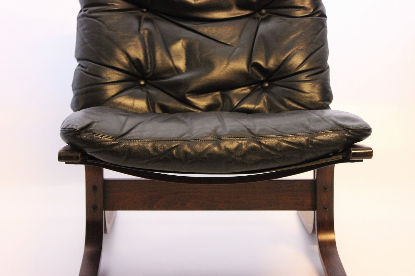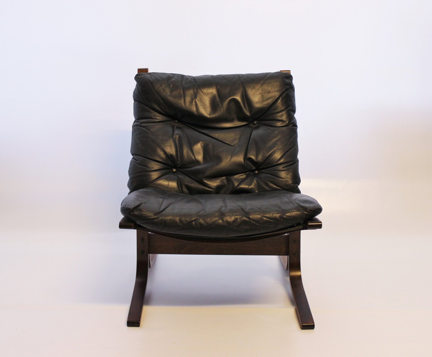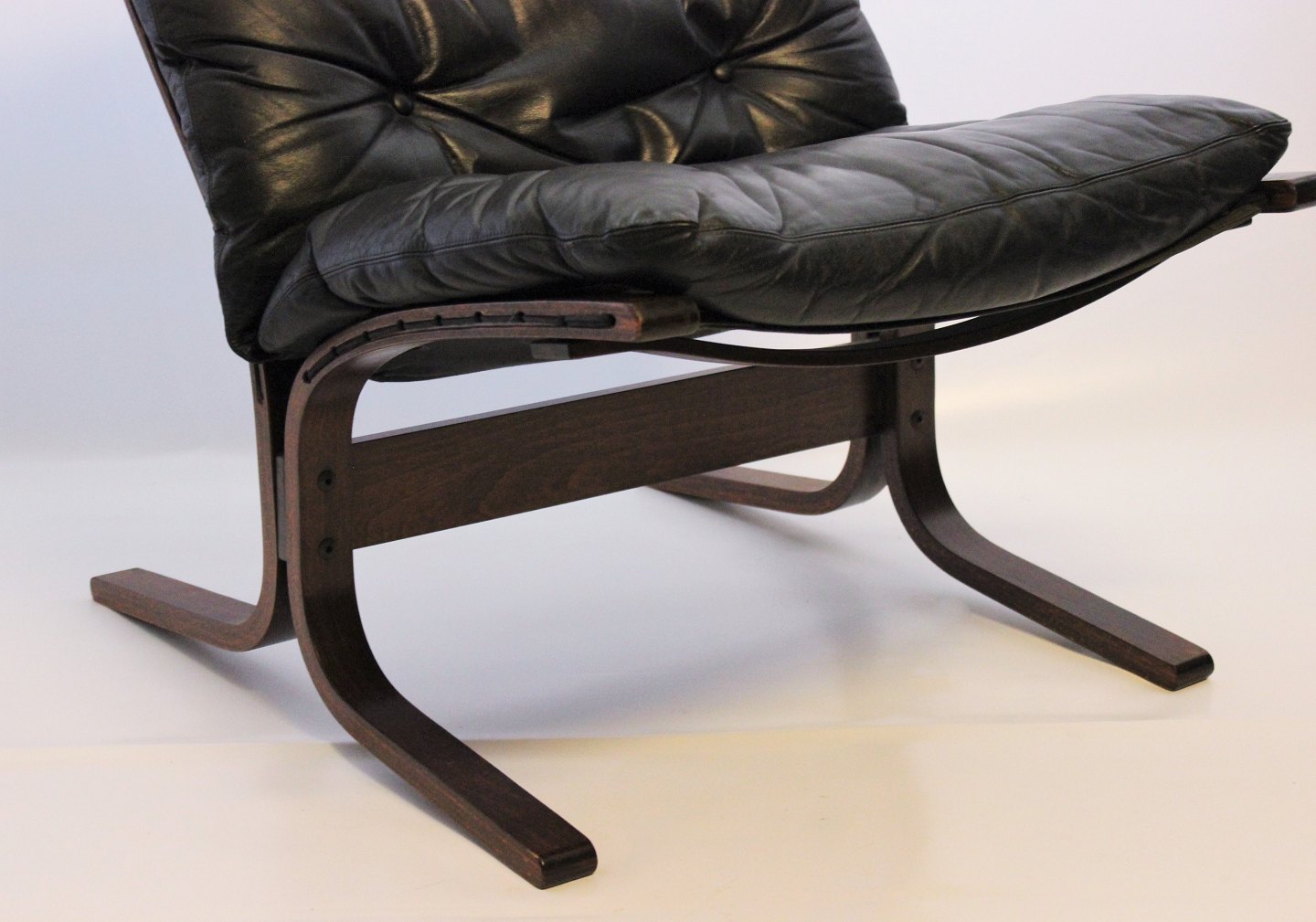 A pair of Siesta easy chairs of black leather and dark wood, designed by Ingmar Relling and manufactured by Westnofa in the 1960s.