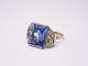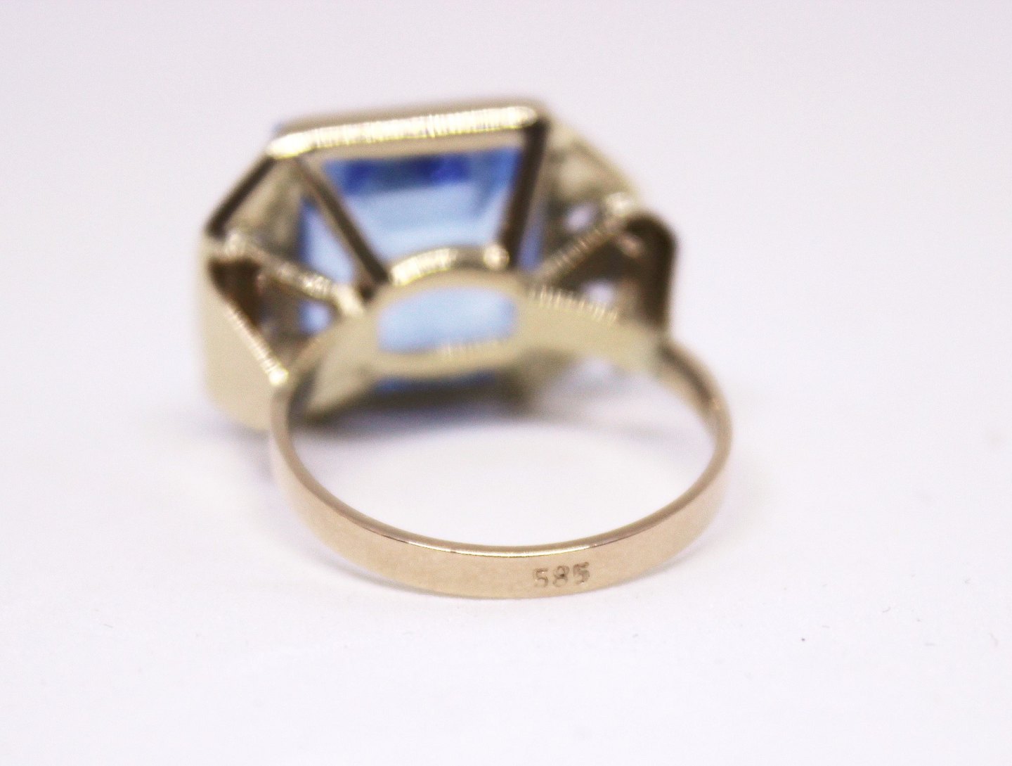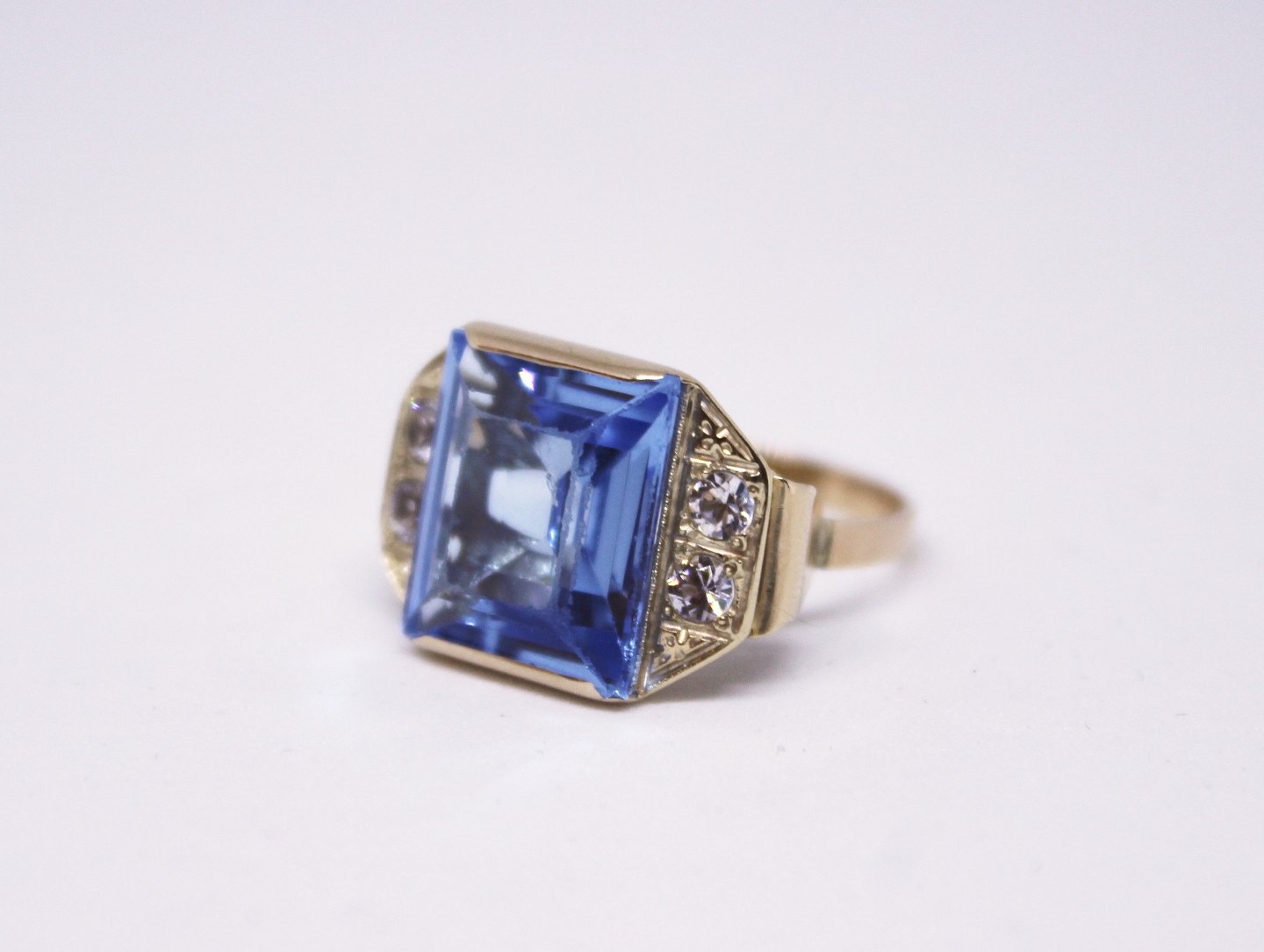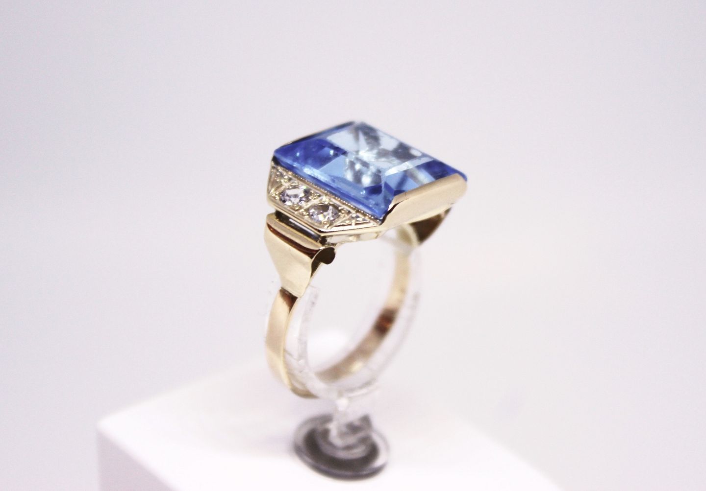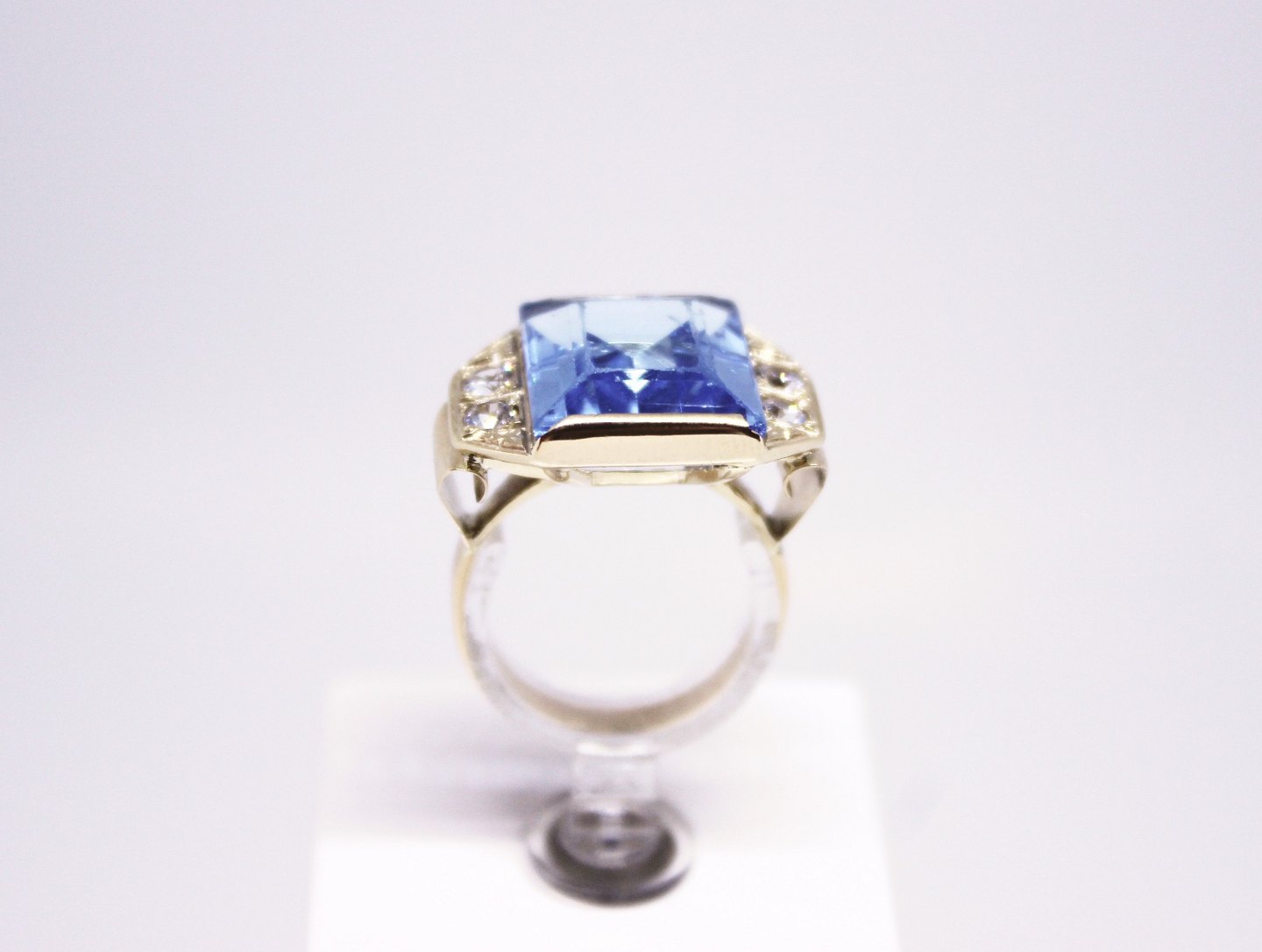 Ring of 14 ct. gold decorated with small clear stones and a large topaz.