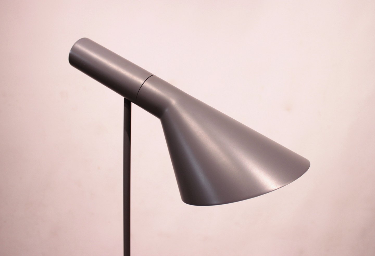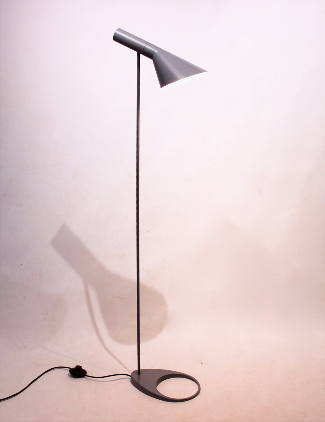 Grå gulvlampe designet af Arne Jacobsen i 1960 og fremstillet af Louis Poulsen i slutningen af 1990erne.