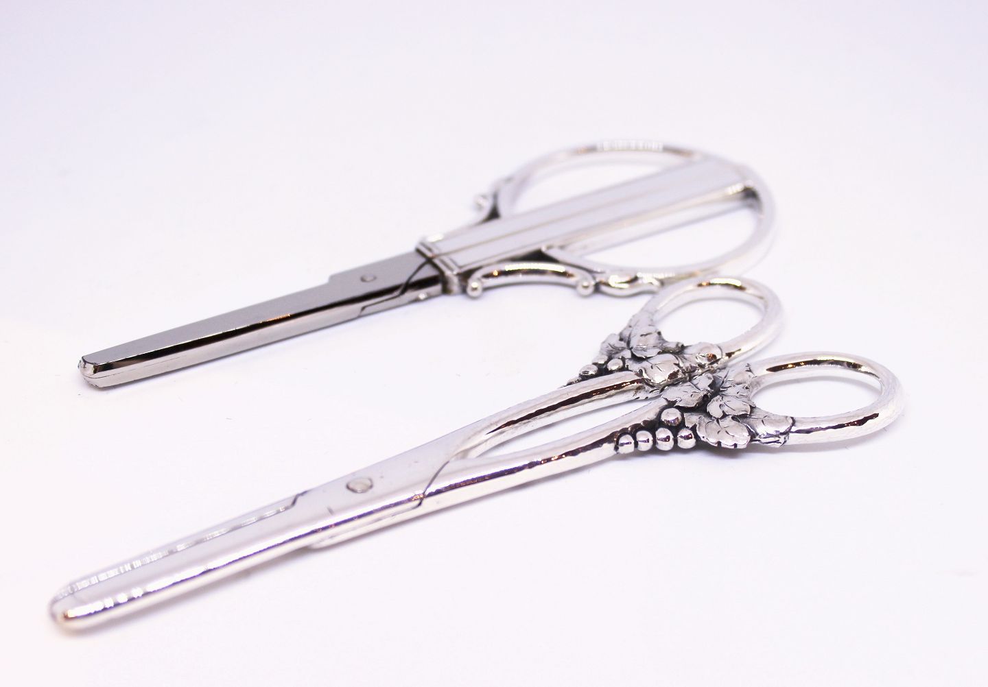 George Jensen vindruesaks 925 sterling, den bagerste på foto pris 3200 kr og den anden med druer stemplet J.J i tretårnet sølv pris 1500 kr