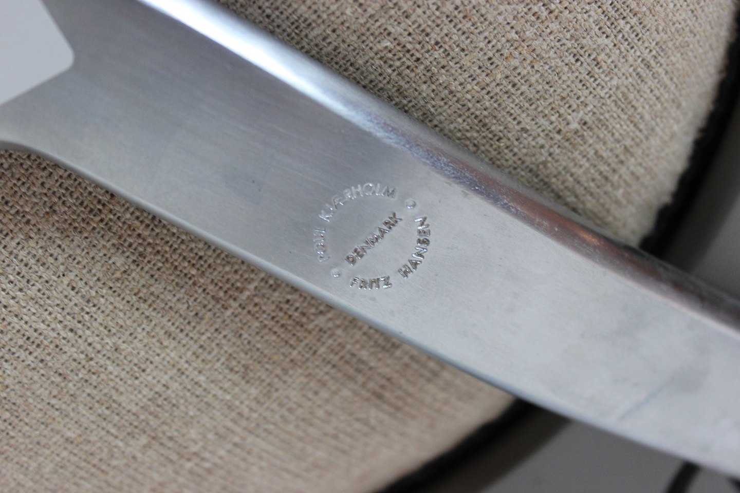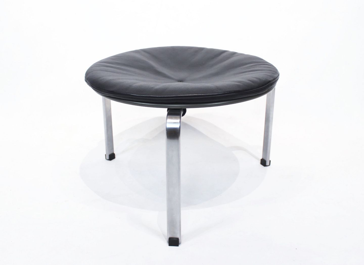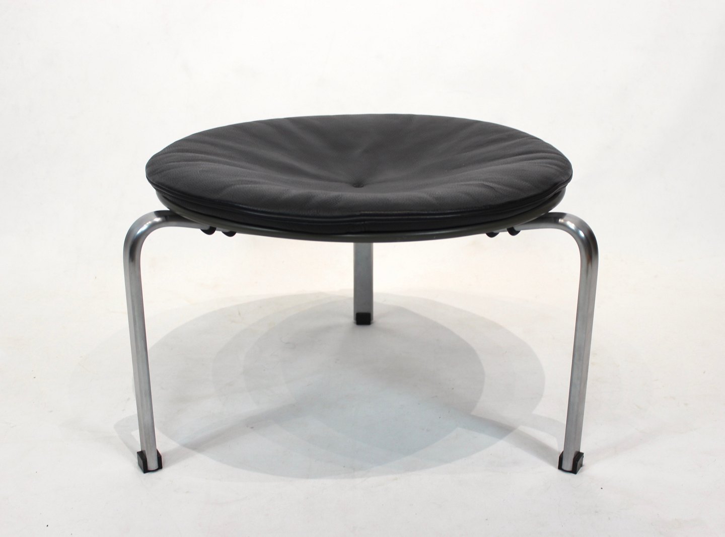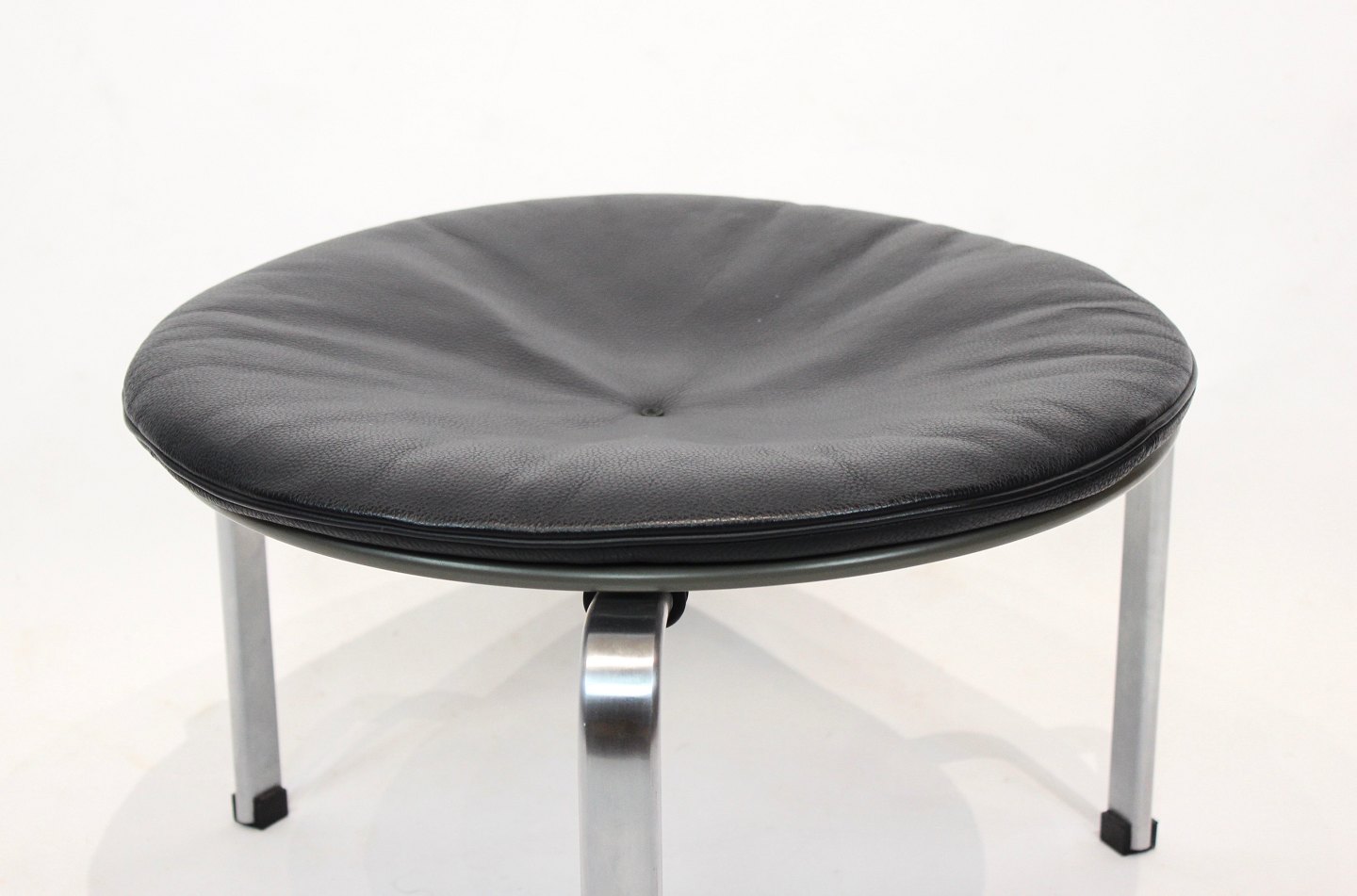 SoldStool, model PK33, with seat of black leather and frame of matt chrome spring steel, designed by Poul Kjærholm and manufactured by Fritz Hansen in 2004. The stool is in great used condition.