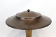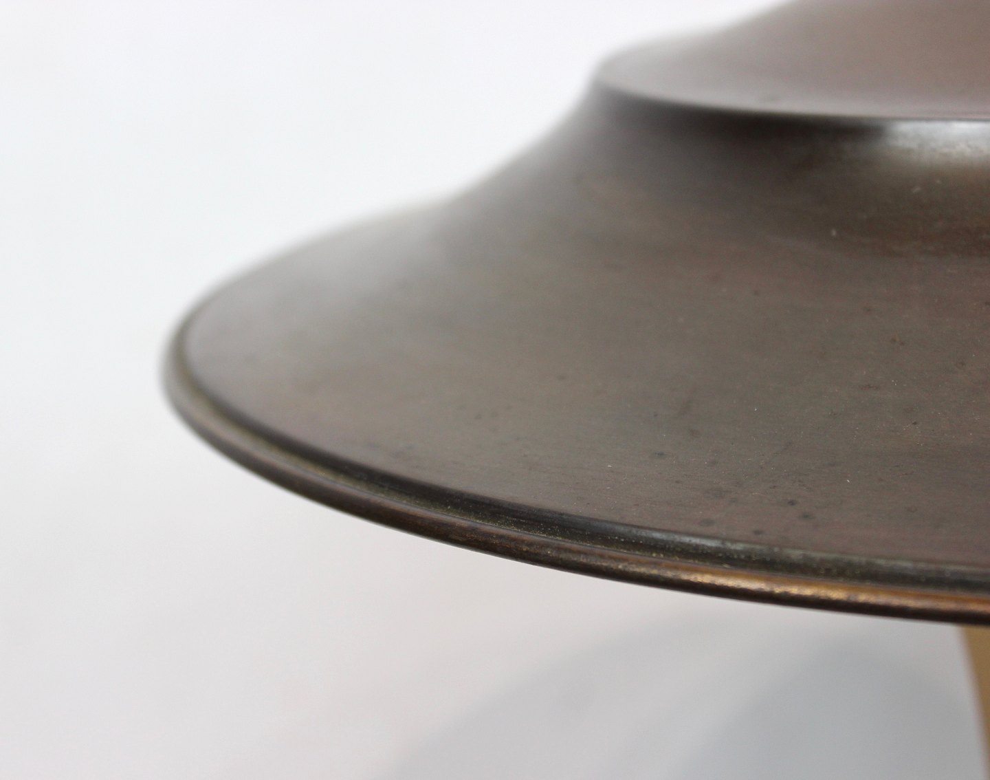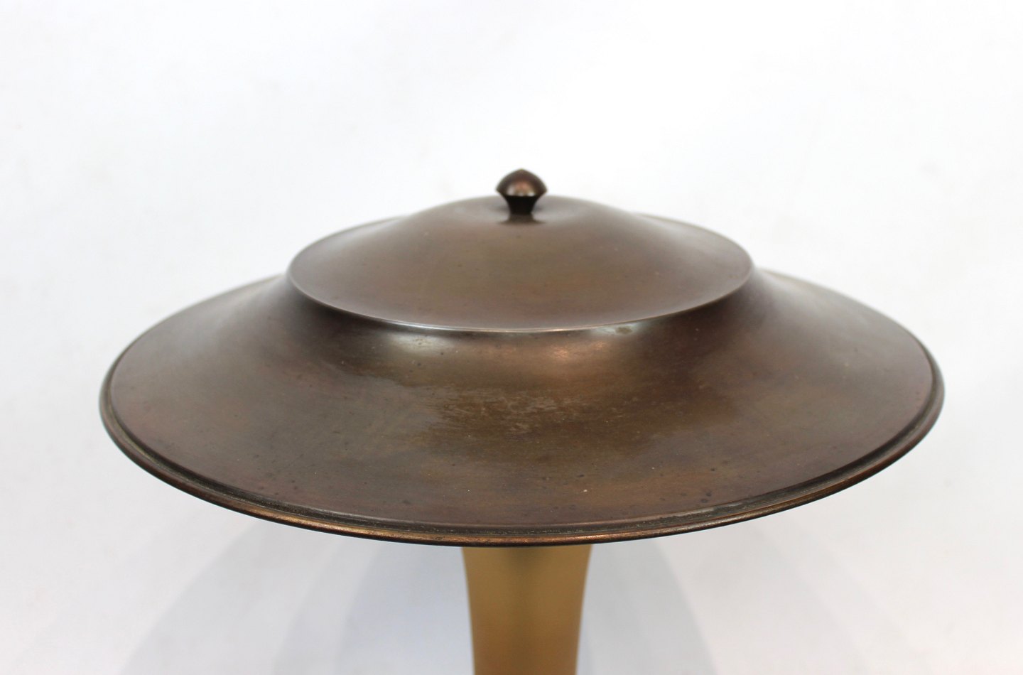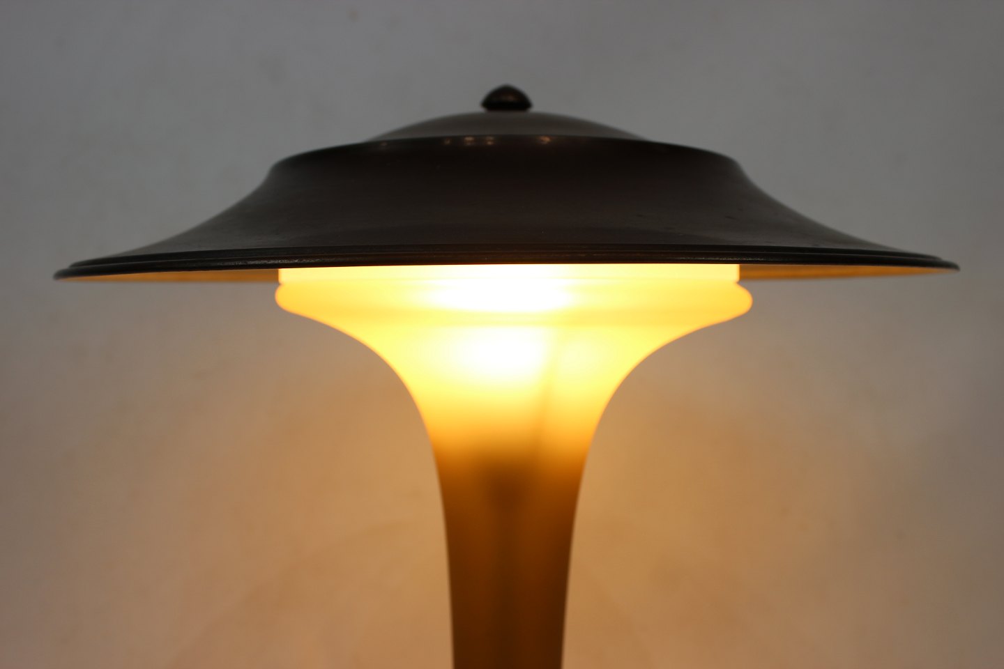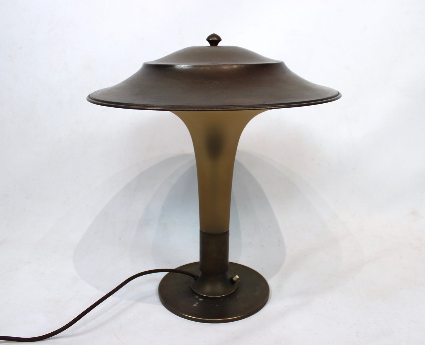 The Torch lamp with stem of amber colored glass and foot and shade of patinated brass, by Fog and Mørup from the 1930s.