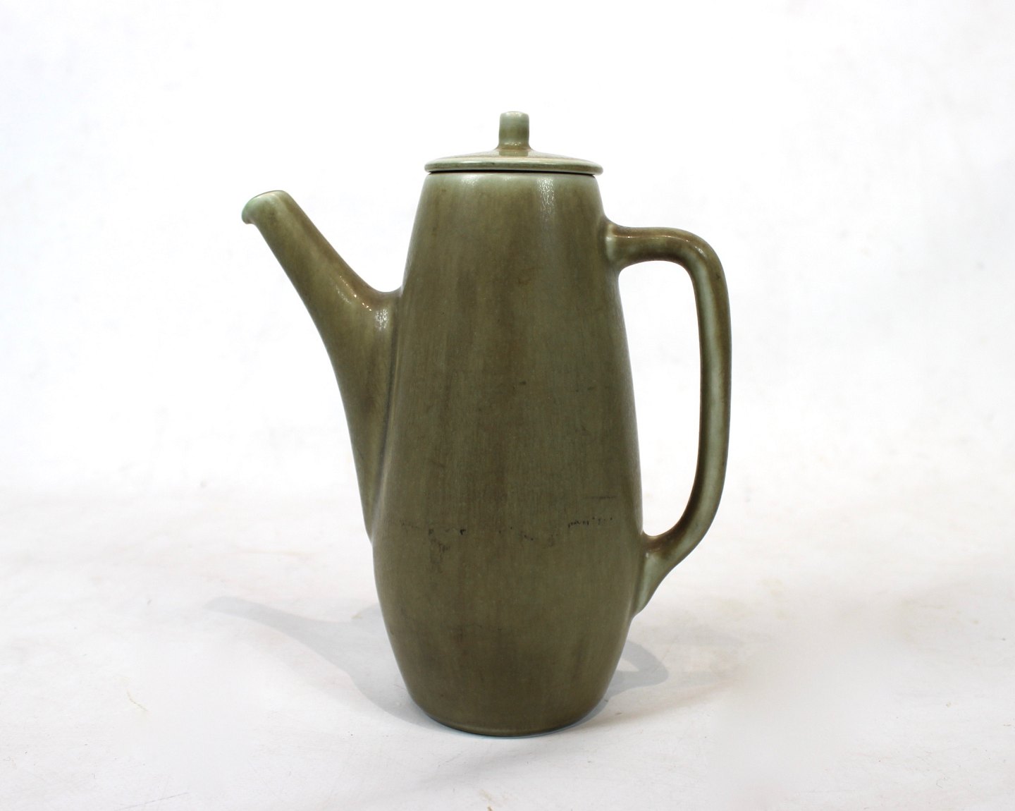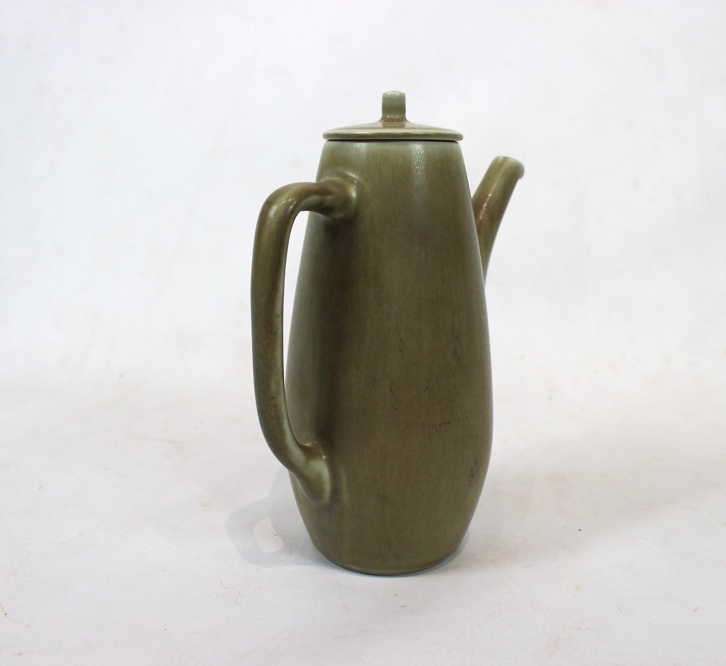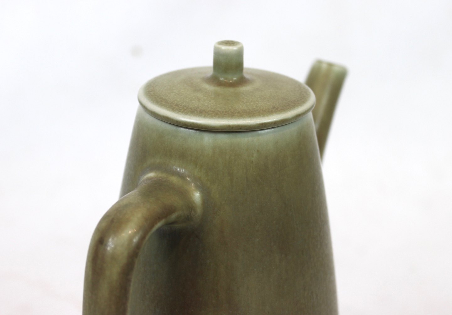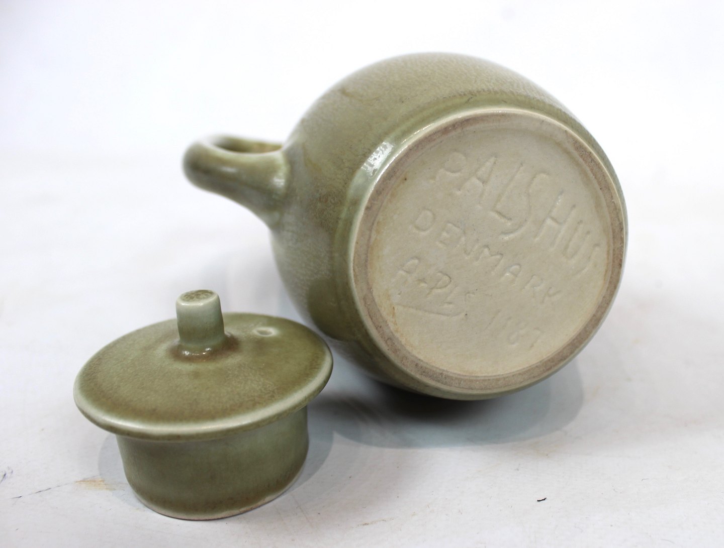 SolgtKeramik kande med mørkegrøn glasur af Palshus og nummereret, 1187. Kanden er i flot brugt stand.