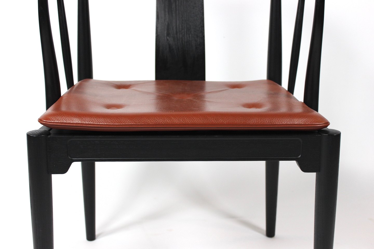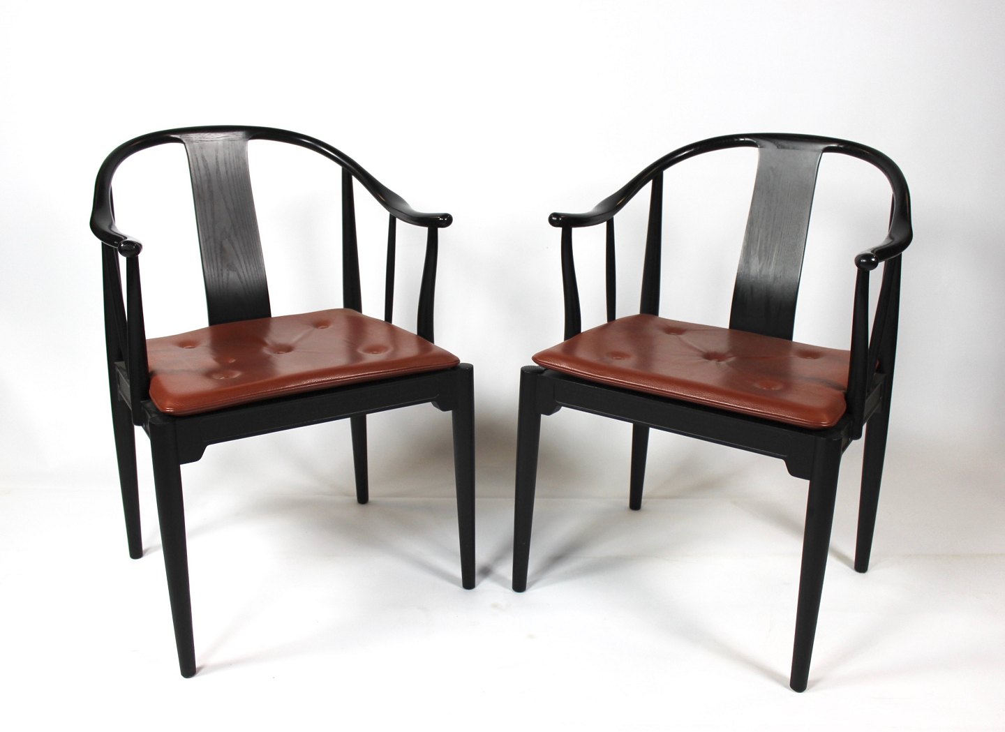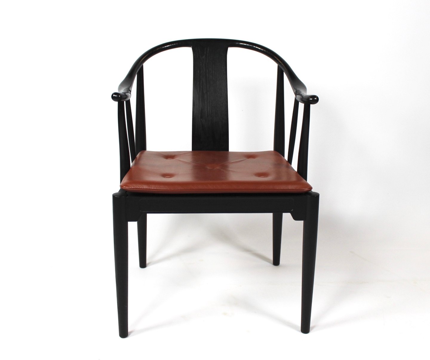 SoldA pair of China chairs of black colored ash and with cushions of cognac colored leather designed by Hans J. Wegner in 1944 and manufactured by Fritz Hansen in 2013. The chairs are in great used condition. Will be sold seperately.
