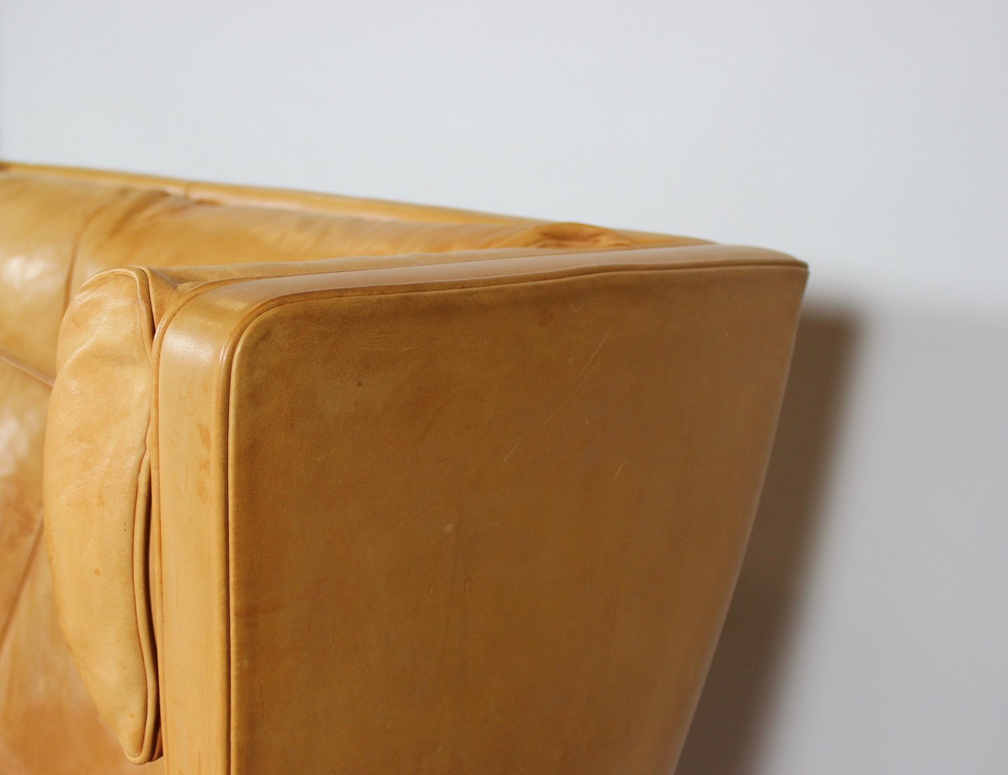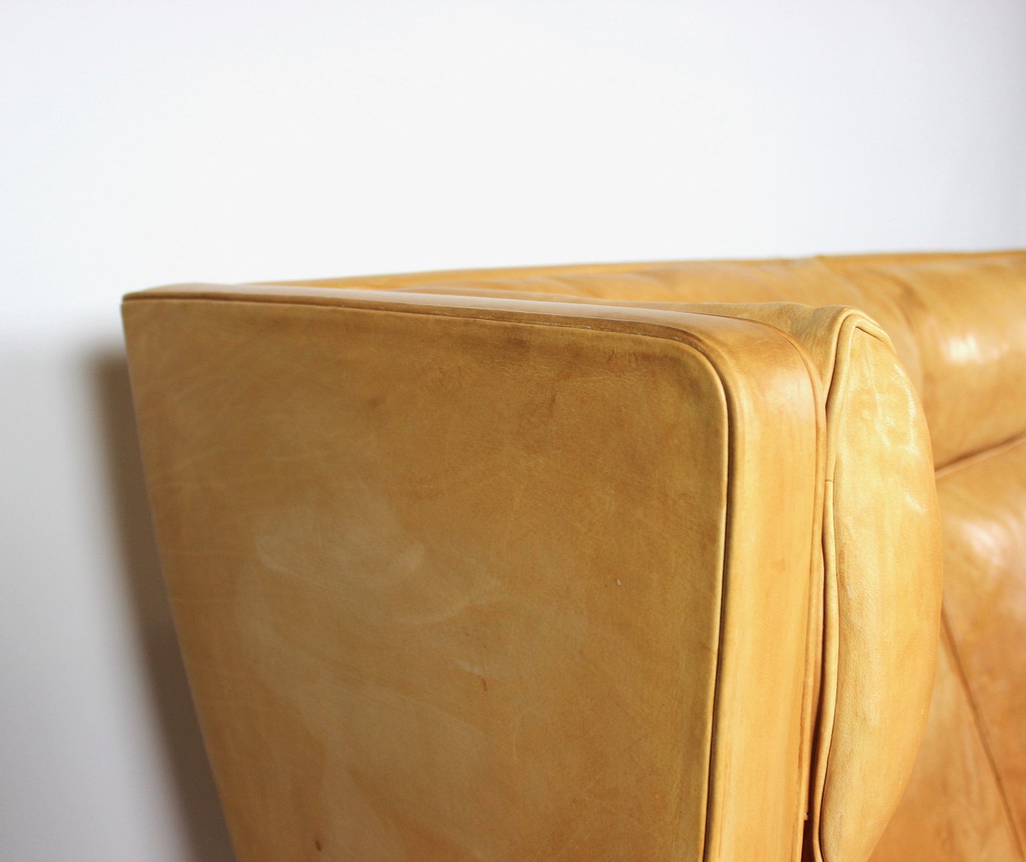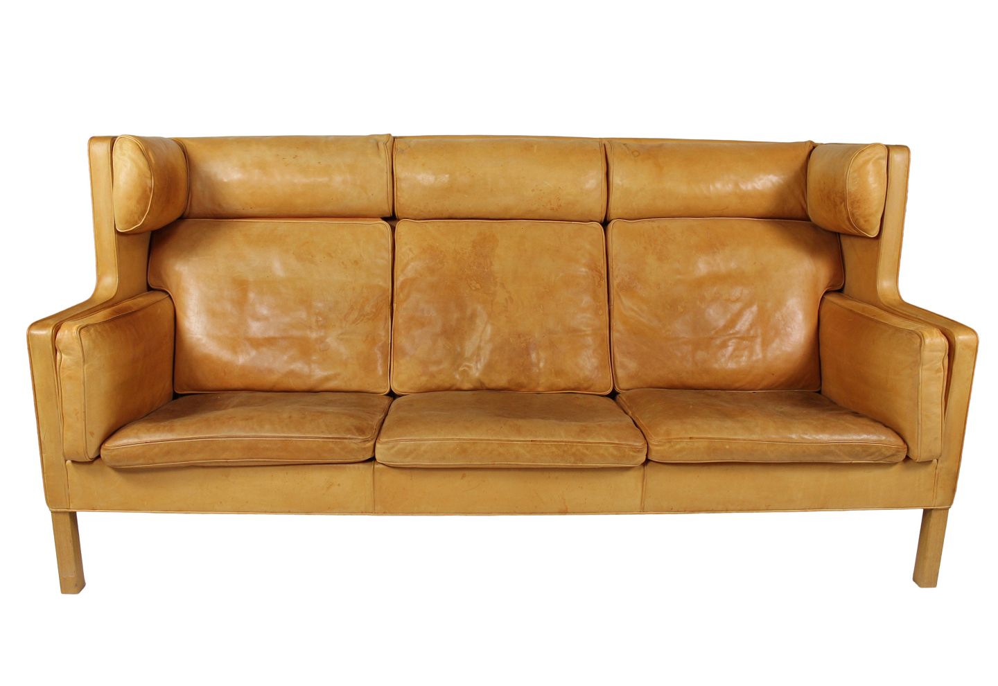 SoldThree seater sofa, model Kupe, designed by Børge Mogensen and upholstered with light cognac colored leather. The sofa is in great vintage condition.