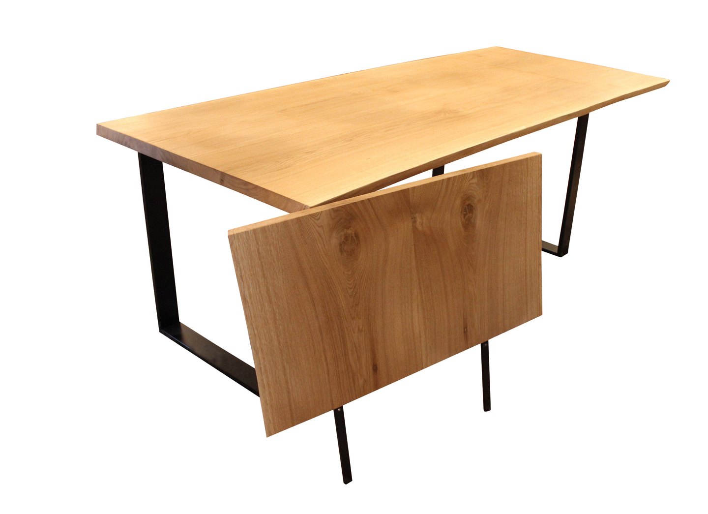 Plank table of oak and black metal frame, made of two planks with natural edges. The table is of our own design and newly manufactured with two extensions (50 cm each).