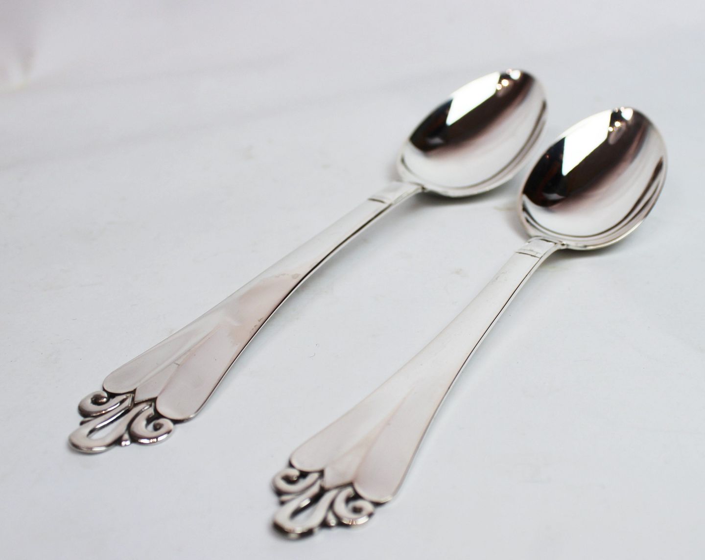 Middagsske og dessertske i H.C. Andersen mønster, tretårnet sølv. Spørg for antal på lager.
