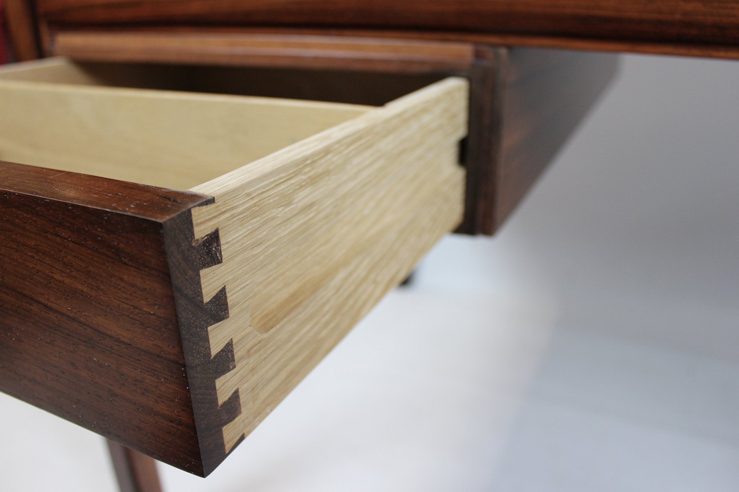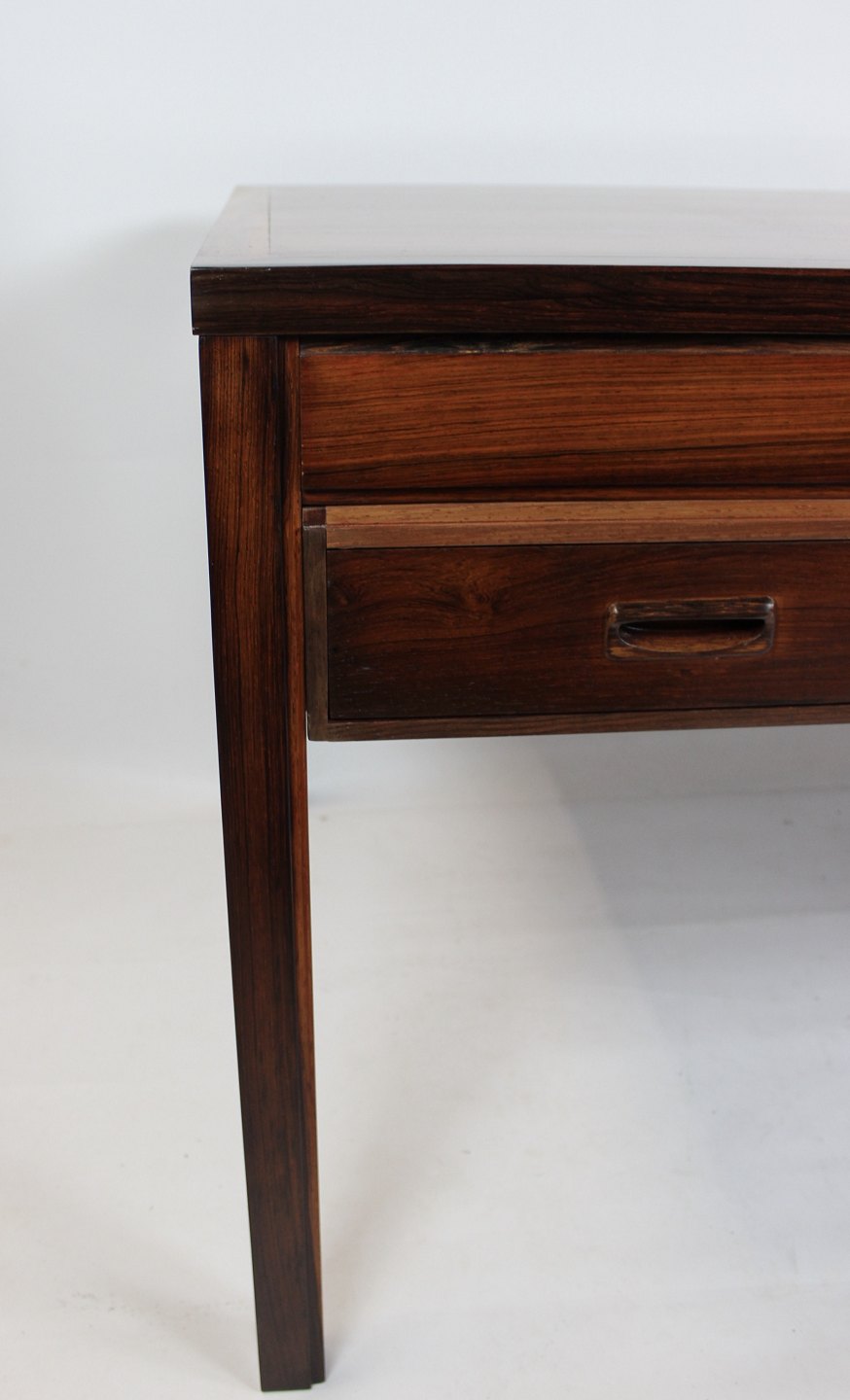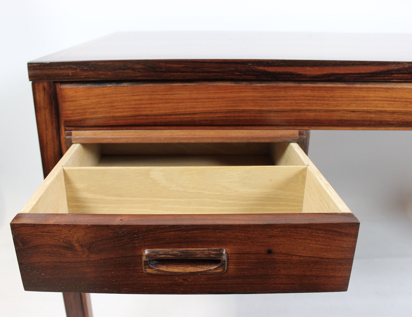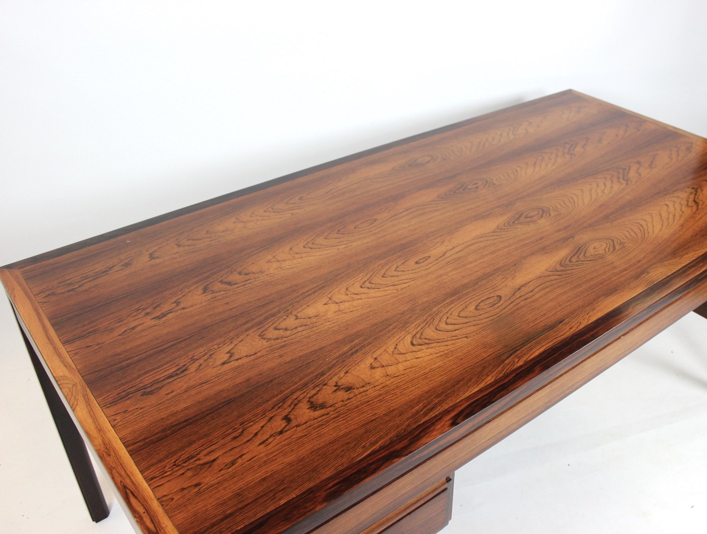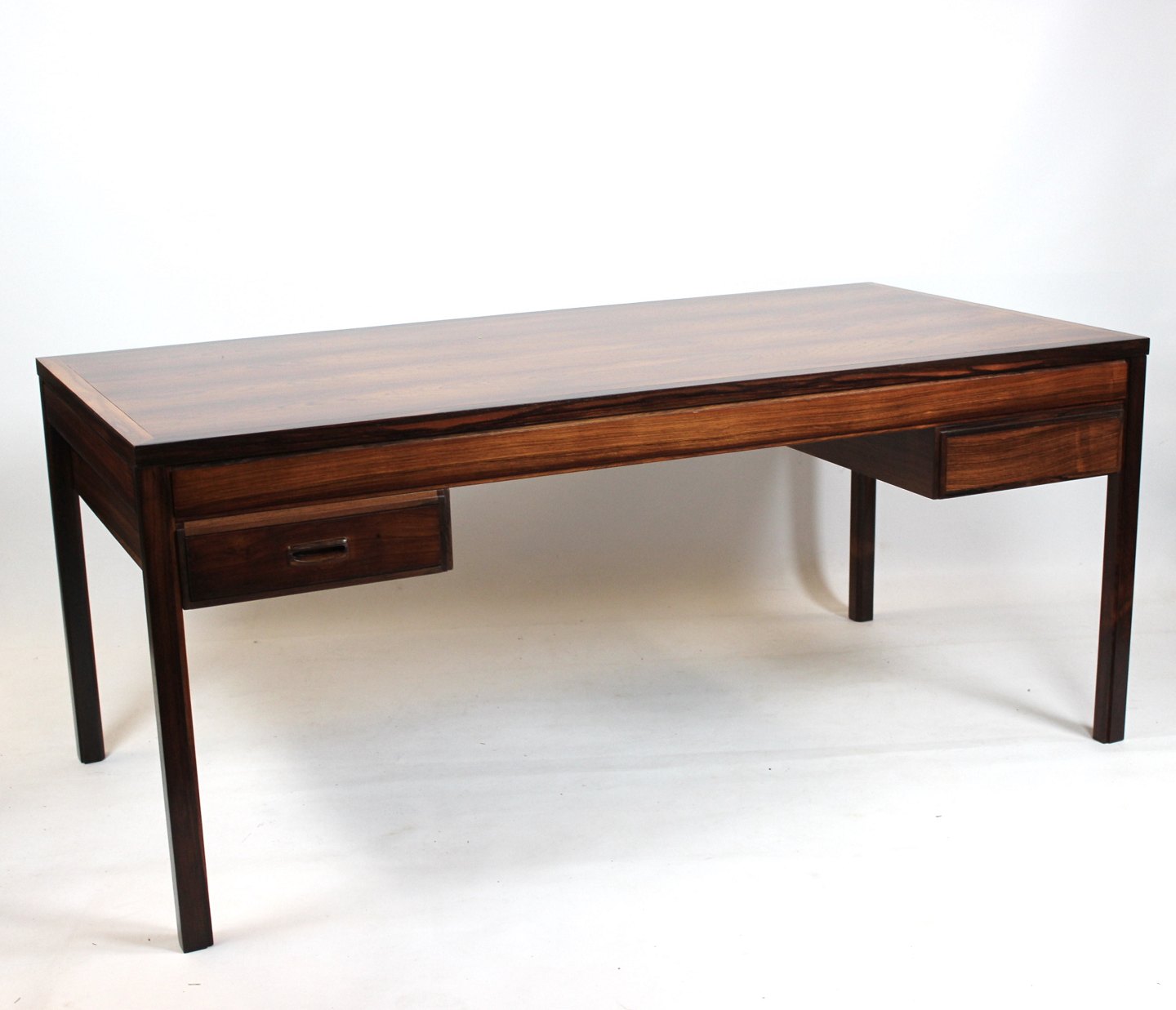 SolgtStort skrivebord i palisander af dansk design fra 1960erne. Bordet er i flot brugt stand og med skuffe udtræk i begge sider.