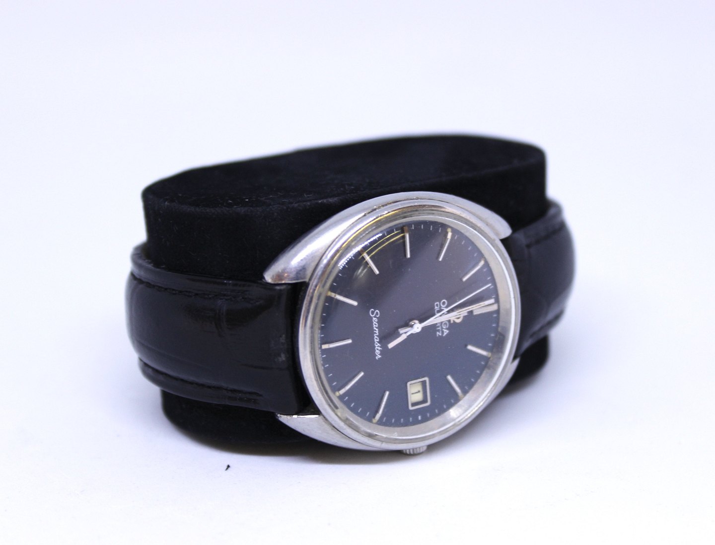 SolgtOmega quartz Seamaster armbåndsur med schweizisk urværk og dato viser. Uret er med sort læderrem og i flot brugt stand.