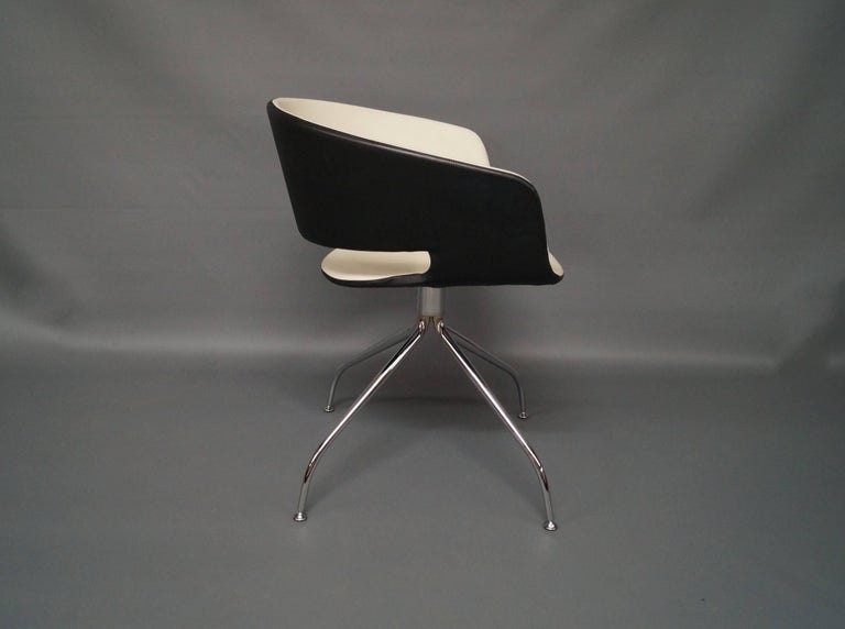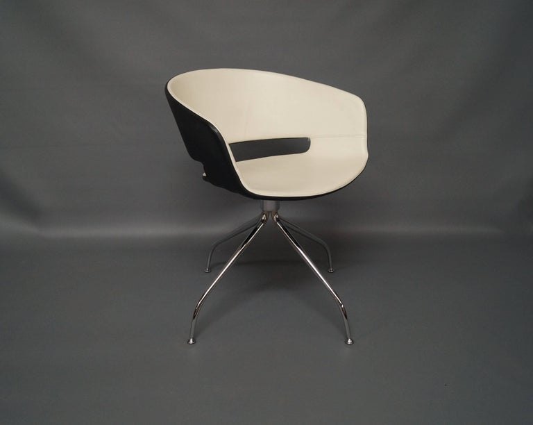 SolgtSpsiestuestole, model RONDA, designet af Andreu World i sort og hvidt læder med drejefunktion. Stolene er i flot brugt stand. Vi har 2 stk. på lager.