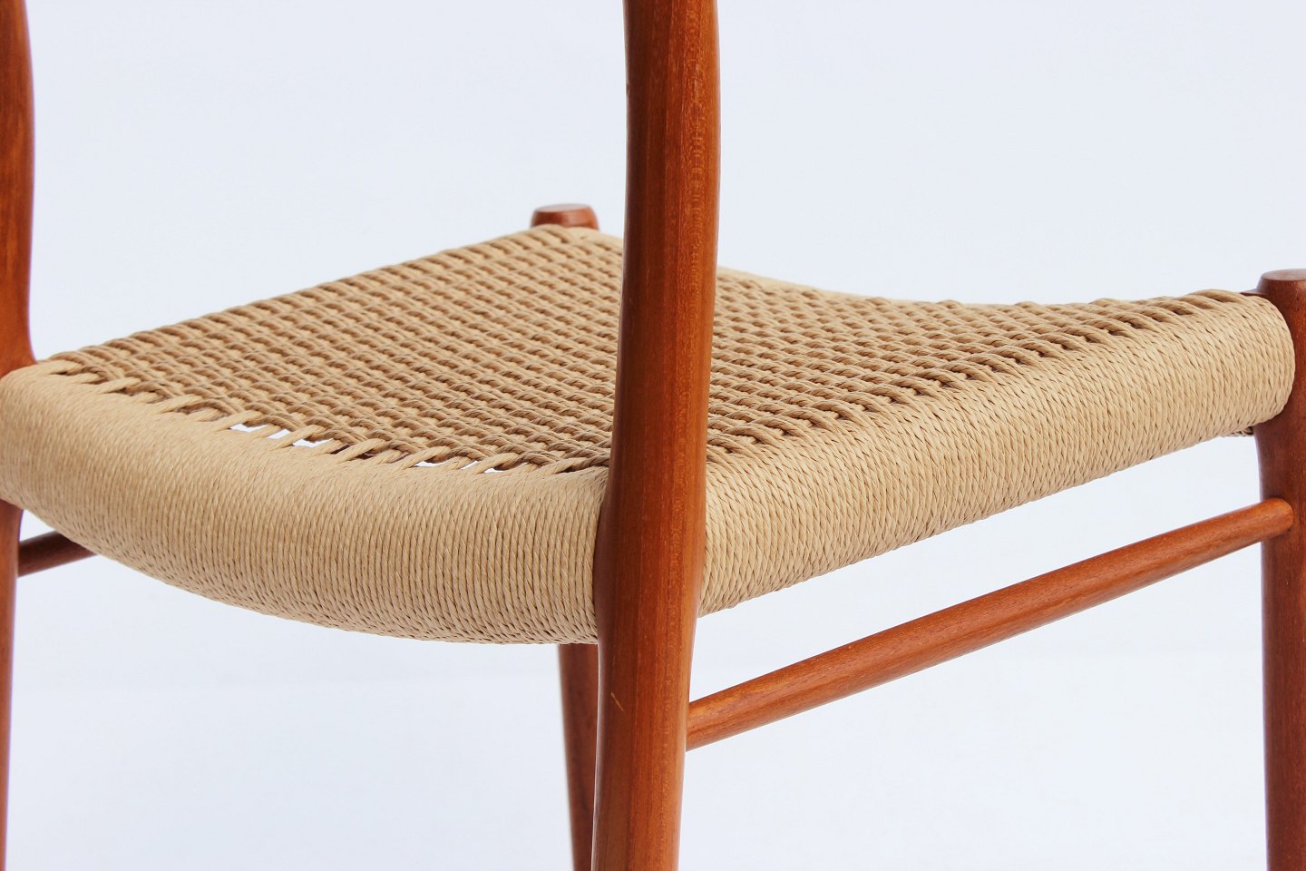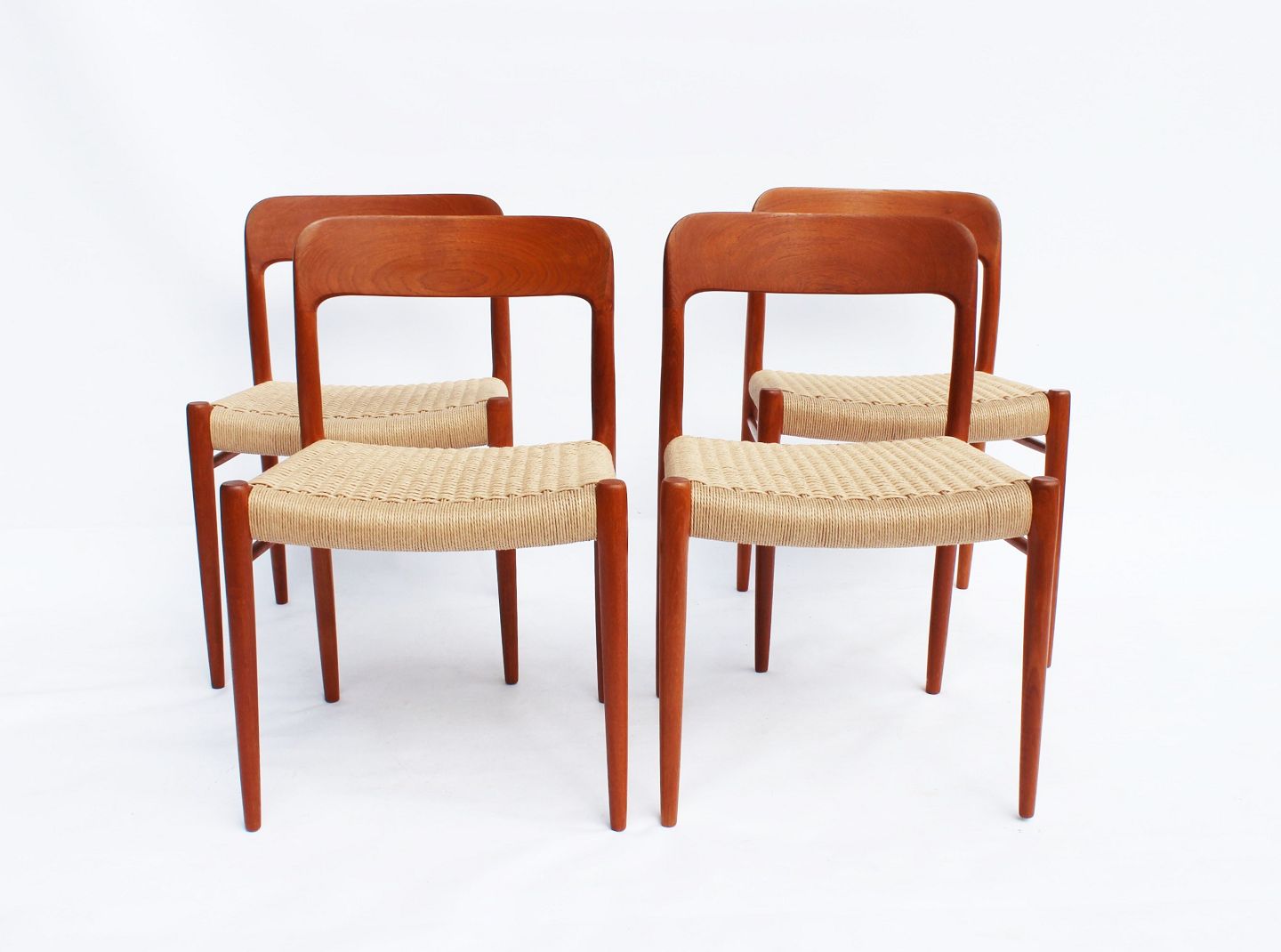 SoldA set of four dining chairs, model 75, in teak and papercord designed by N.O. Møller from the 1960s. The chairs are in great vintage condition.