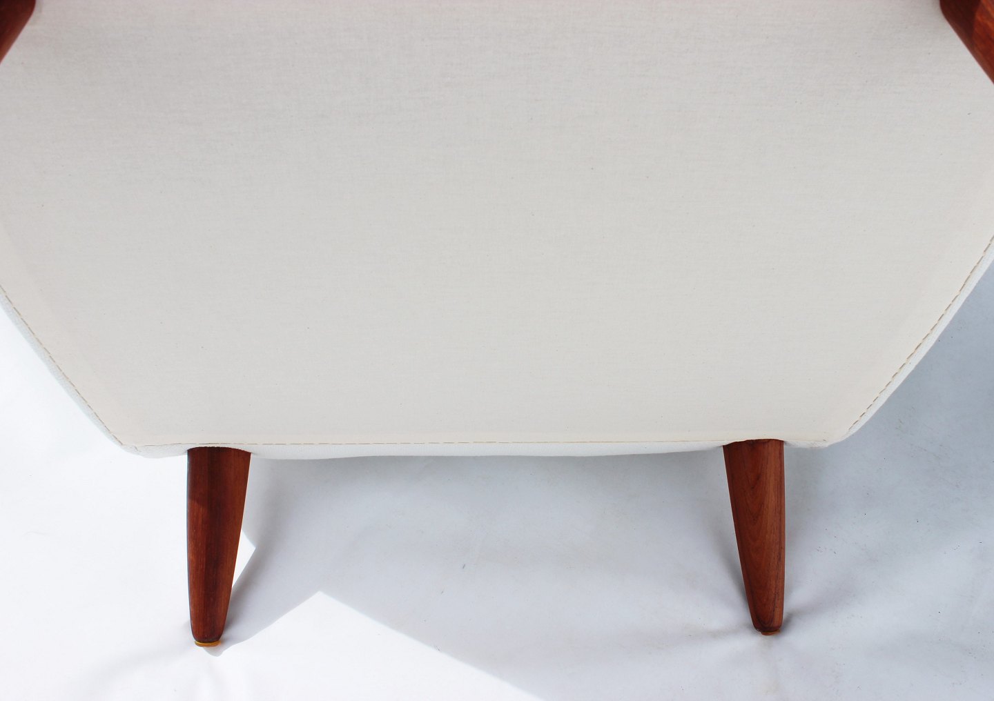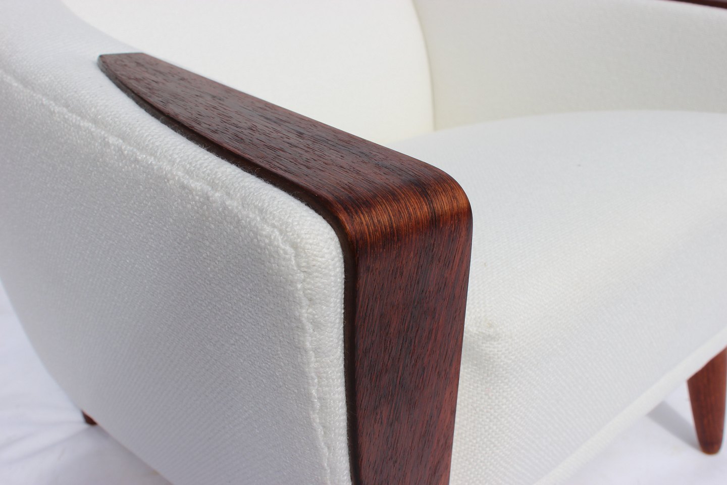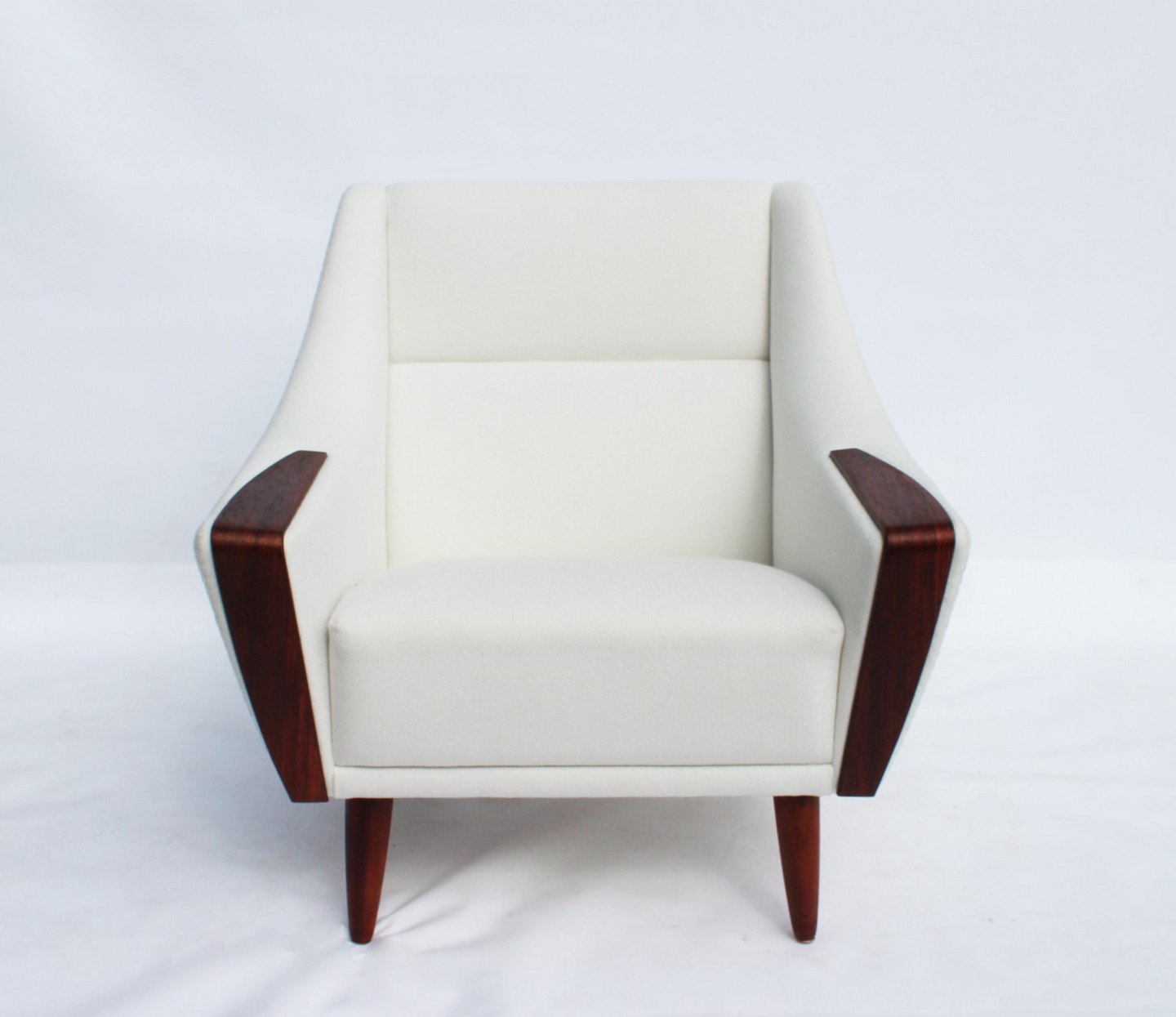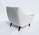 Kontakt os vedrørende prisLænestolen med lav ryg, betrukket med et elegant hvidt stof og hvilende på smukt polerede palisanderben, er et mesterværk af dansk design fra 1960'erne. Dens rene linjer og organiske form afspejler den tidstypiske æstetik inden for skandinavisk møbeldesign.