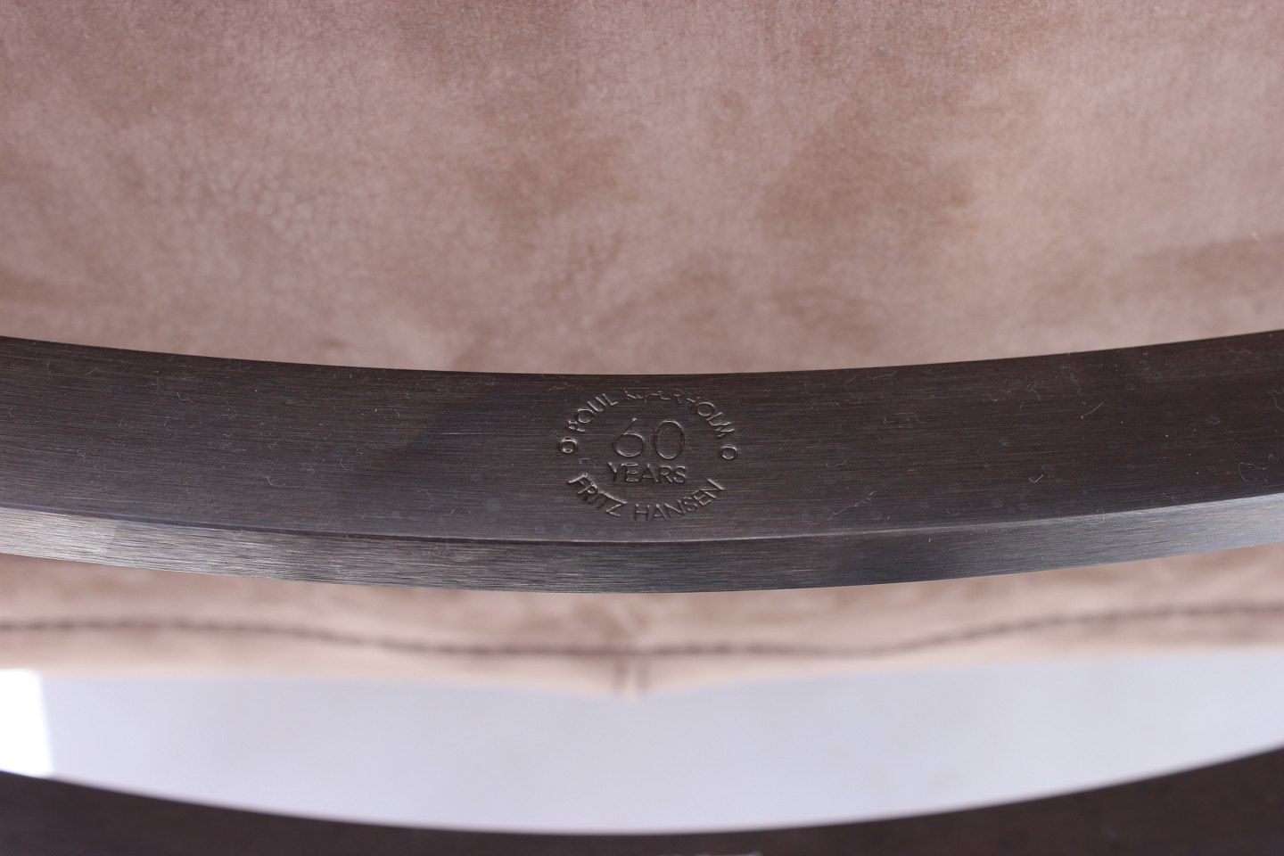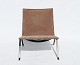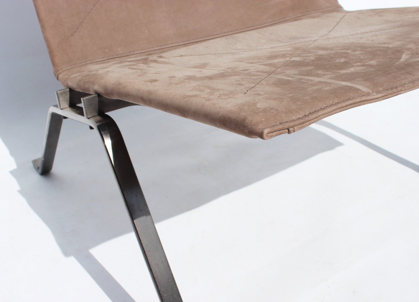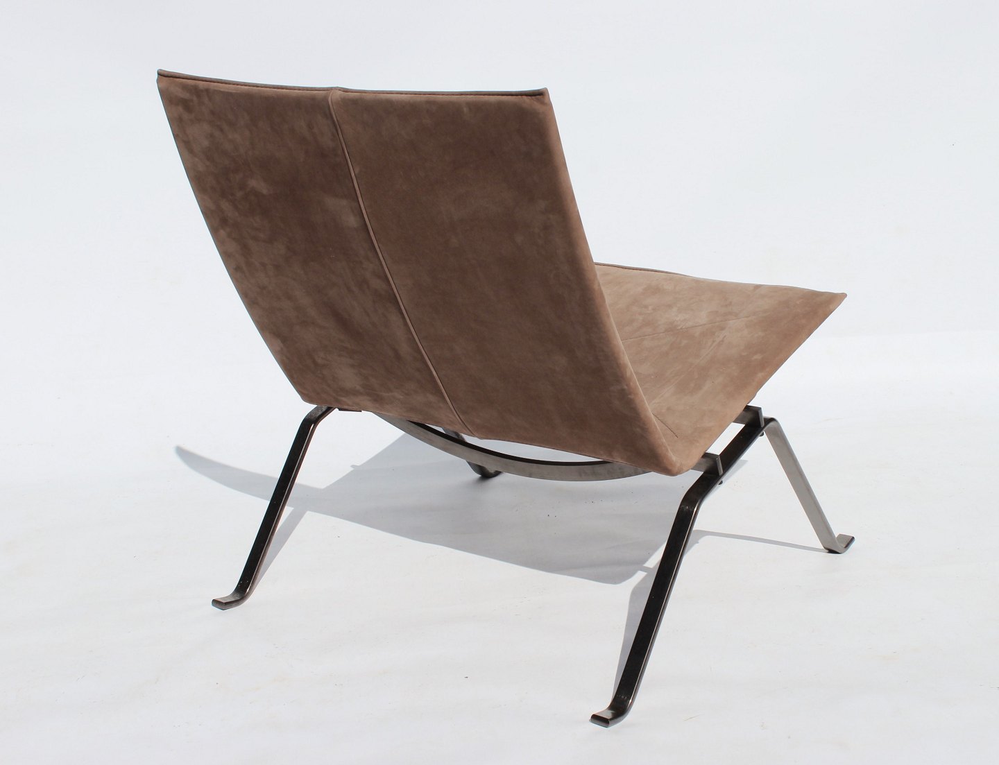 SolgtHvilestol, model PK22, af ruskind designet af Poul Kjærholm i 1955 og fremstillet hos Fritz Hansen i 2016 i forbindelse med 60 års jubilæum. Stolen er med original polstring og stel af krom.