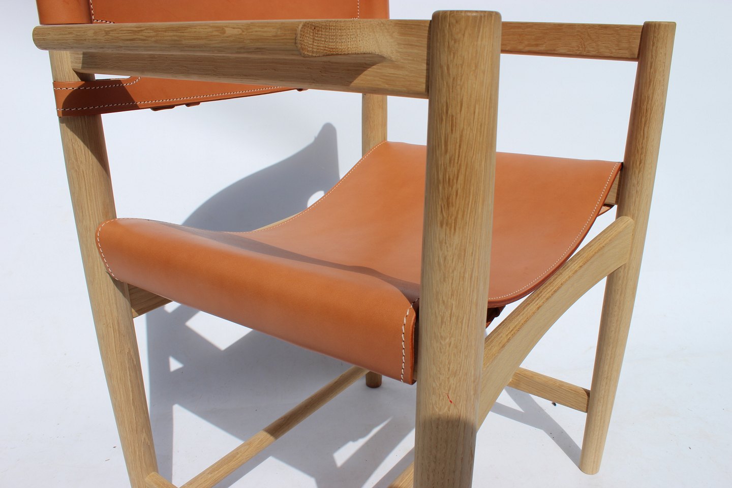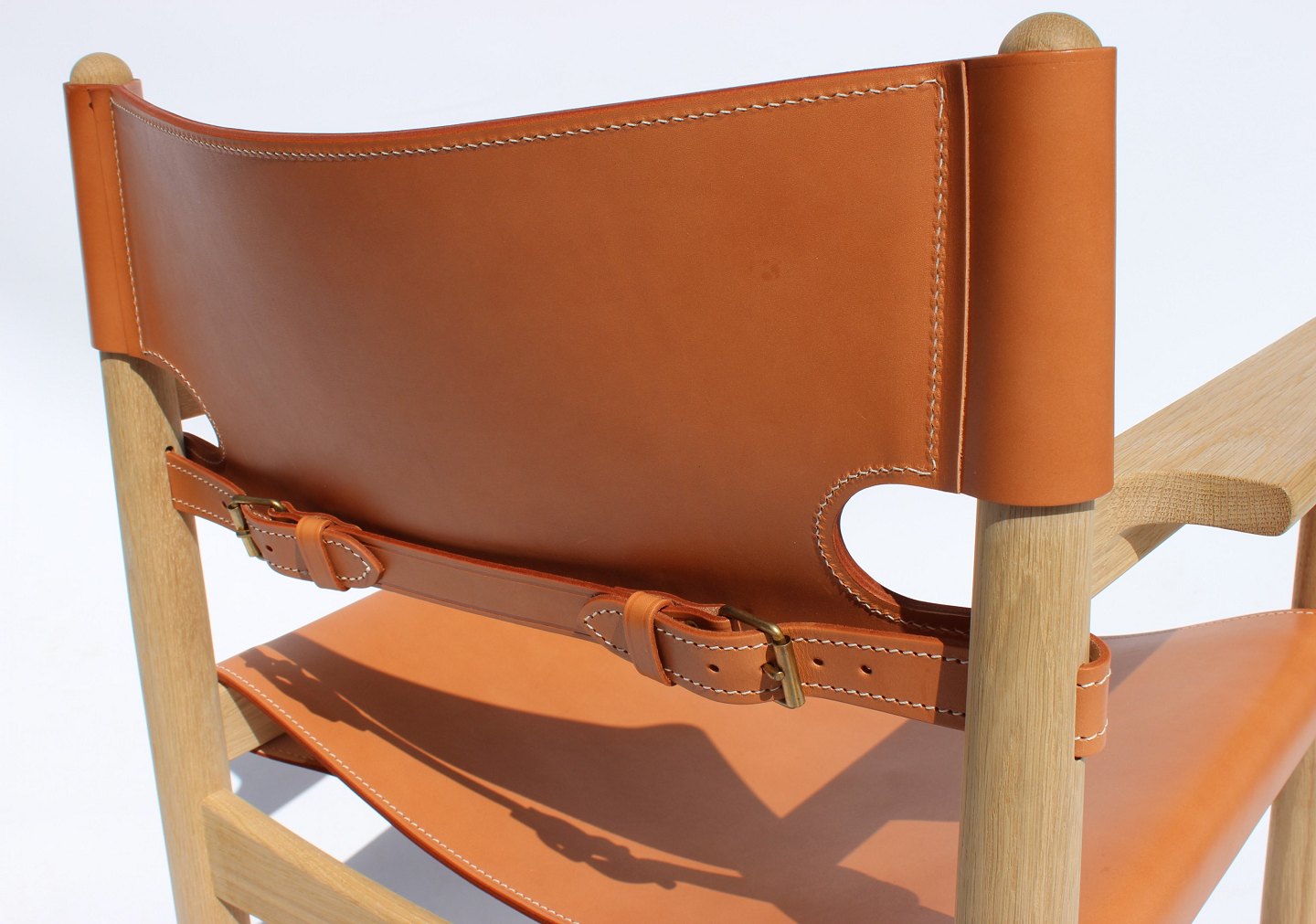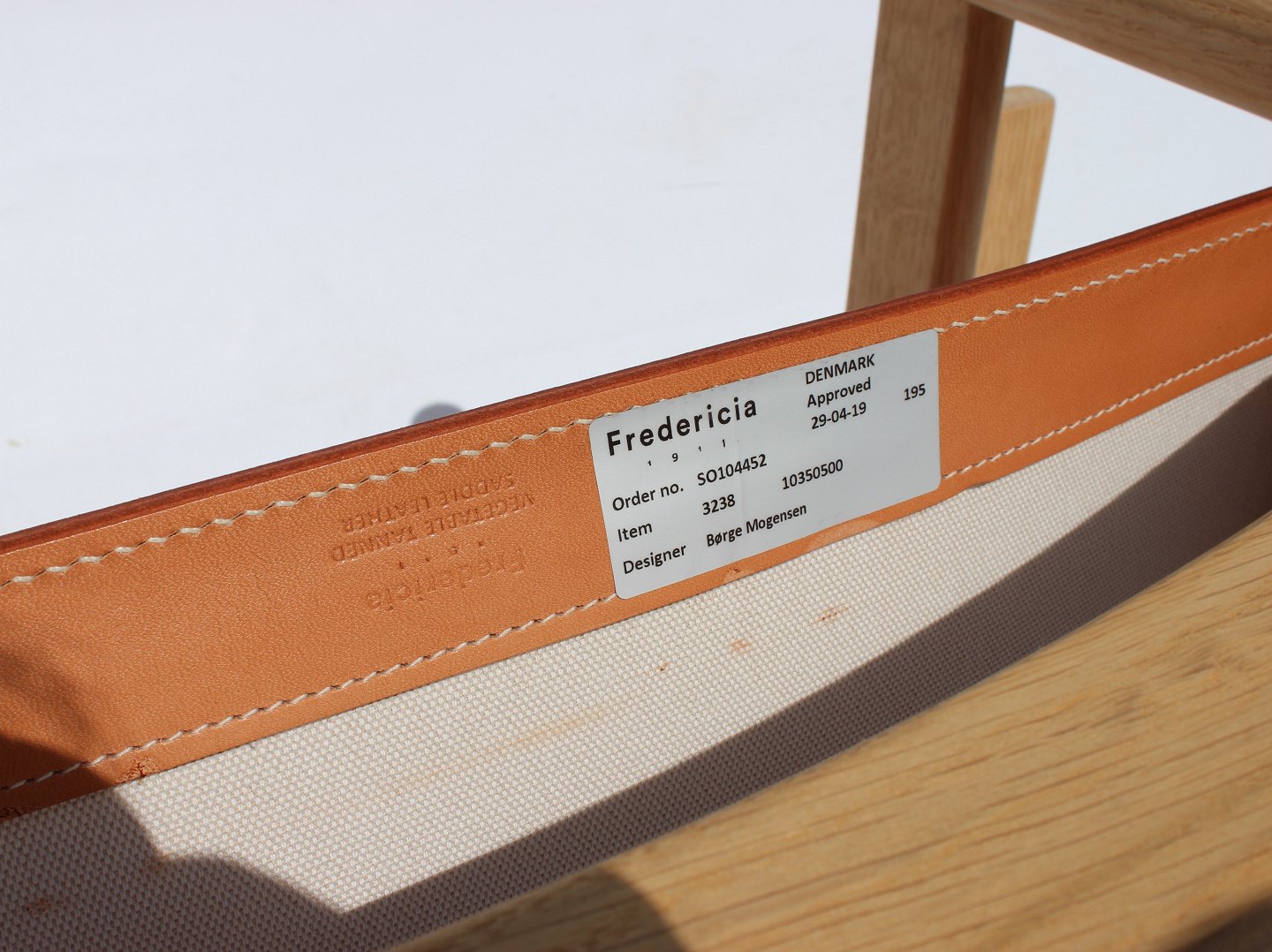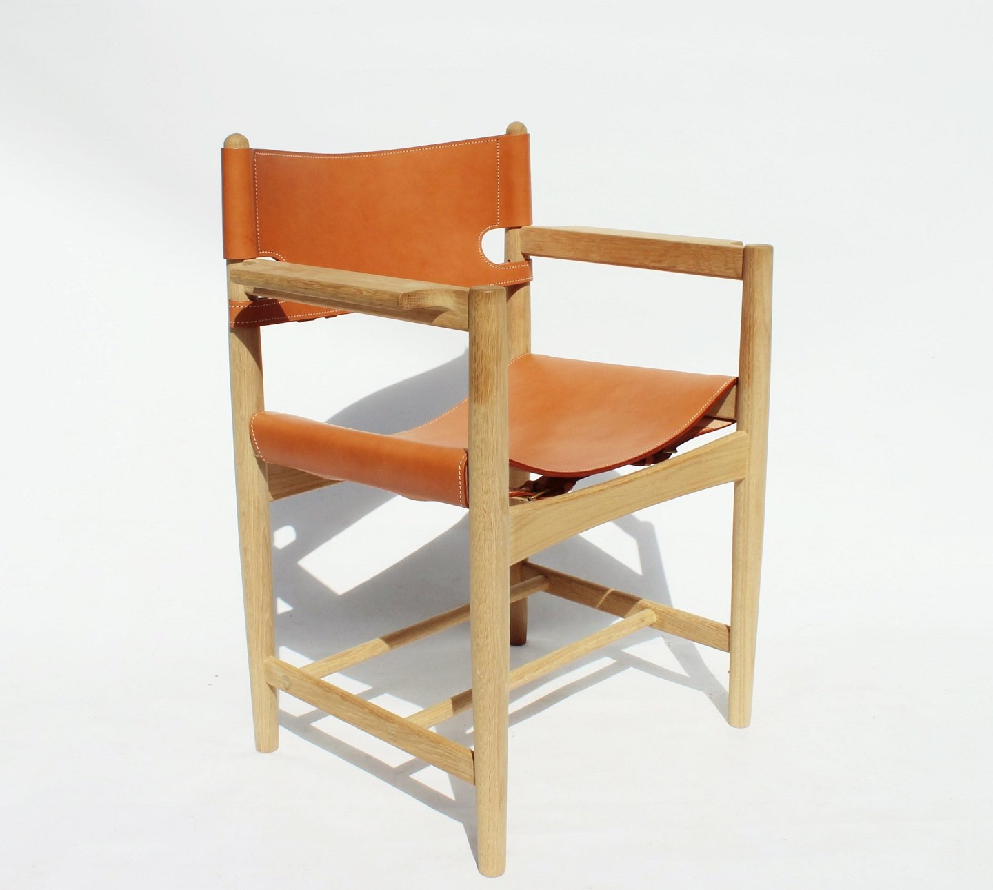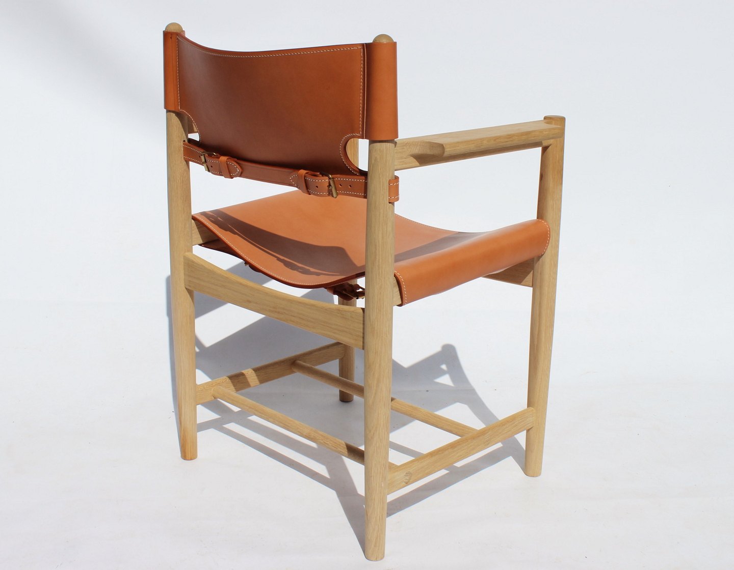 SoldThe Spanish dining chair with armrests, model 3238, designed by Børge Mogensen and manufactured by Fredericia Furniture in 2019. The chair is of oak and cognac leather.