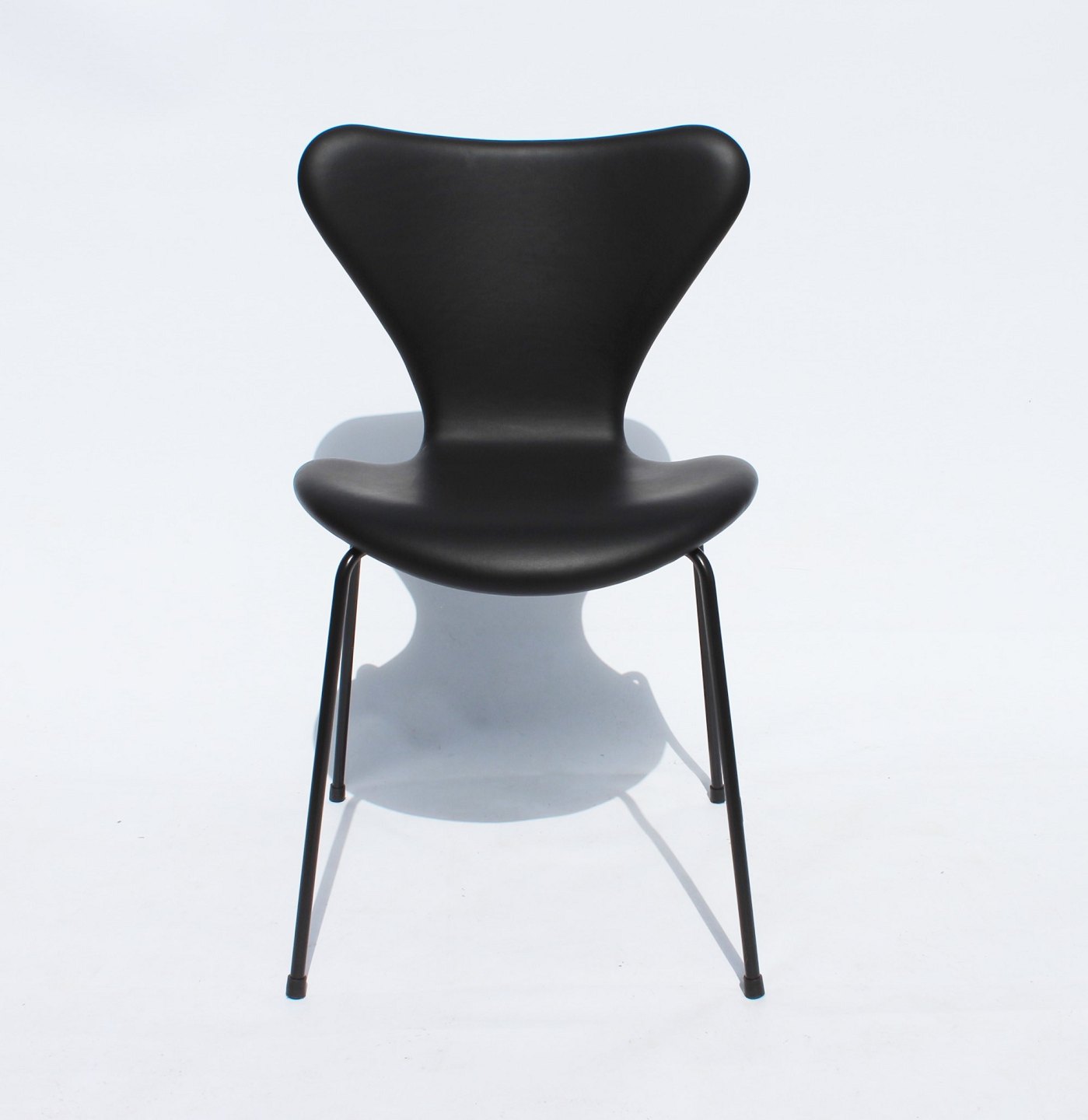 The chairs were created in 2016 as a special model that incorporates the classic elegance and timeless design elements that Arne Jacobsen is known for. The black leather upholstery adds a sophisticated atmosphere to the seat, while the black frame gives a modern and stylish look.