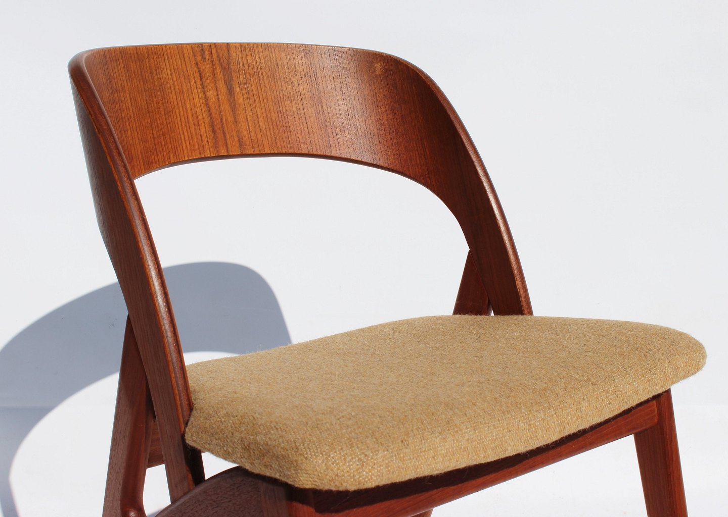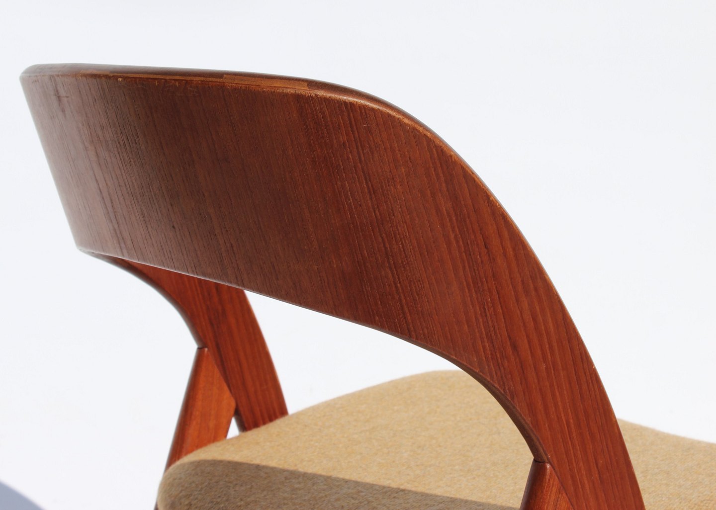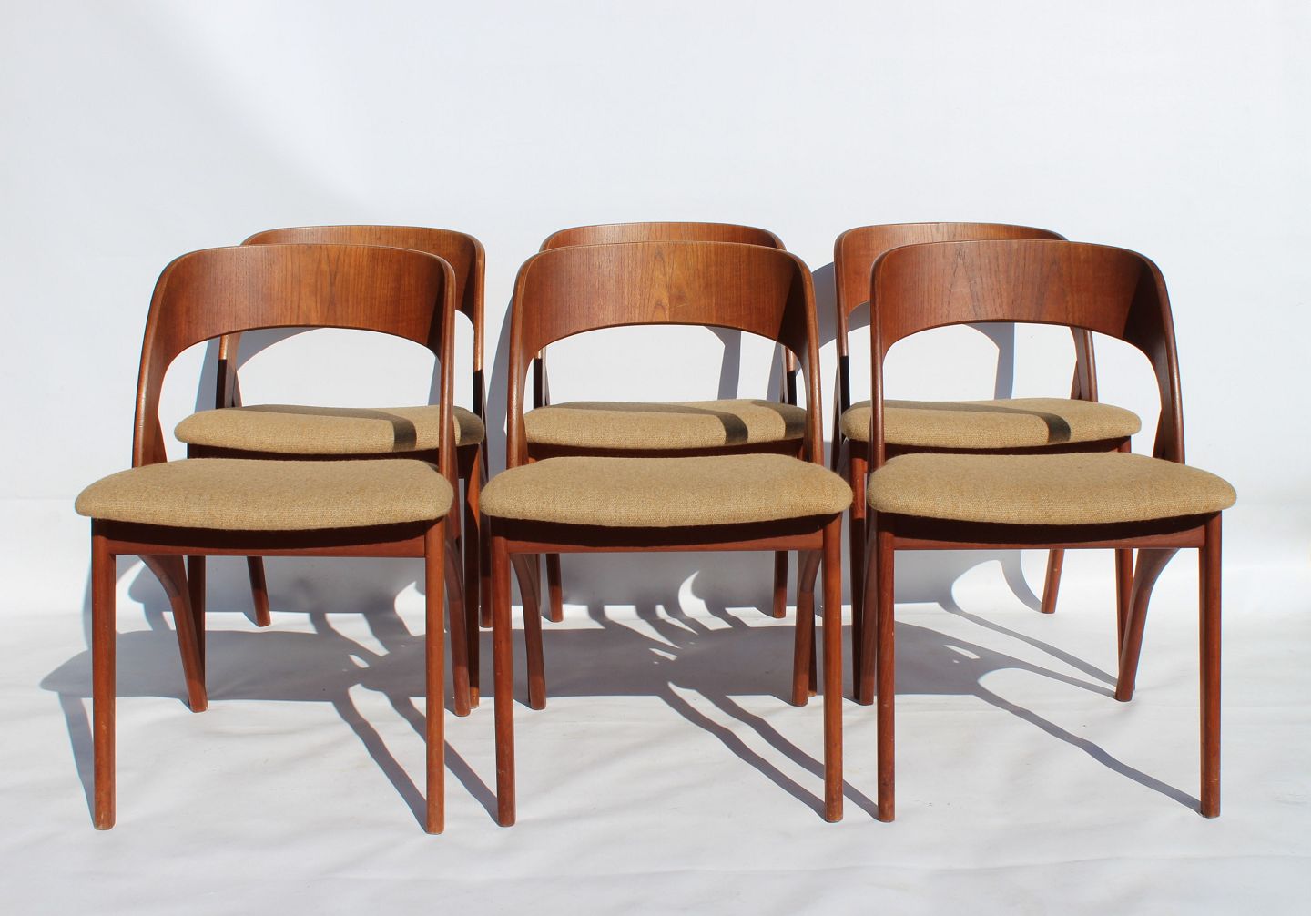 Et sæt af seks spisestuestole i teak og lyst stof af dansk design fra 1960erne. Stolene er i flot brugt stand.