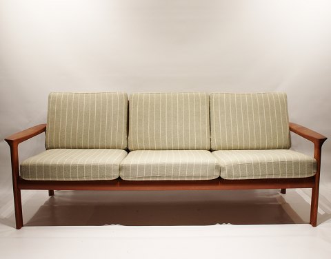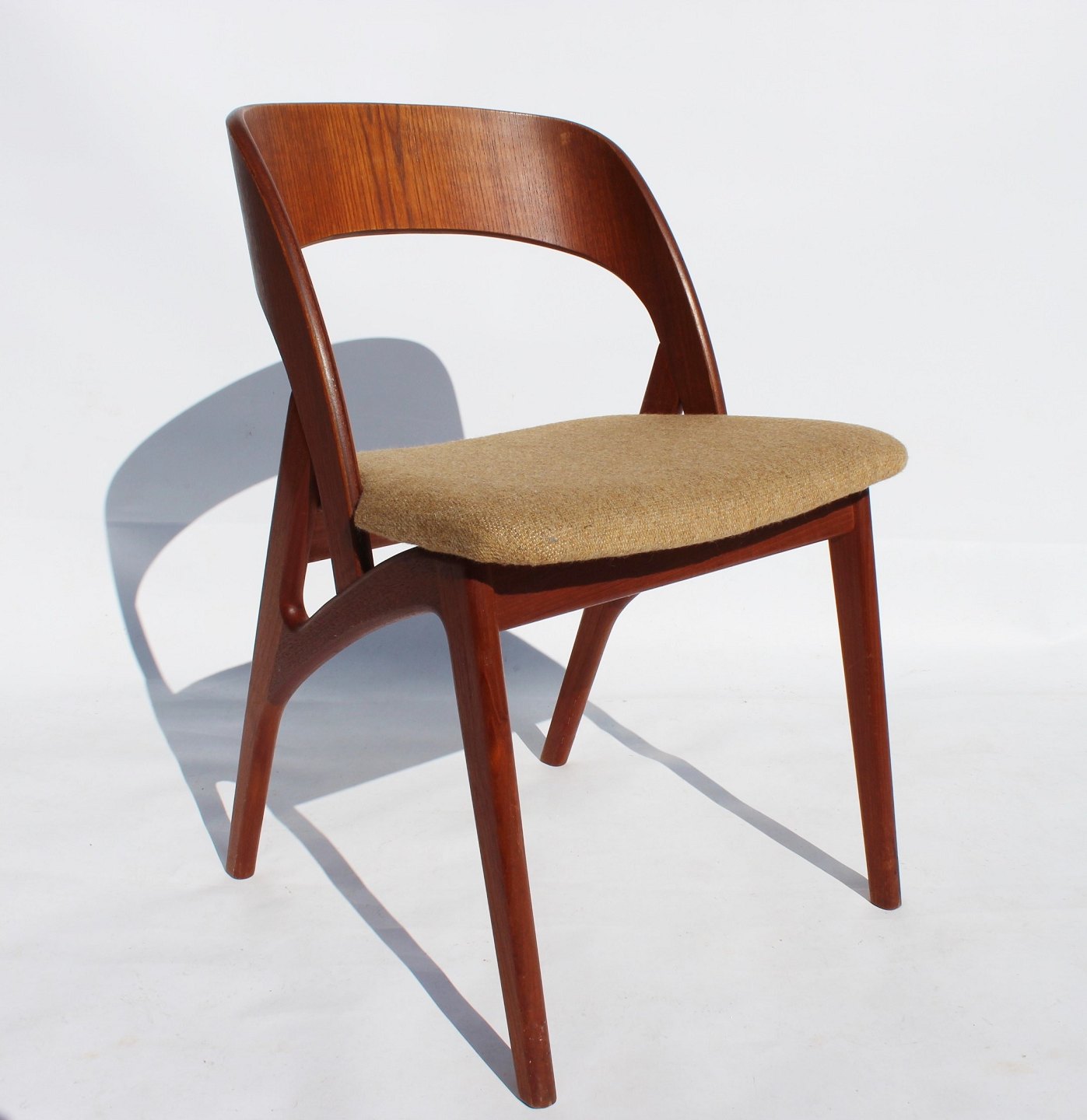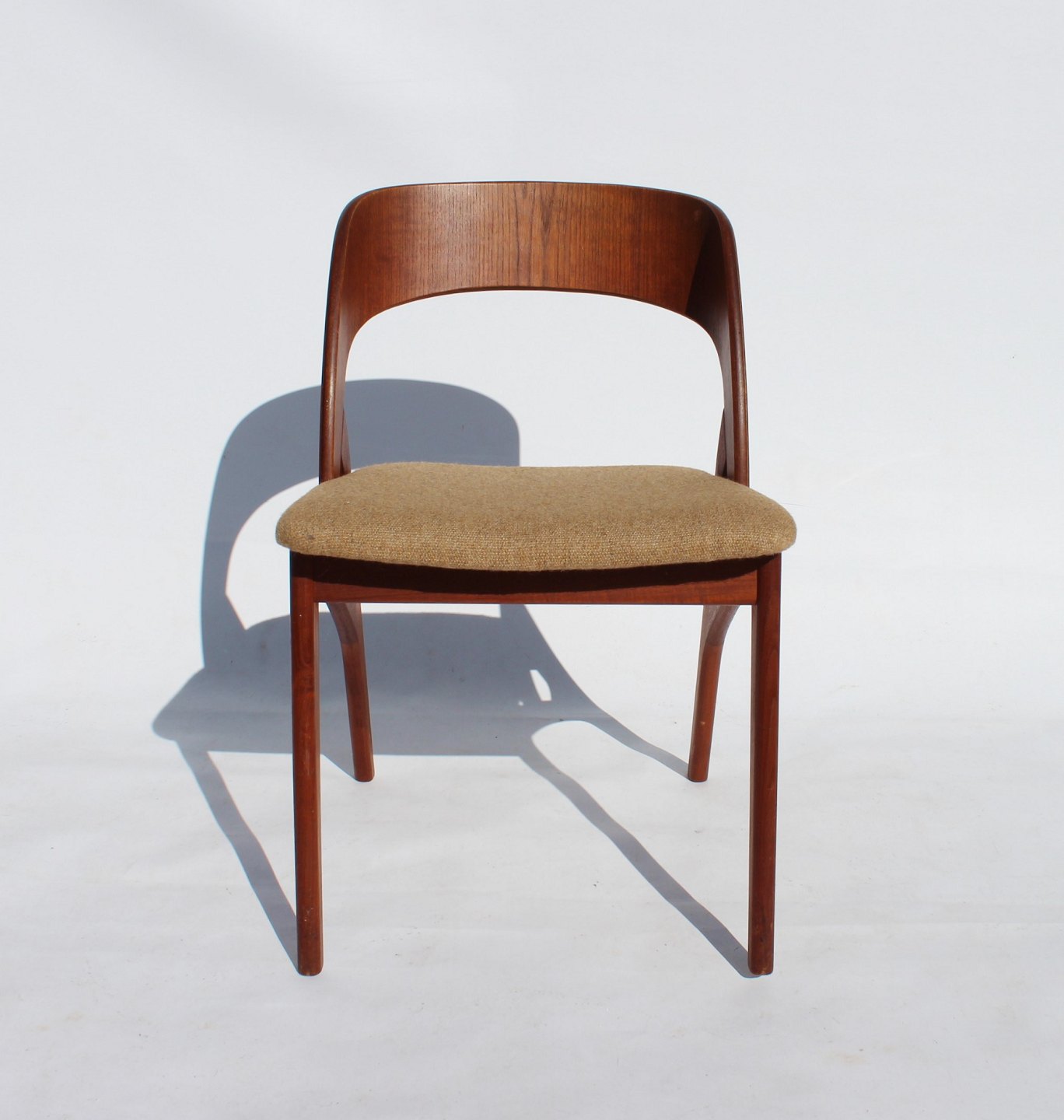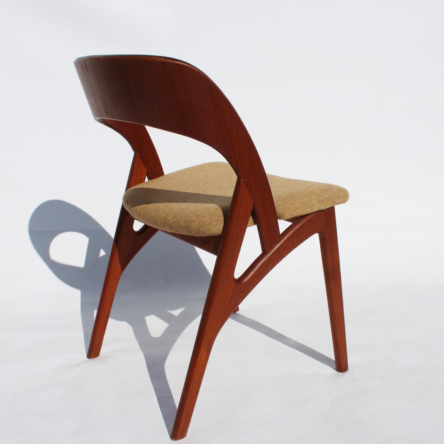 Et sæt af seks spisestuestole i teak og lyst stof af dansk design fra 1960erne. Stolene er i flot brugt stand.