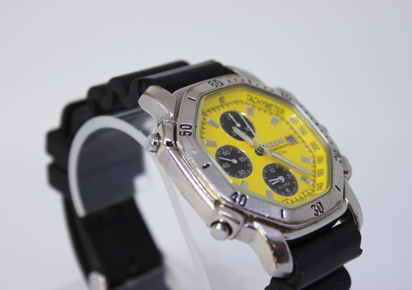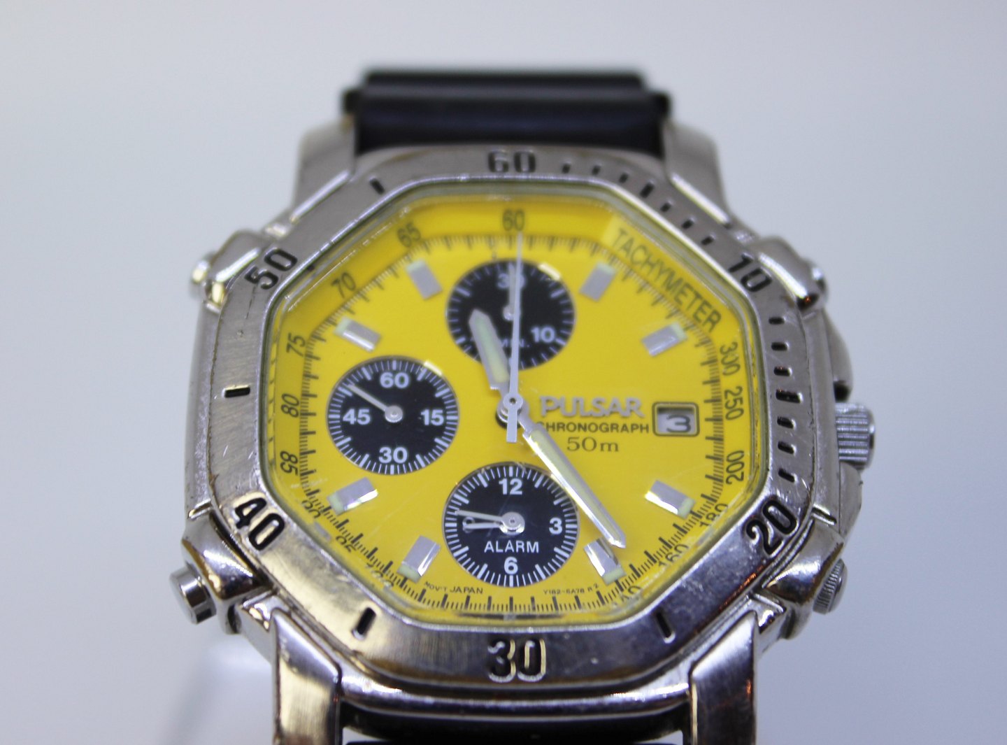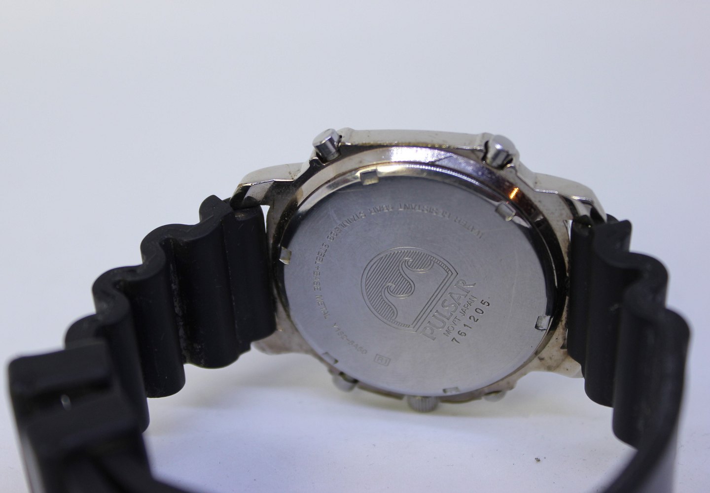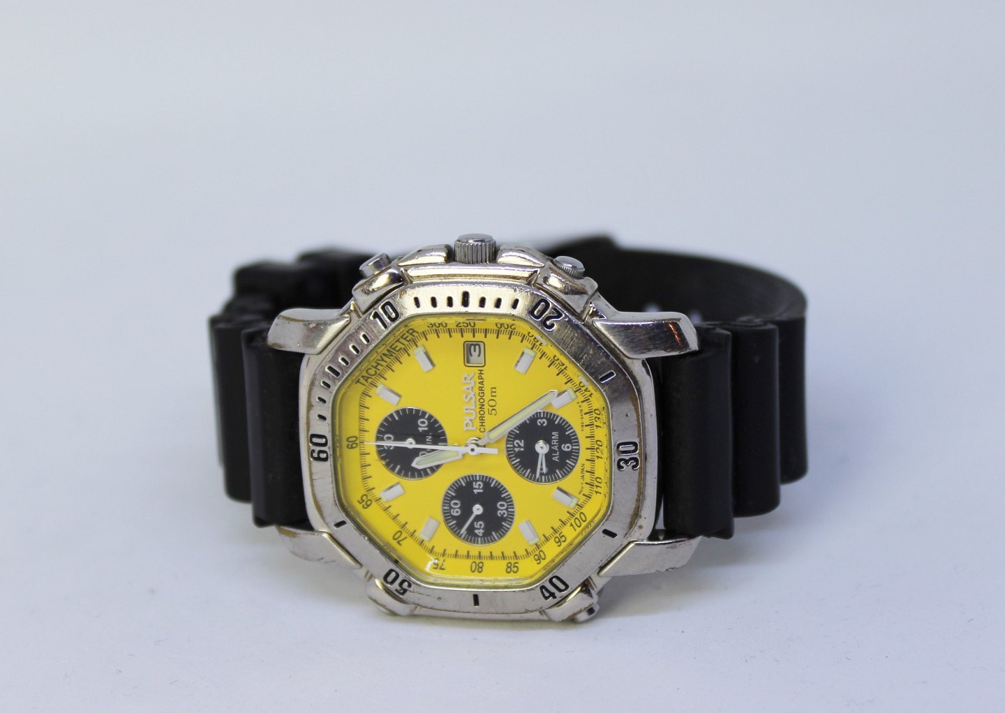 SoldPulsar quartz men's watch with chronograph, alarm and strap of black rubber. The watch is of stainless steel water resistant 5BAR.